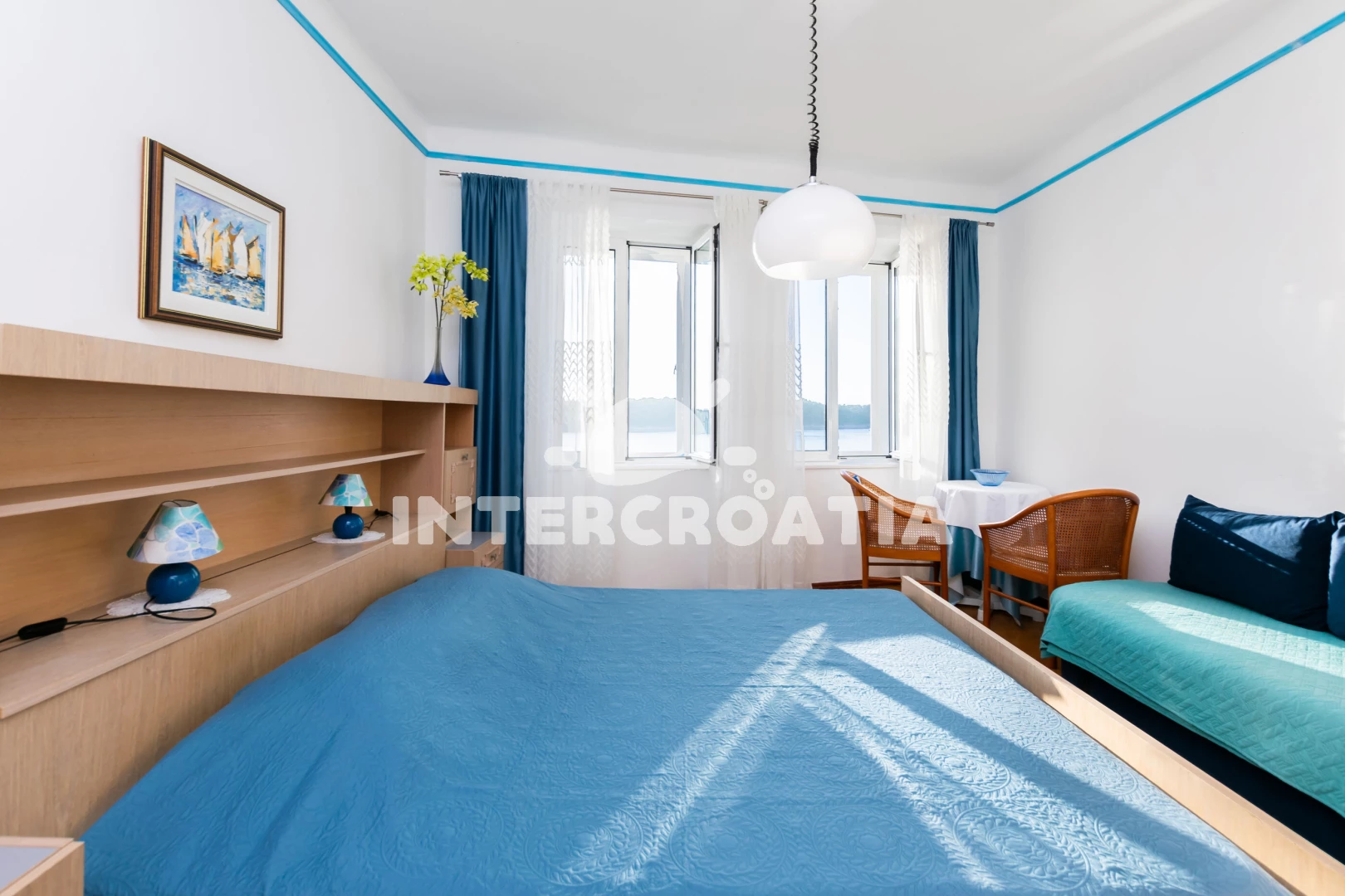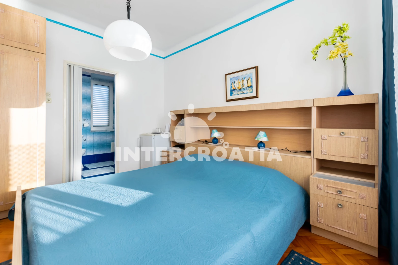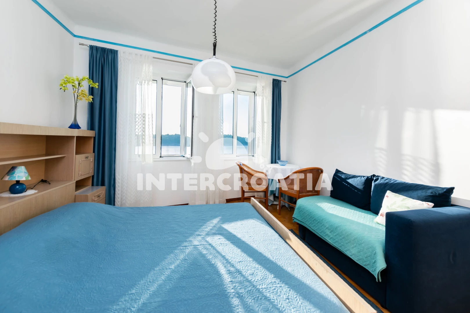Apartmánový pokoj (20 m2) s výhledem na moře. Nachází se v 1. patře objektu. mini lednicí. K dispozici dvoulůžko, televize, žehlička. Koupelna s WC. Hostům je k dispozici parkování u objektu zdarma.