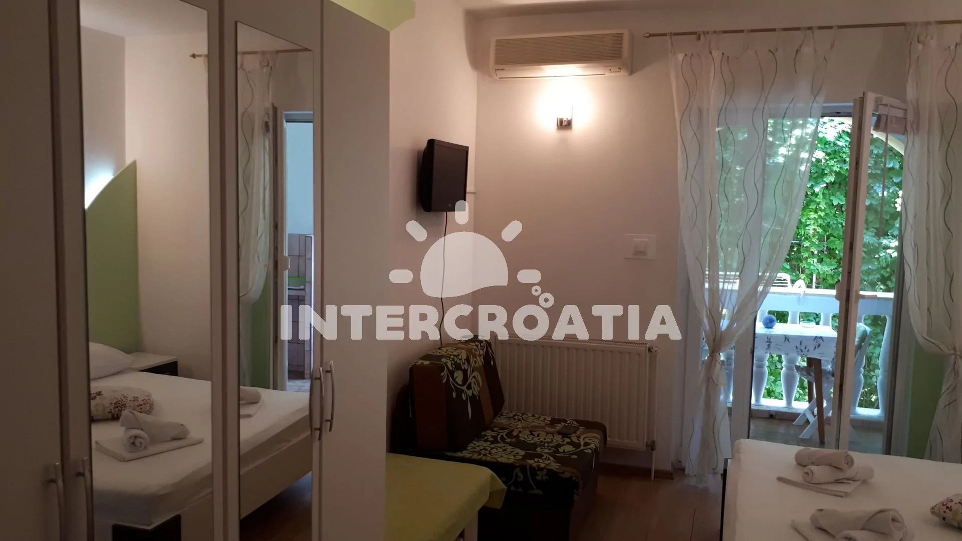Apartmánový pokoj (25 m2) s balkonem a venkovním posezením se nachází v 1. patře domu. Pokoj je vhodný pro 2 až 3 osoby. Obývací místnost je vybavena dvoulůžkem, pohovkou (rozložitelná na extra lůžko pro 1 osobu), televizí, klimatizací a vstupem na balkon. Koupelna se sprchovým koutem, umyvadlem a wc. Na balkoně lednice a rychlovarná konvice. Možnost používání zařízené kuchyně v objektu. Hostům je k dispozici parkování u objektu zdarma.