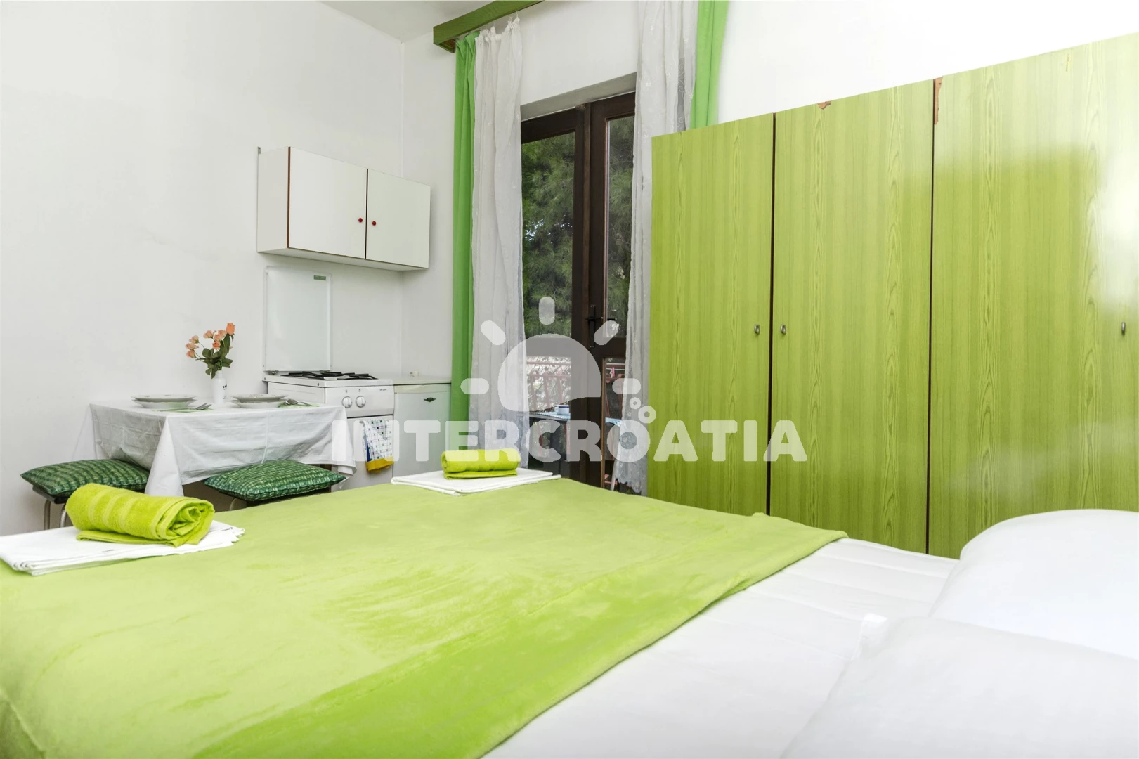 Apartmánový pokoj se nachází od moře a pláže. Pláž je . U objektu je k dispozici společná zahrada s posezením a grilem.