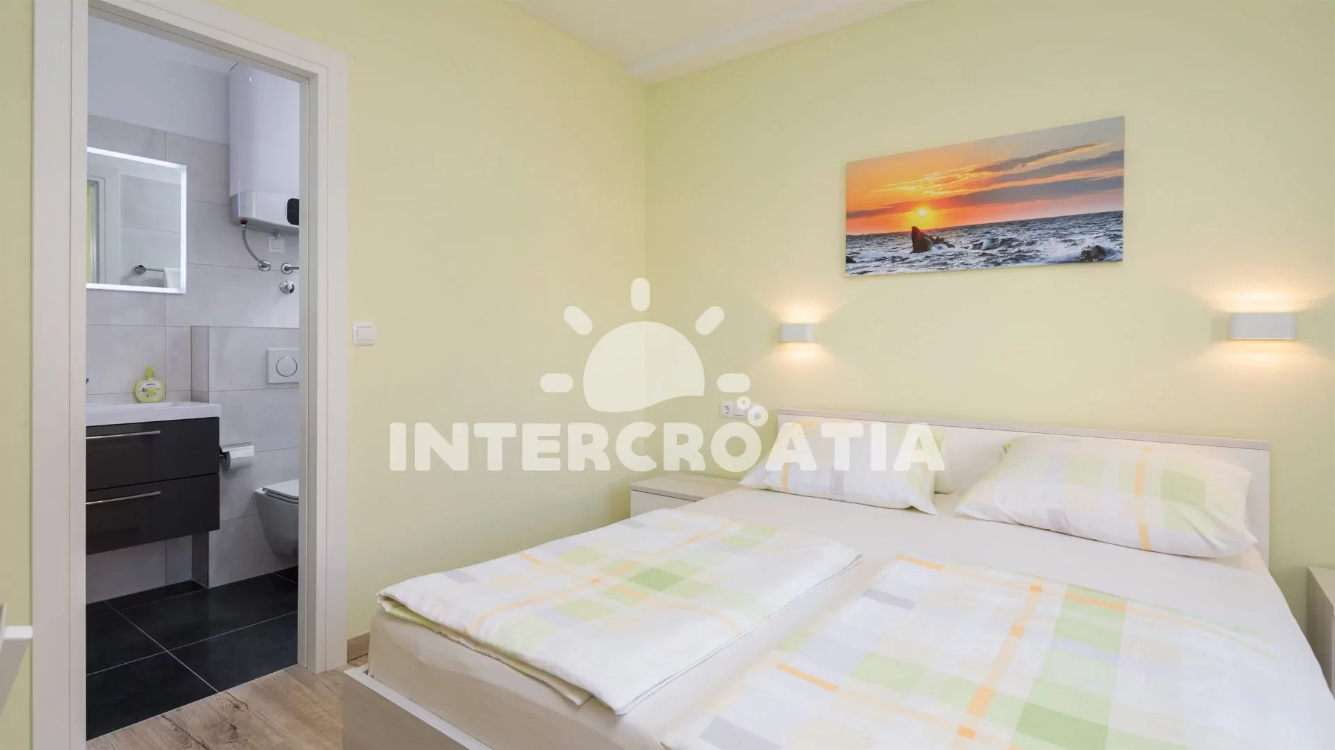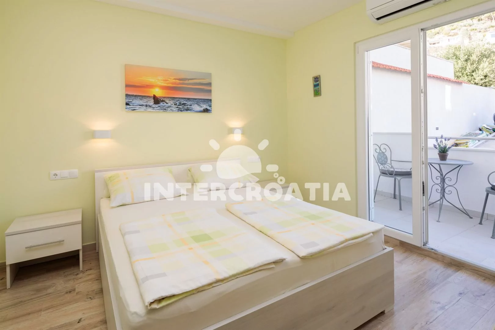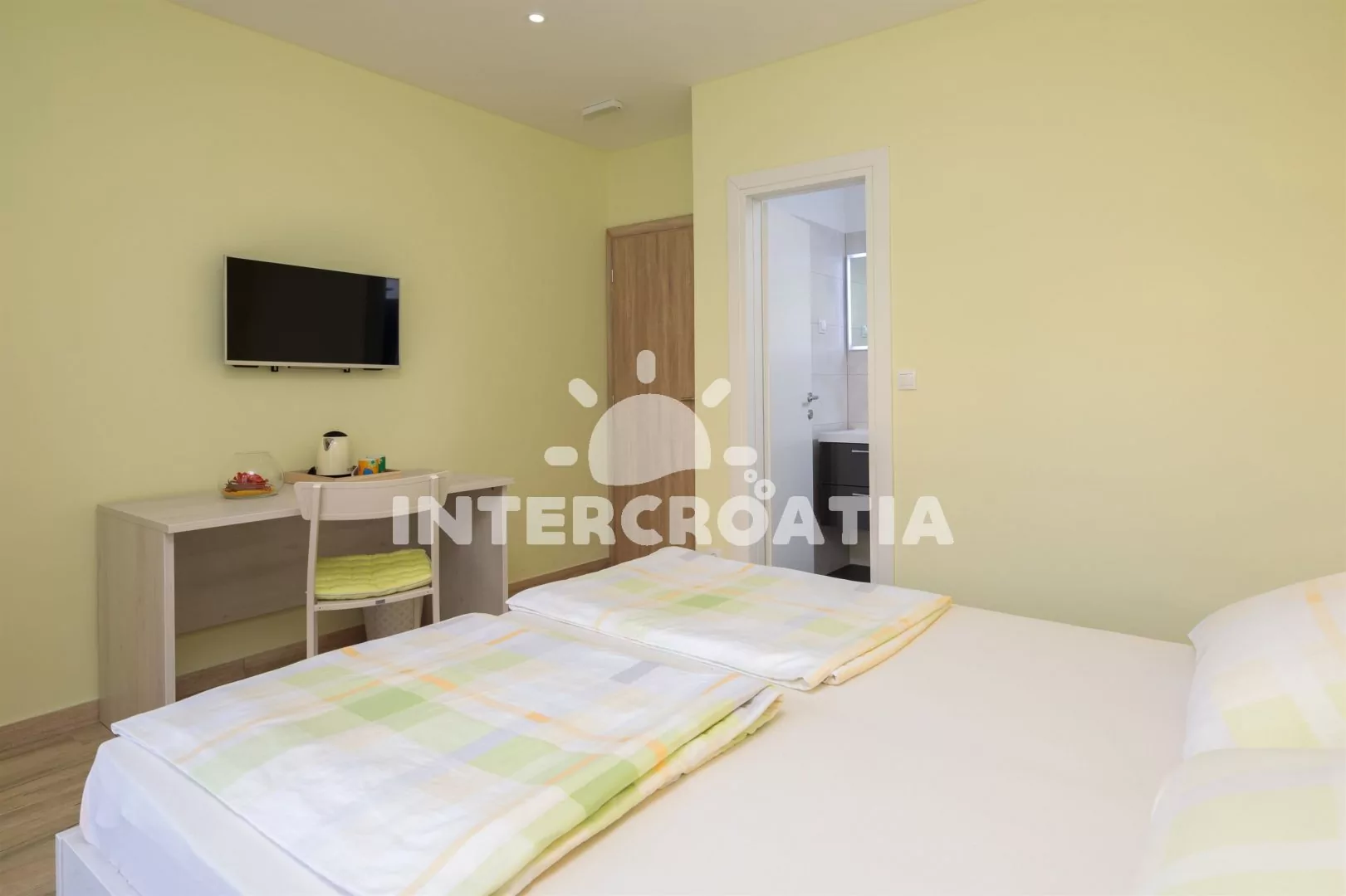 Světlý a komfortní apartmánový pokoj, se nachází v přízemí a disponuje balkonem s posezením. Pokoj je vybavený televizí se satelitním programem, klimatizací, jedním dvoulůžkem, malou chladničkou a vstupem na terasu. Koupelna se sprchovým koutem, umyvadlem, fénem a wc. Hostům je k dispozici parkování u objektu zdarma.