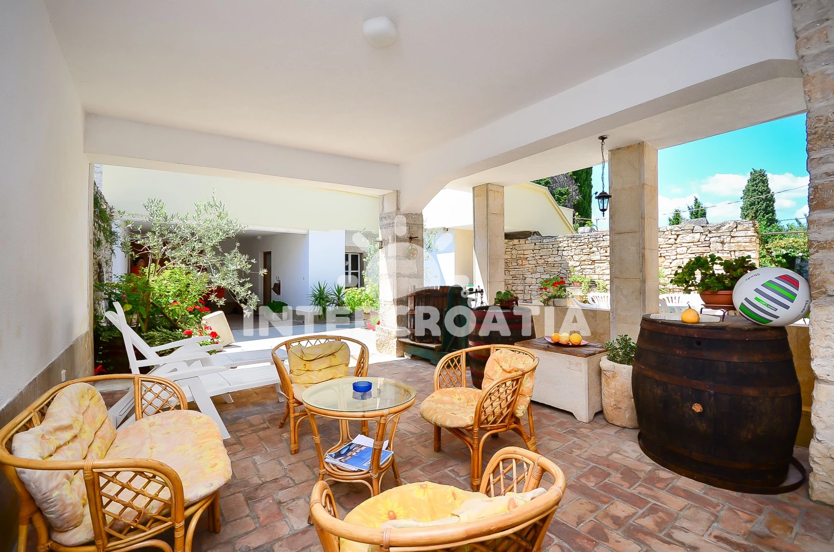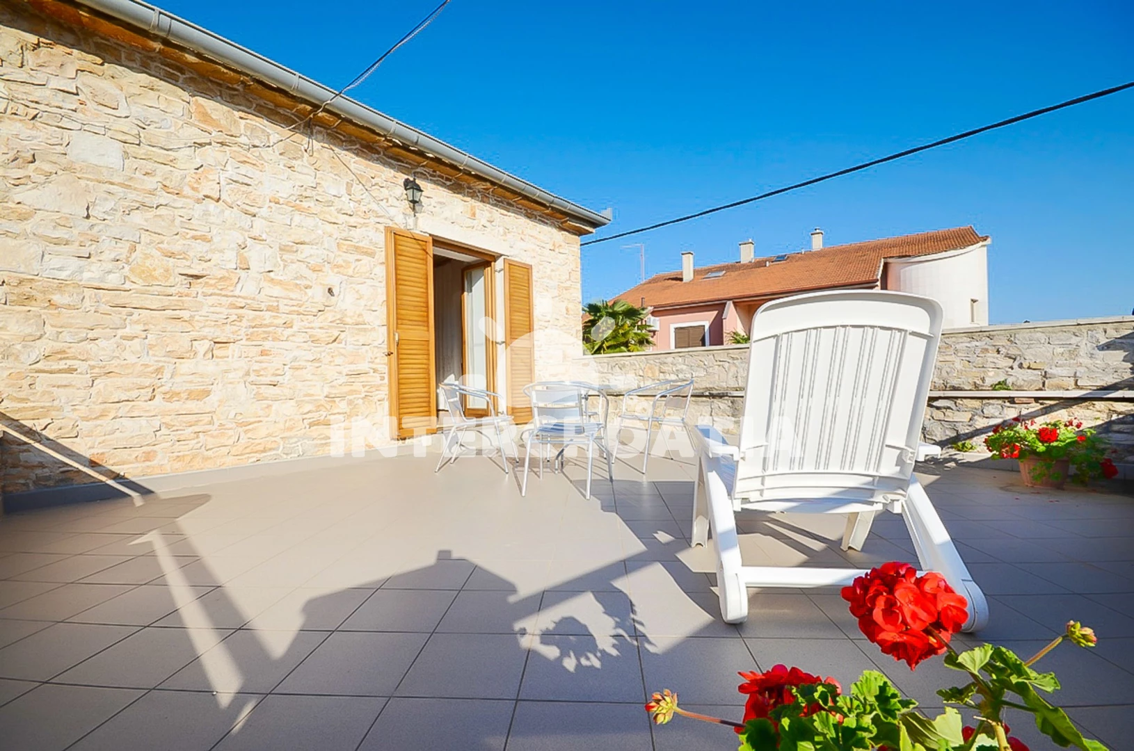 Domek se nachází 500 m od moře a pláže. Pláž je skalnatá, oblázková a betonové desky. U objektu je k dispozici společná zahrada s posezením a grilem. Parkování je před domem.