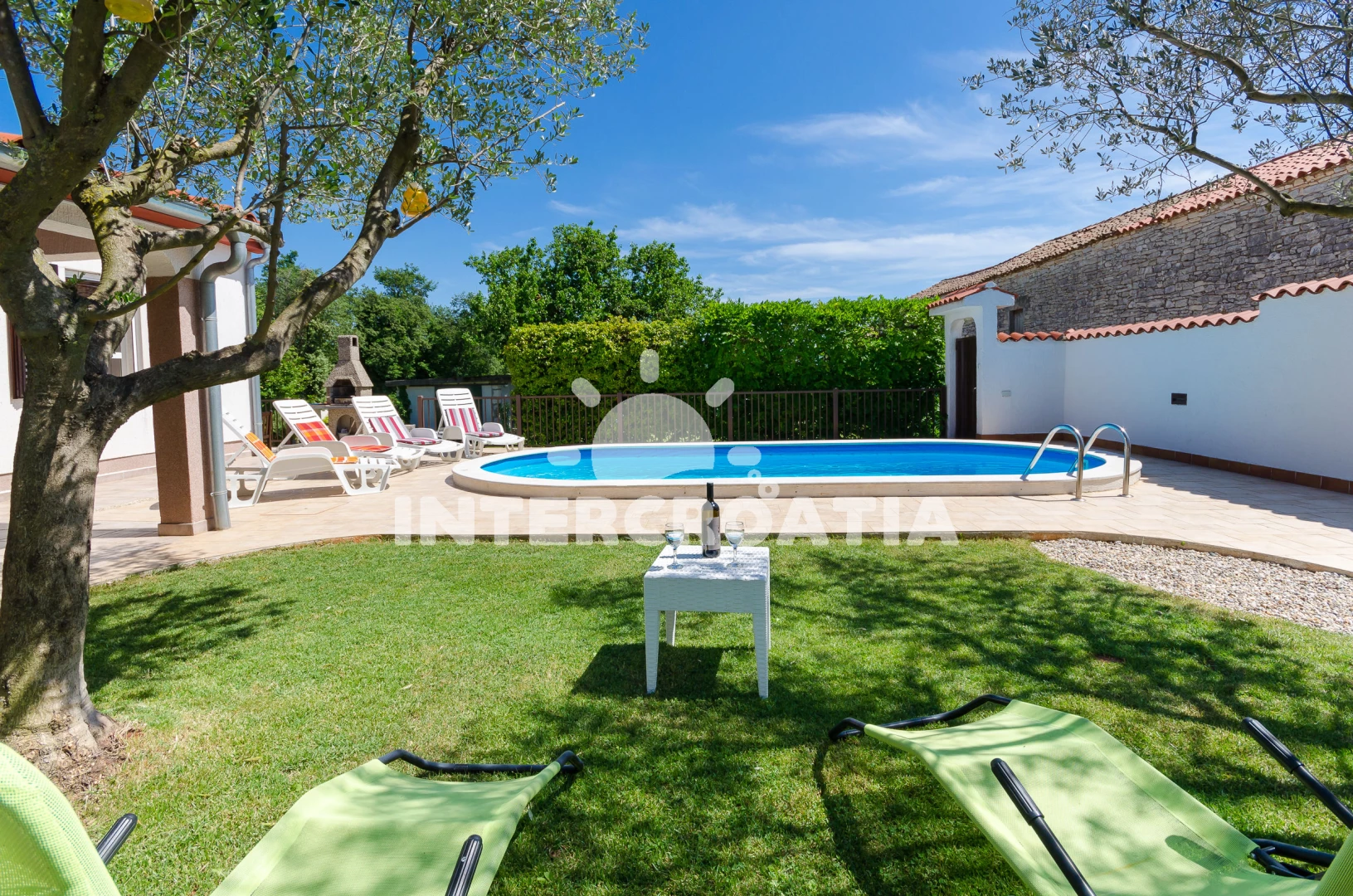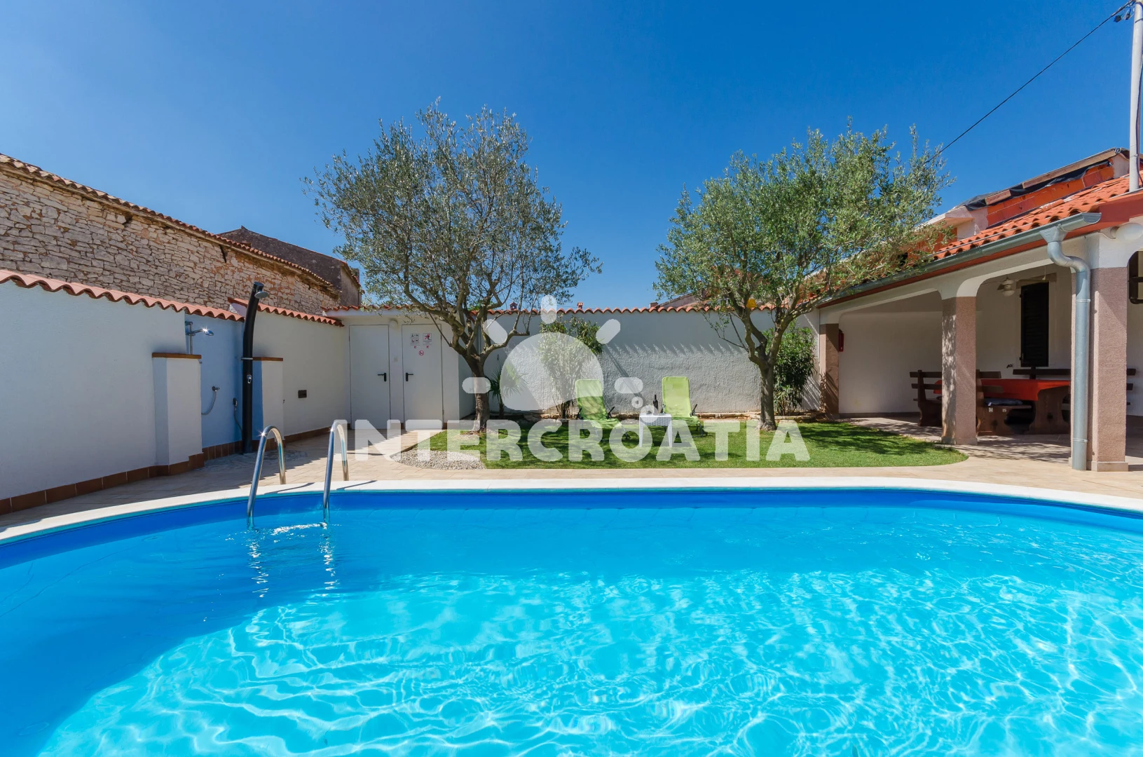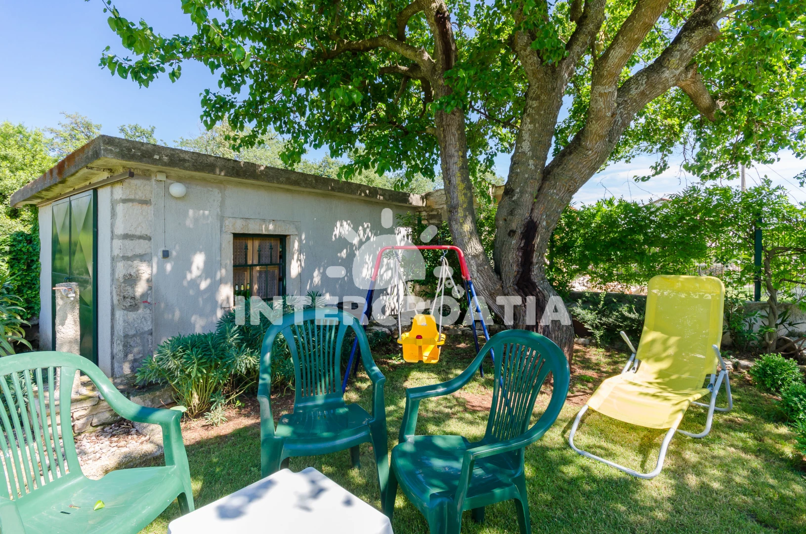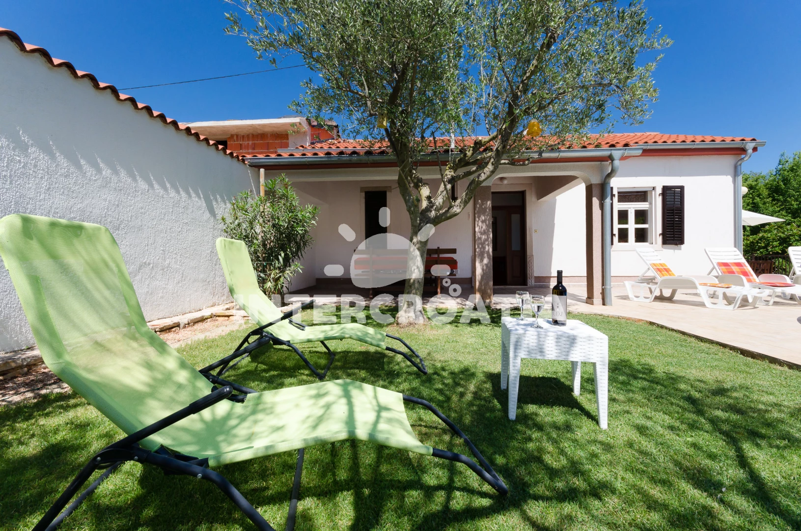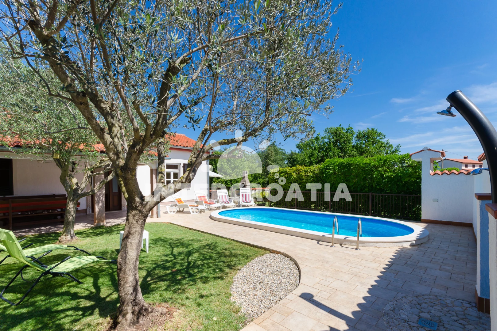 Domek se nachází 2000 m od moře a pláže. Pláž je skalnatá a oblázková. Domek disponuje bazénem s lehátky pro ubytované hosty. U objektu je k dispozici společná zahrada s posezením a grilem. Parkování je před domem.