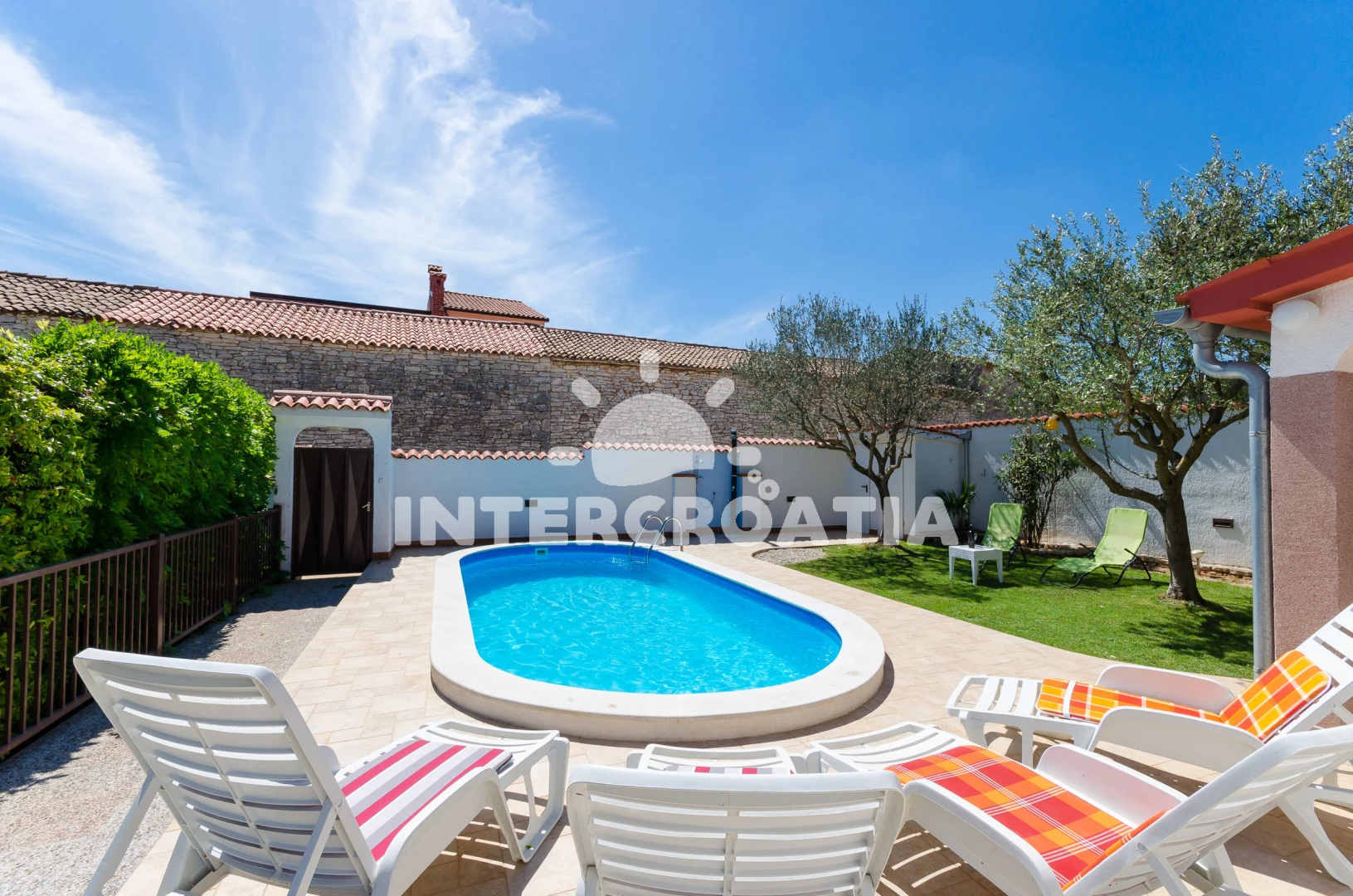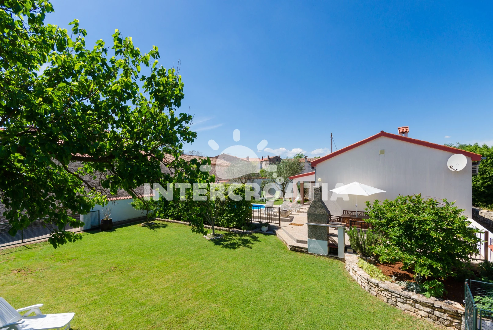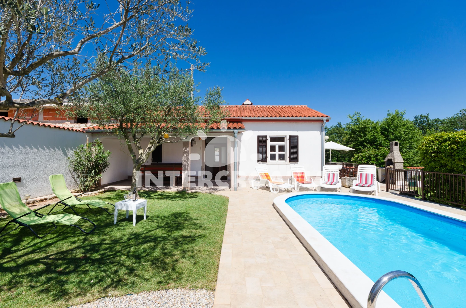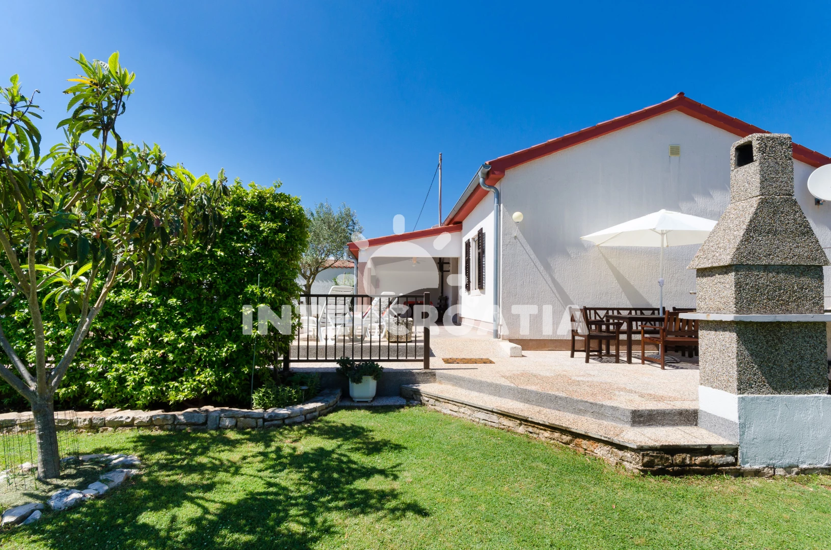Domek se nachází 2000 m od moře a pláže. Pláž je skalnatá a oblázková. Domek disponuje bazénem s lehátky pro ubytované hosty. U objektu je k dispozici společná zahrada s posezením a grilem. Parkování je před domem.