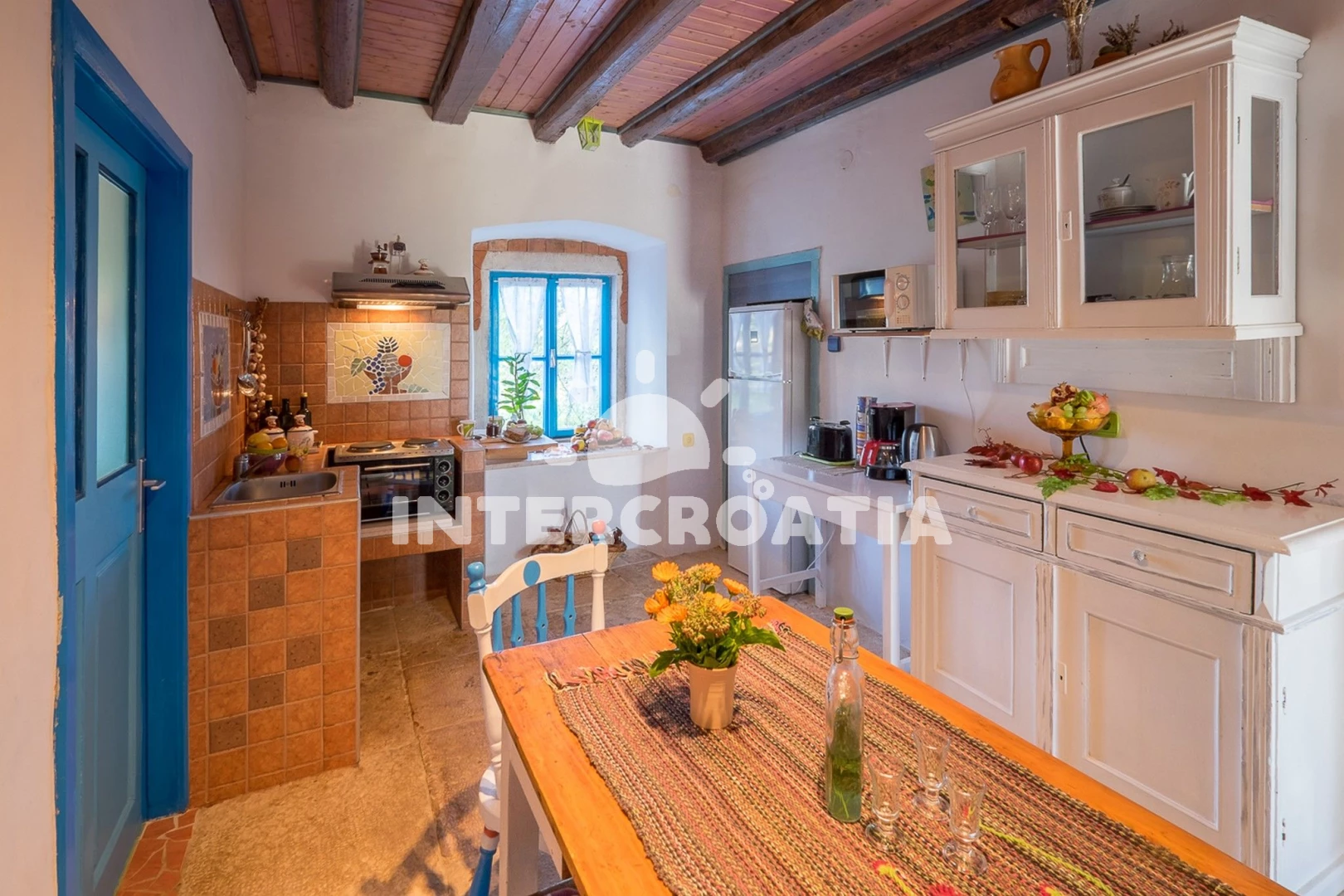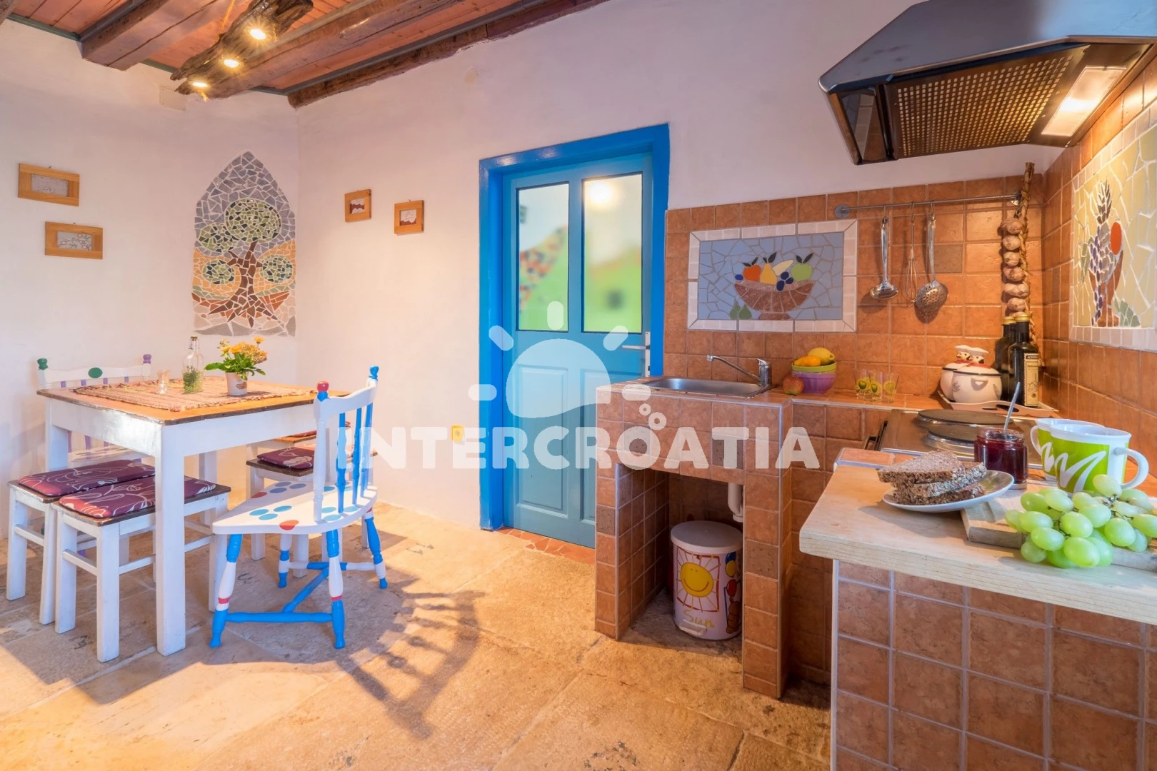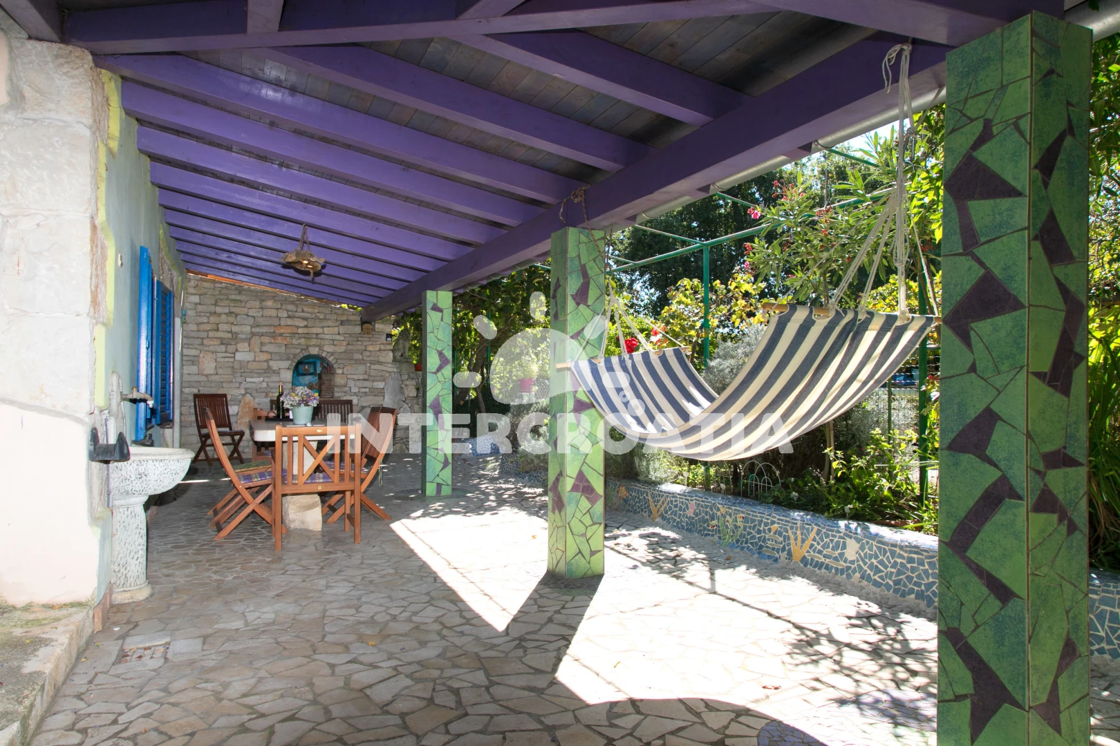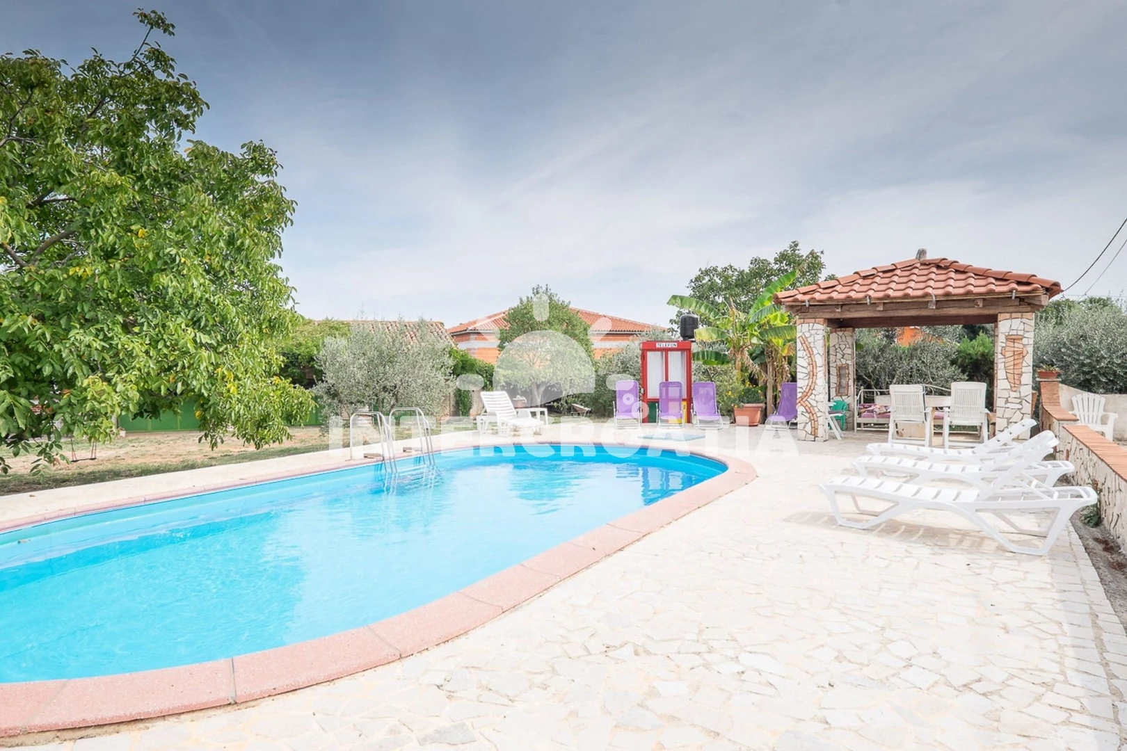 Domek se nachází 5000 m od moře a pláže. Pláž je skalnatá a oblázková. Domek disponuje bazénem s lehátky pro ubytované hosty. U objektu je k dispozici společná zahrada s posezením a grilem. Parkování je před domem.