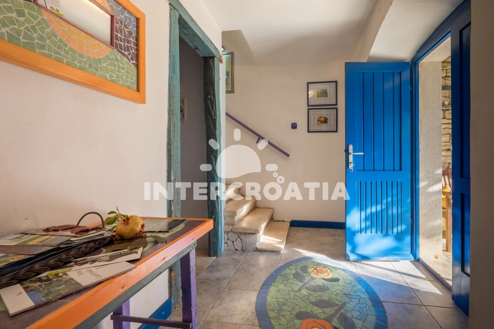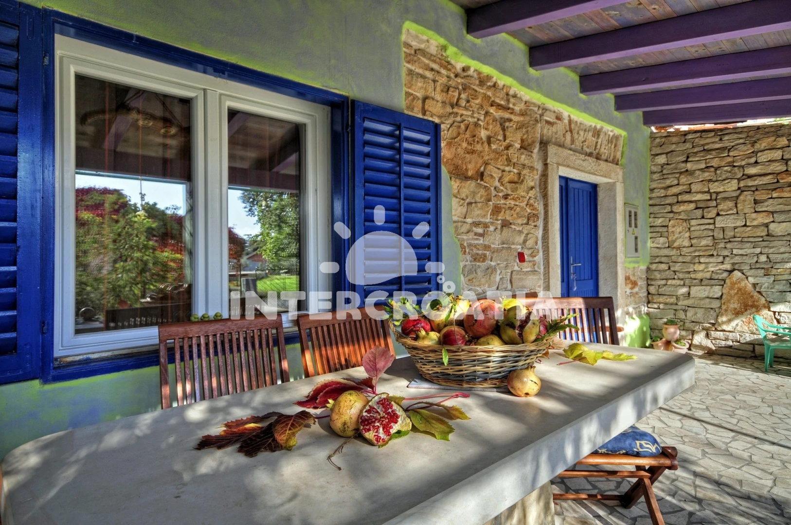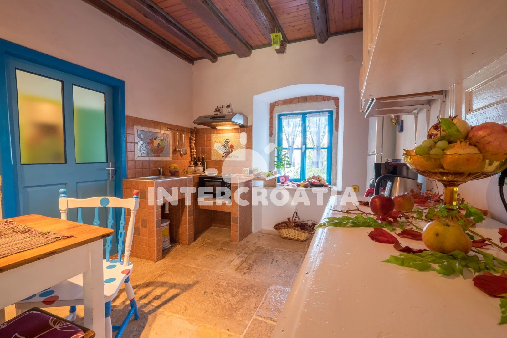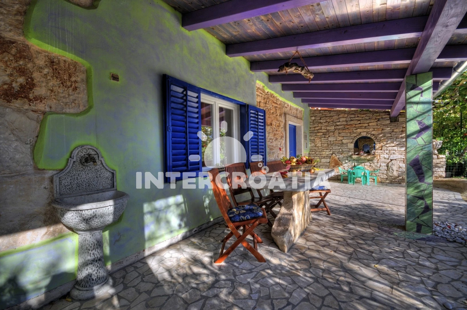 Domek se nachází 5000 m od moře a pláže. Pláž je skalnatá a oblázková. Domek disponuje bazénem s lehátky pro ubytované hosty. U objektu je k dispozici společná zahrada s posezením a grilem. Parkování je před domem.