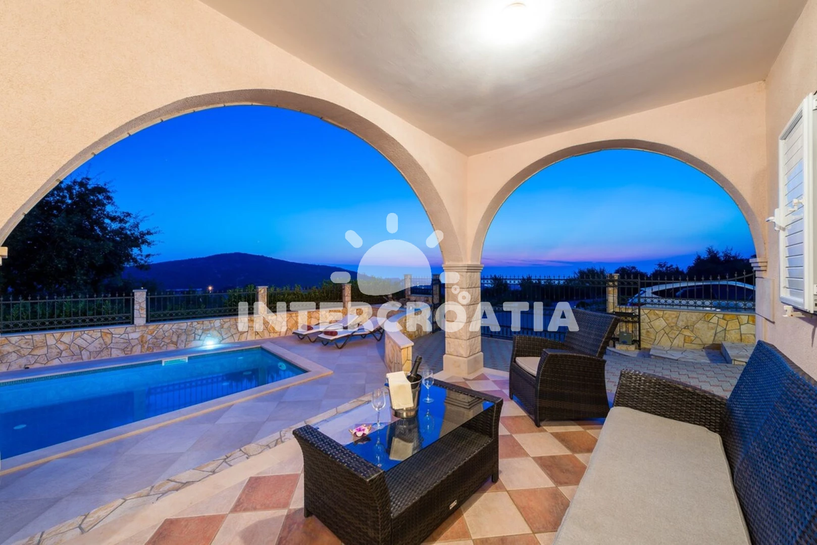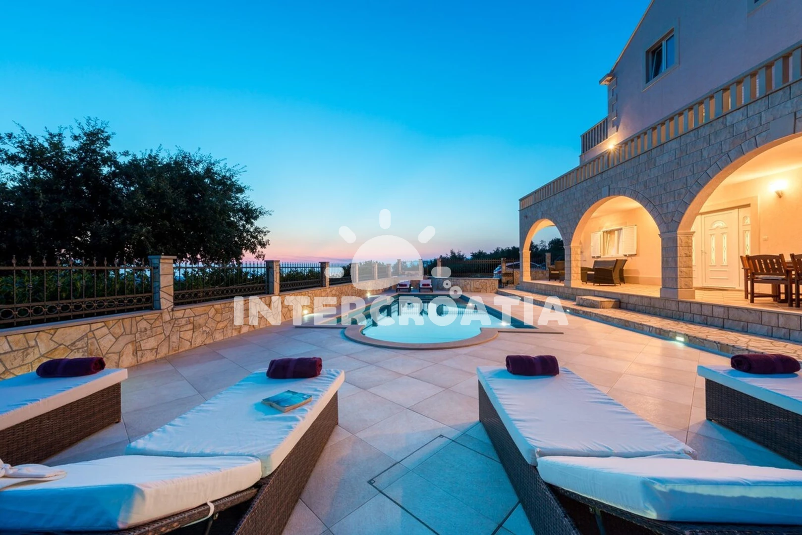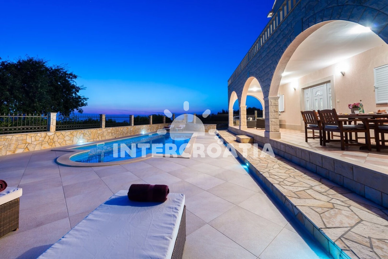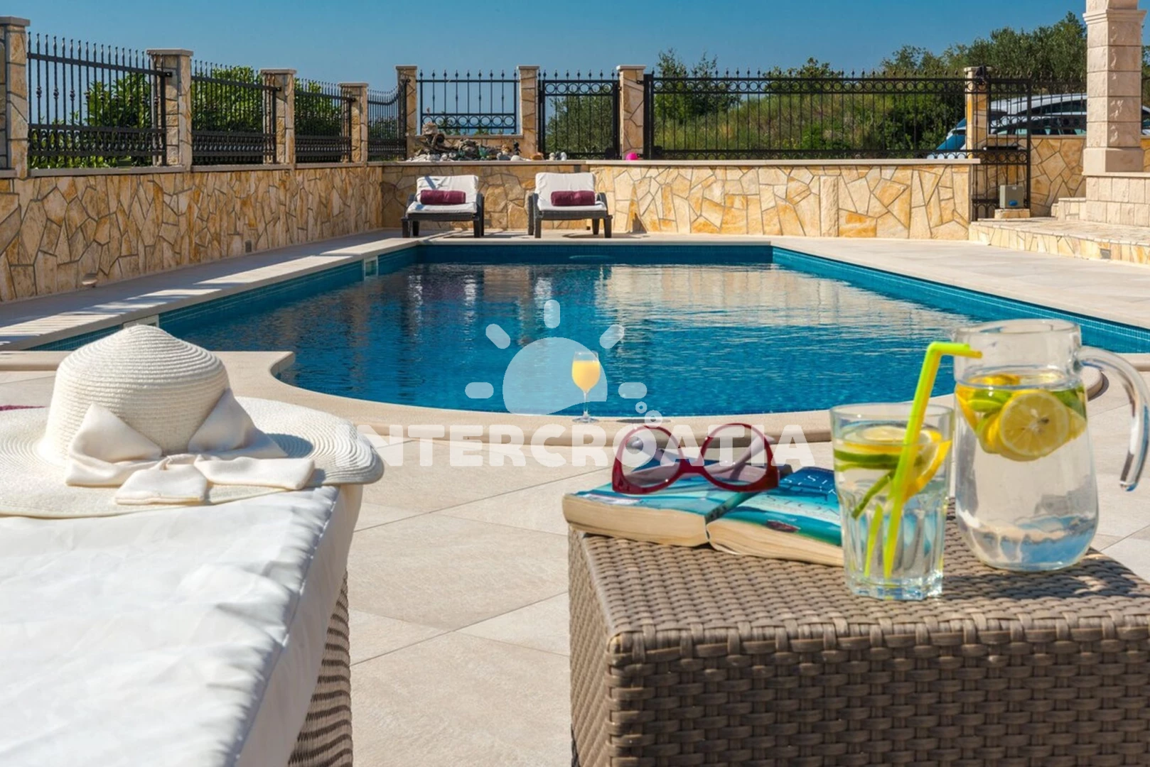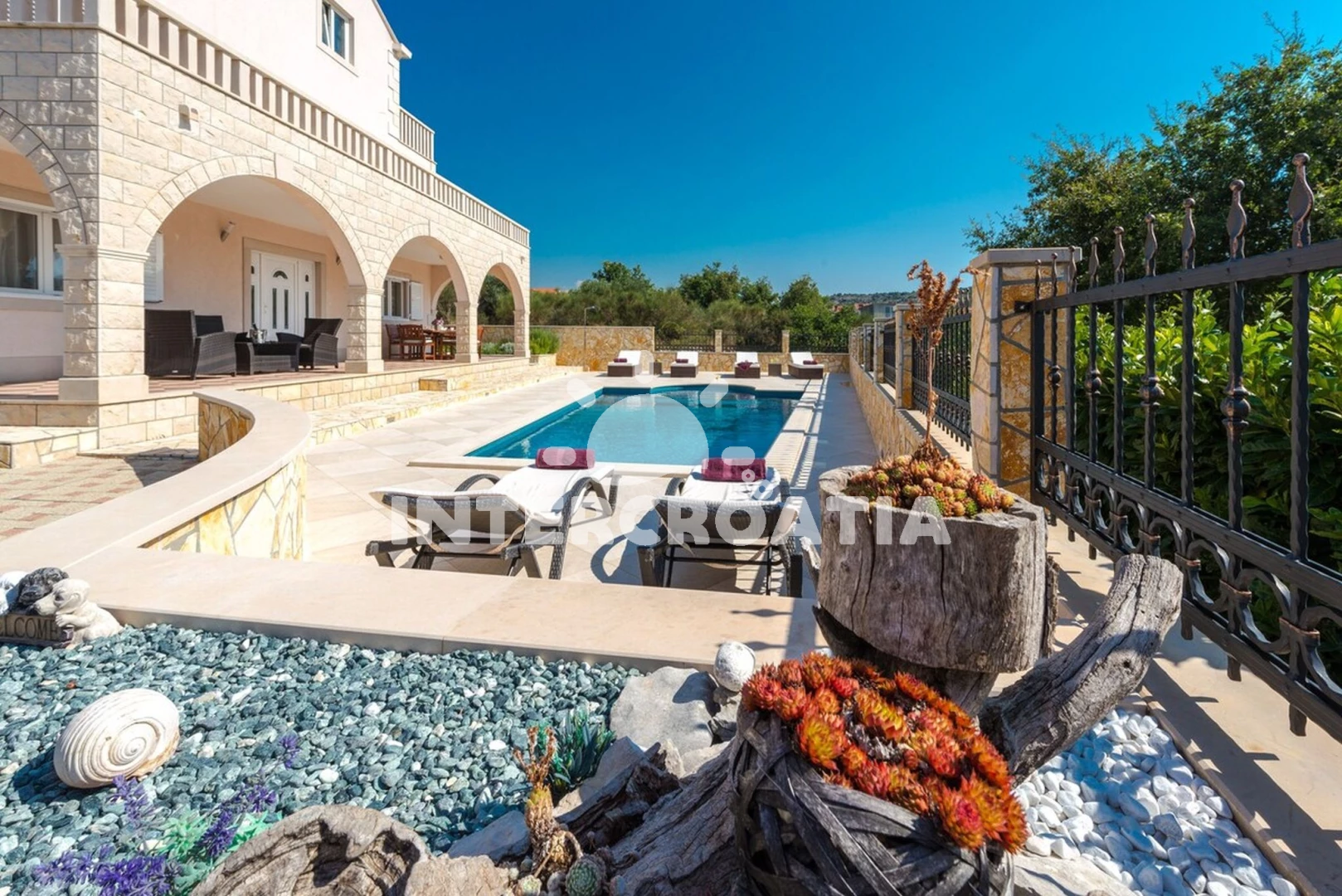 Domek se nachází 2200 m od moře a pláže. Pláž je oblázková a betonové desky. Domek disponuje bazénem s lehátky pro ubytované hosty. U objektu je k dispozici společná zahrada s posezením a grilem. Parkování je před domem.