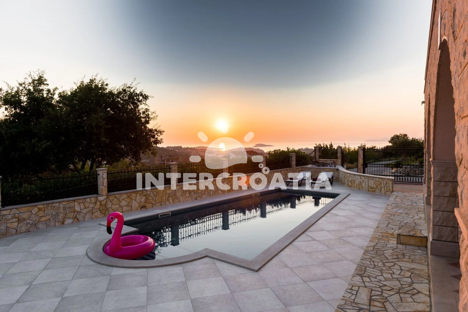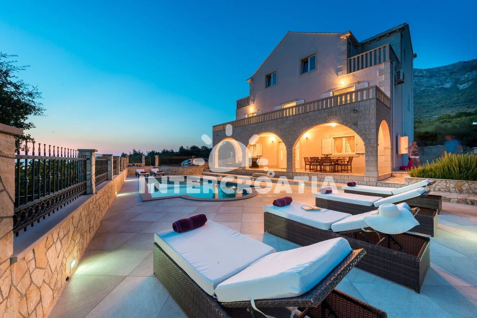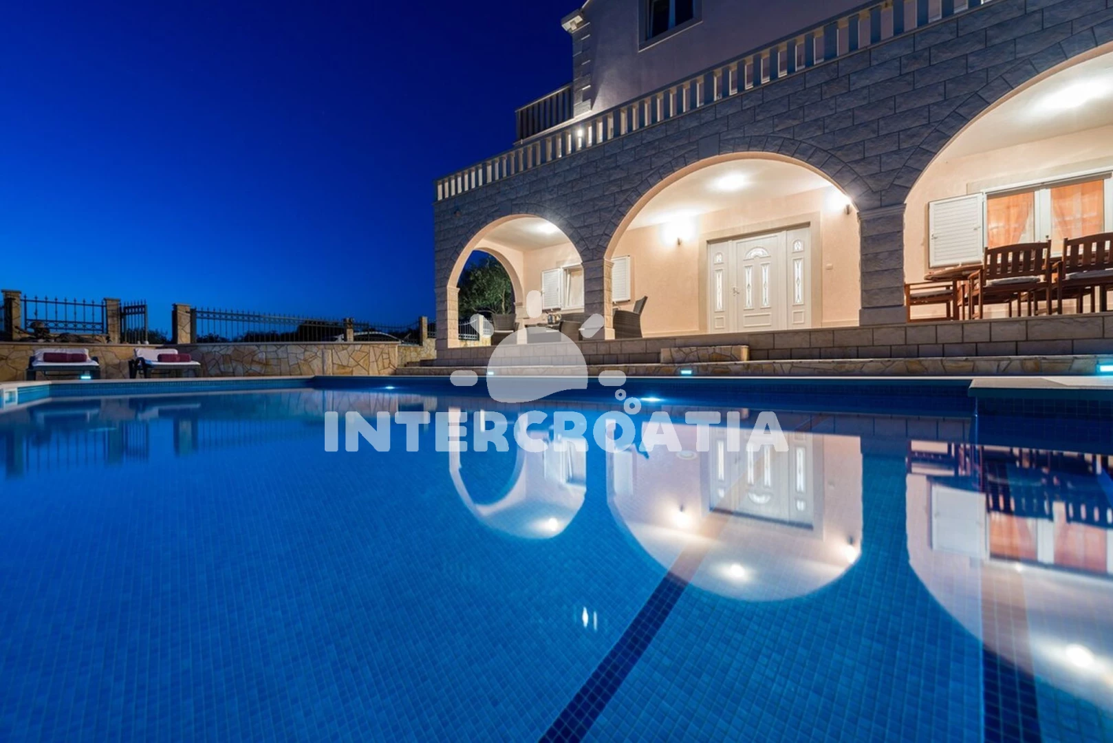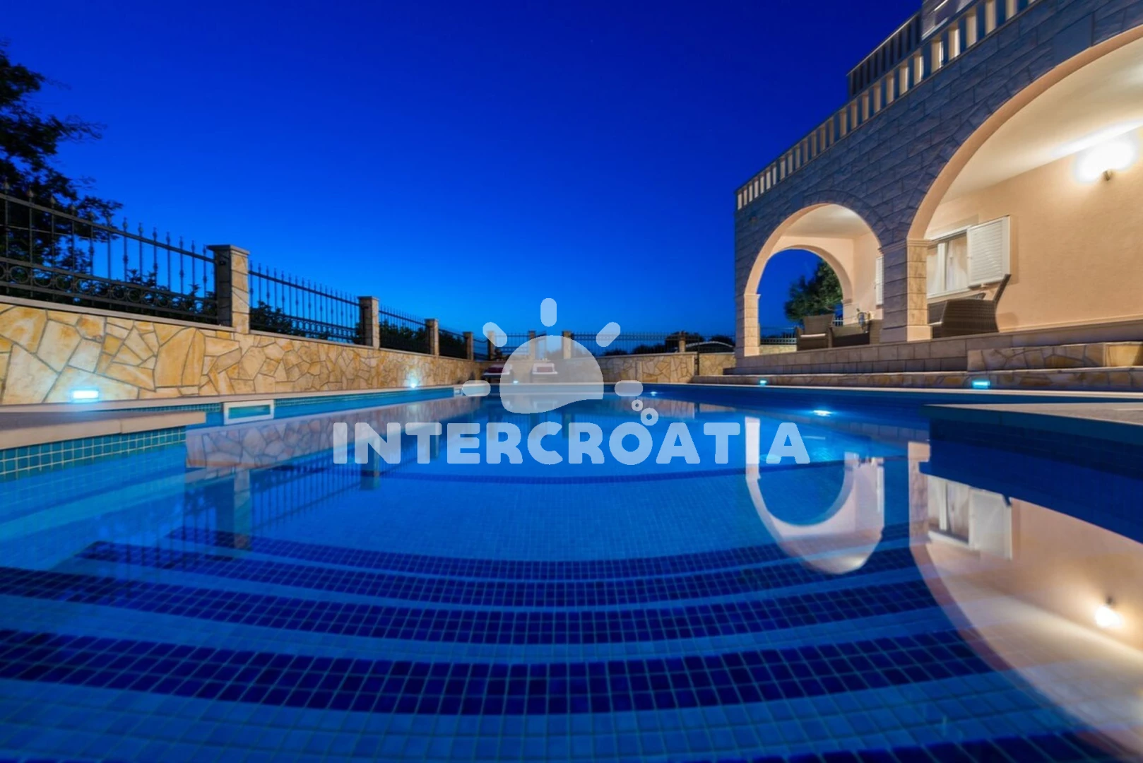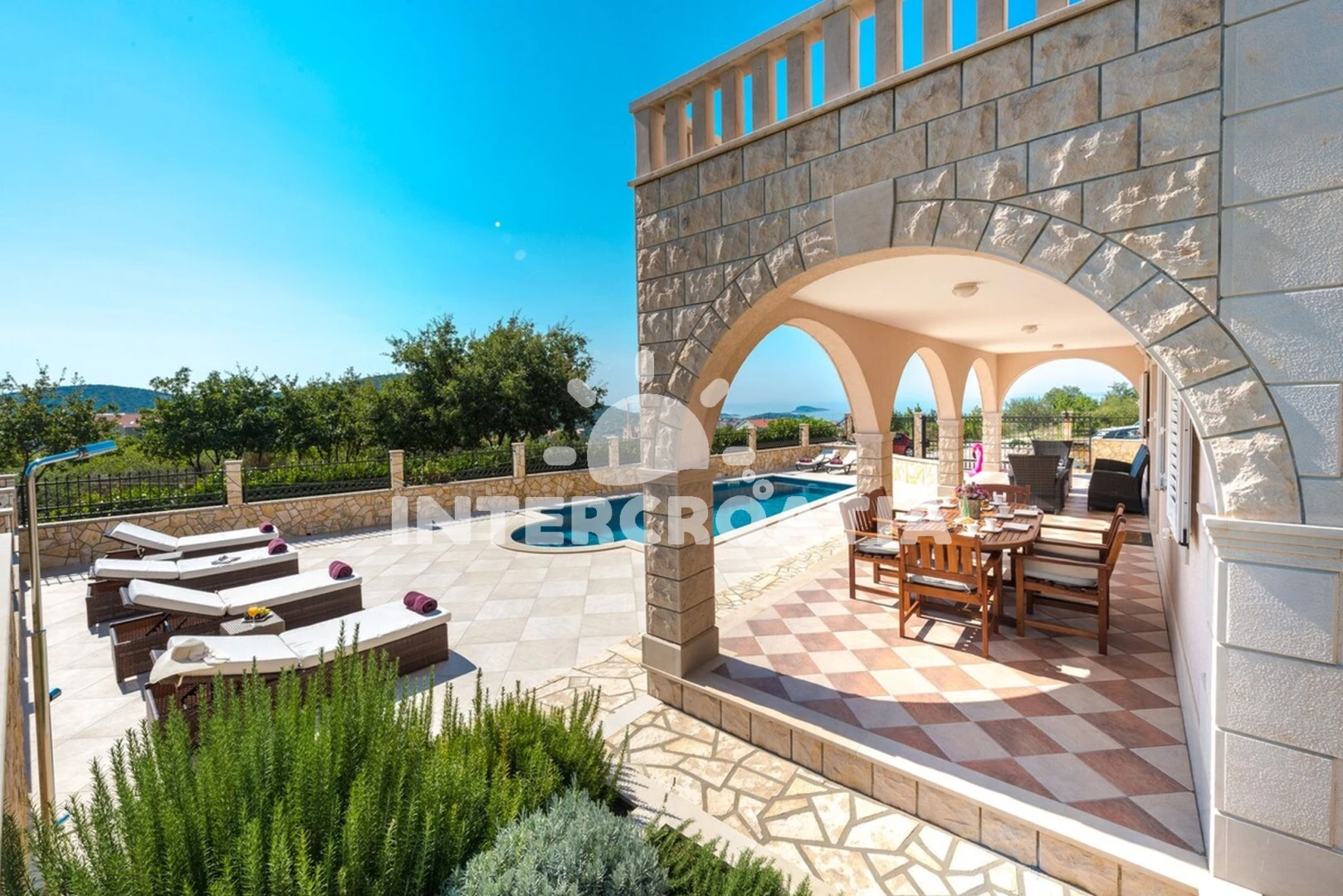 Domek se nachází 2200 m od moře a pláže. Pláž je oblázková a betonové desky. Domek disponuje bazénem s lehátky pro ubytované hosty. U objektu je k dispozici společná zahrada s posezením a grilem. Parkování je před domem.