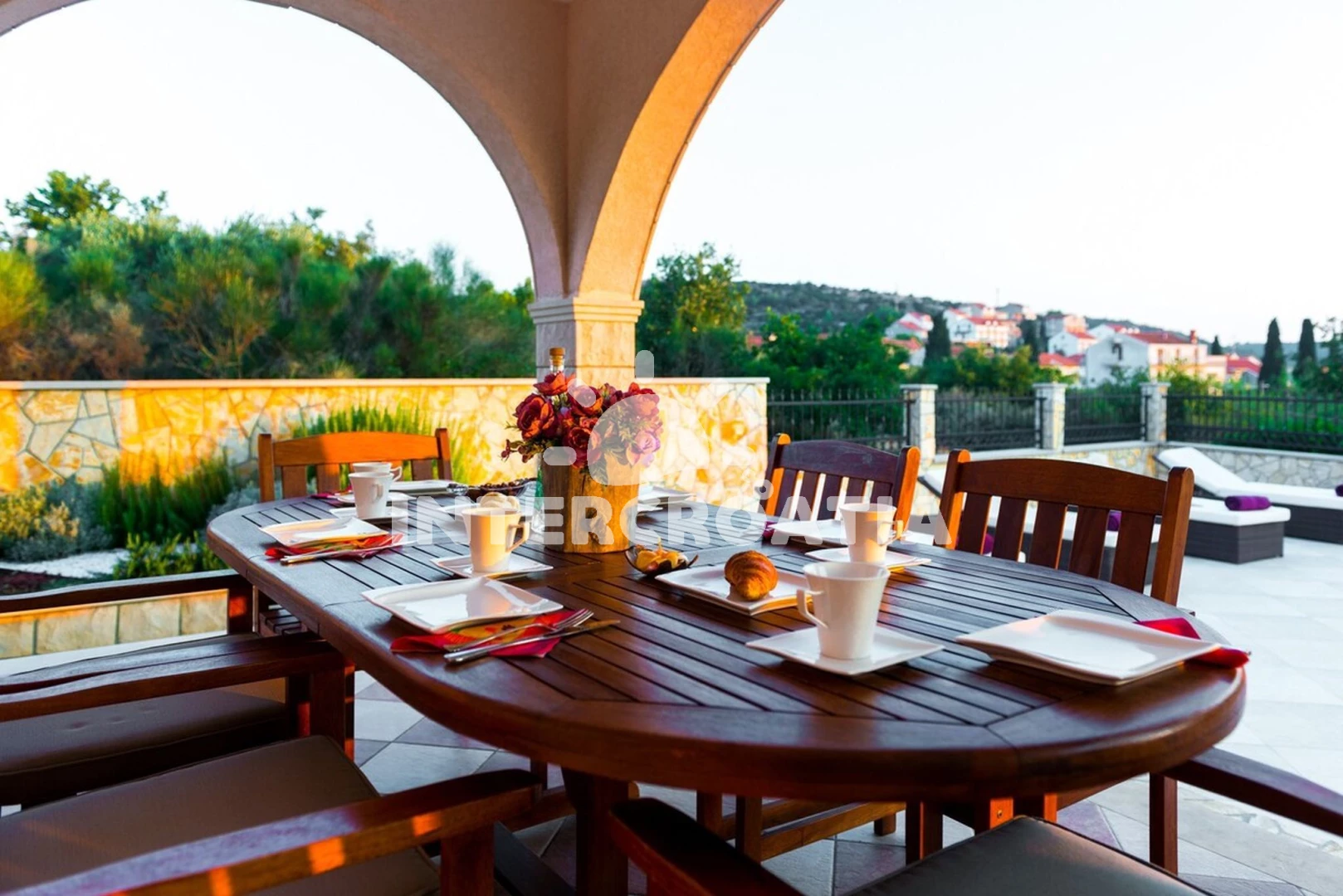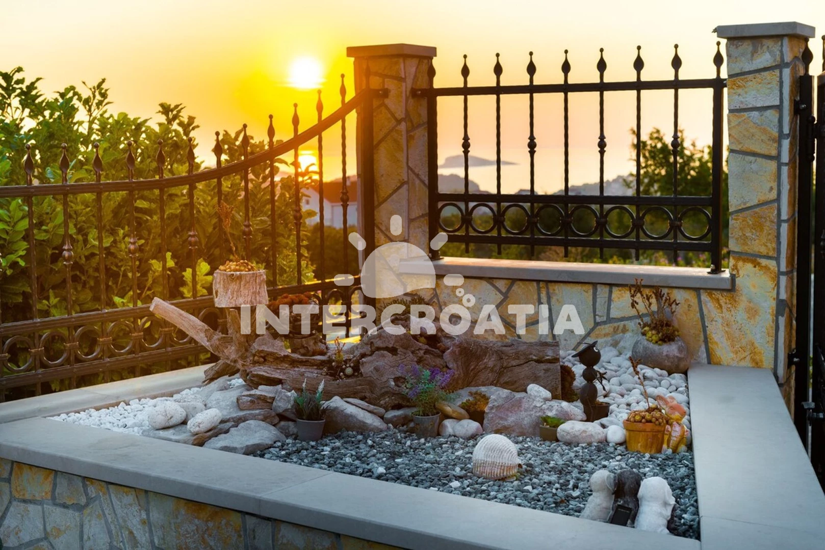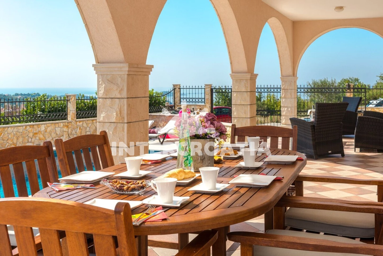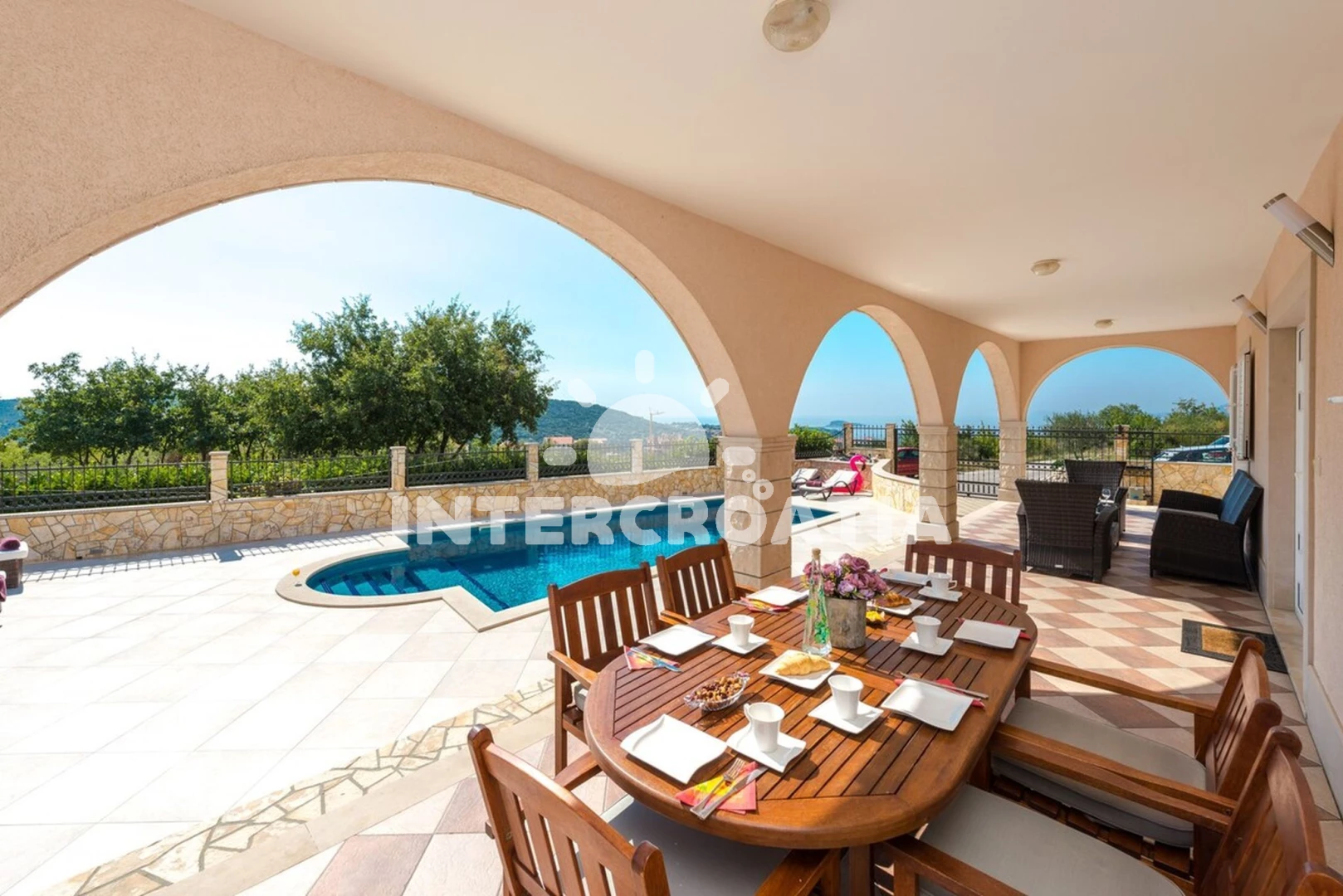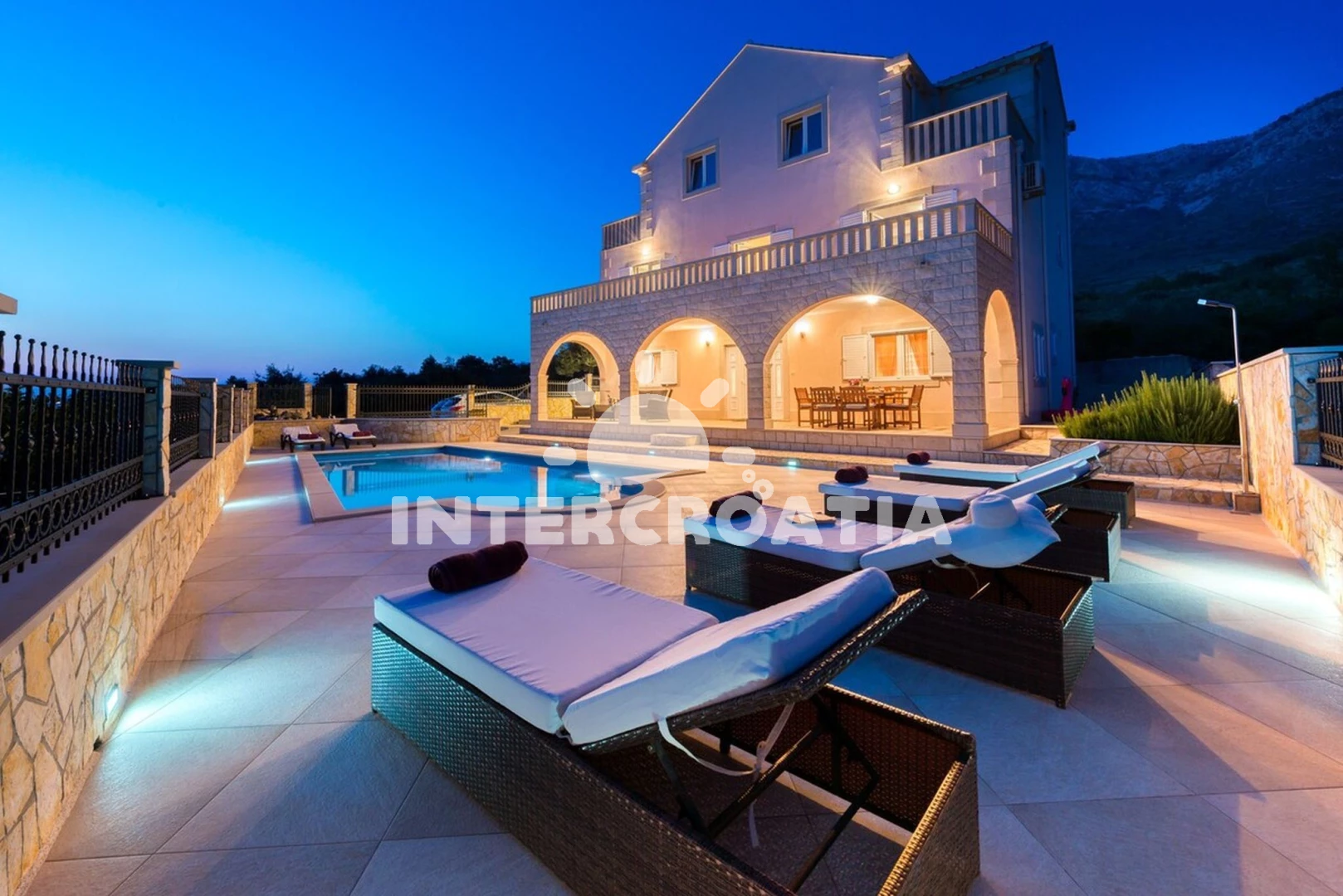 Domek se nachází 2200 m od moře a pláže. Pláž je oblázková a betonové desky. Domek disponuje bazénem s lehátky pro ubytované hosty. U objektu je k dispozici společná zahrada s posezením a grilem. Parkování je před domem.