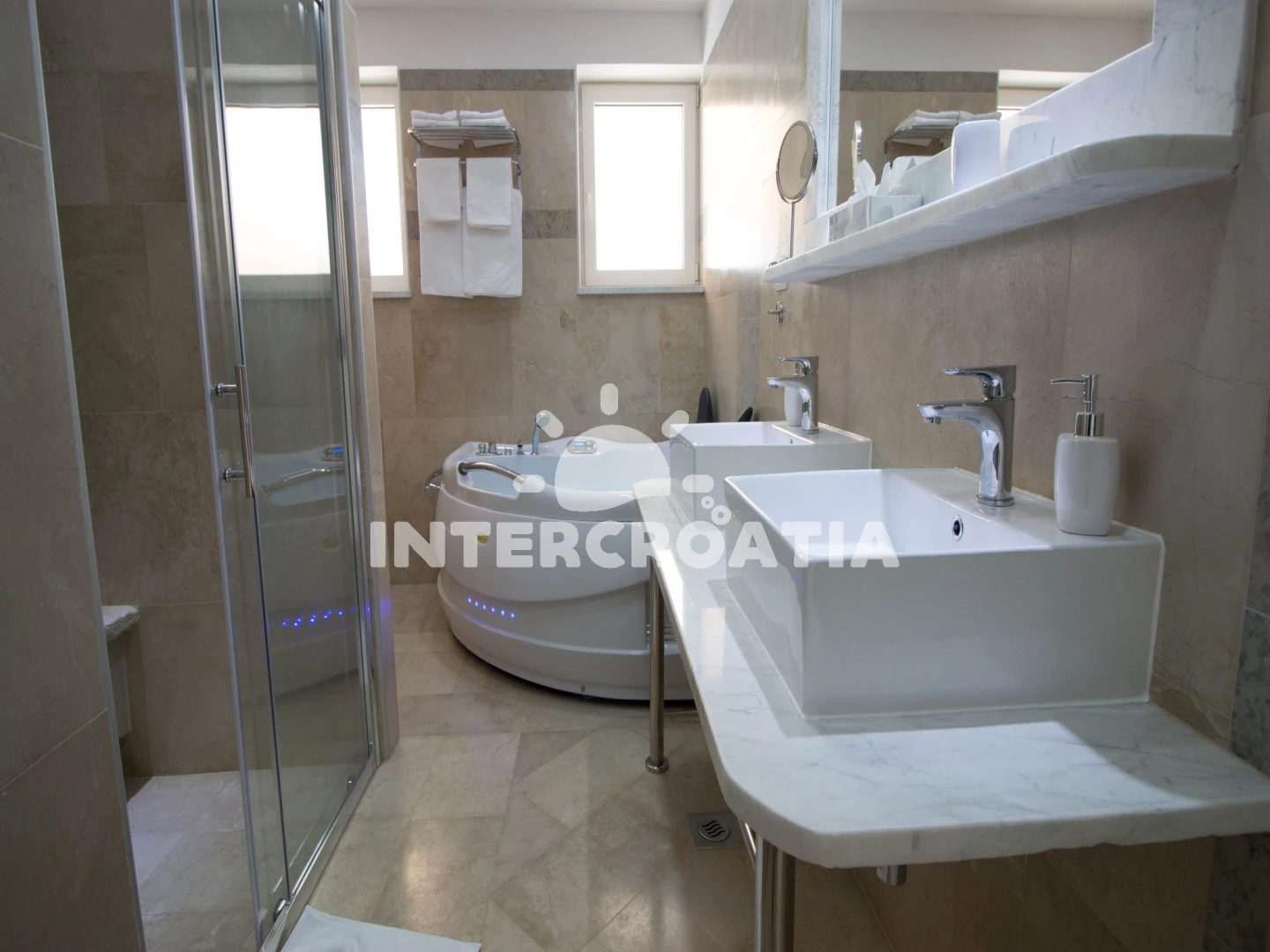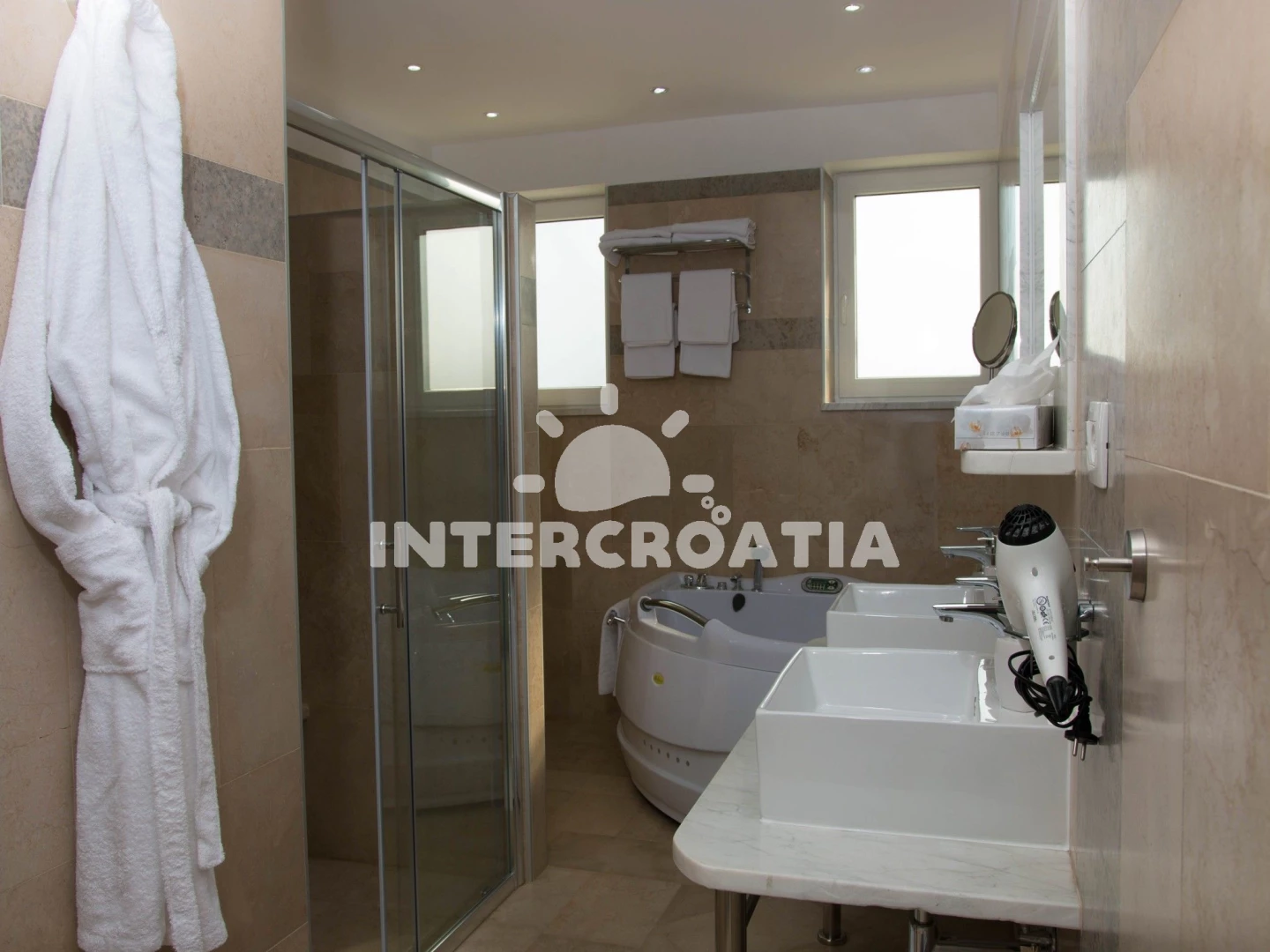 Domek (230 m2) s balkonem. Nachází se ve dvou patrech objektu. Domek má 4 ložnice a je vhodný pro až 8 osob. Kuchyňská linka je vybavena varnou deskou, kávovarem, troubou, toustovačem, myčkou na nádobí, mikrovlnnou troubou, rychlovarnou konvicí, nádobím, lednicí. K dispozici televize se satelitním programem, sejf, radio, žehlička. První ložnice s dvoulůžkem. Druhá ložnice s dvoulůžkem. Třetí ložnice s dvoulůžkem. Čtvrtá ložnice s dvoulůžkem. První koupelna se sprchovým koutem, umyvadlem, fénem a WC. Druhá koupelna se sprchovým koutem, umyvadlem, fénem a WC. Třetí koupelna se sprchovým koutem, umyvadlem, fénem a WC. Dále samostatné WC.