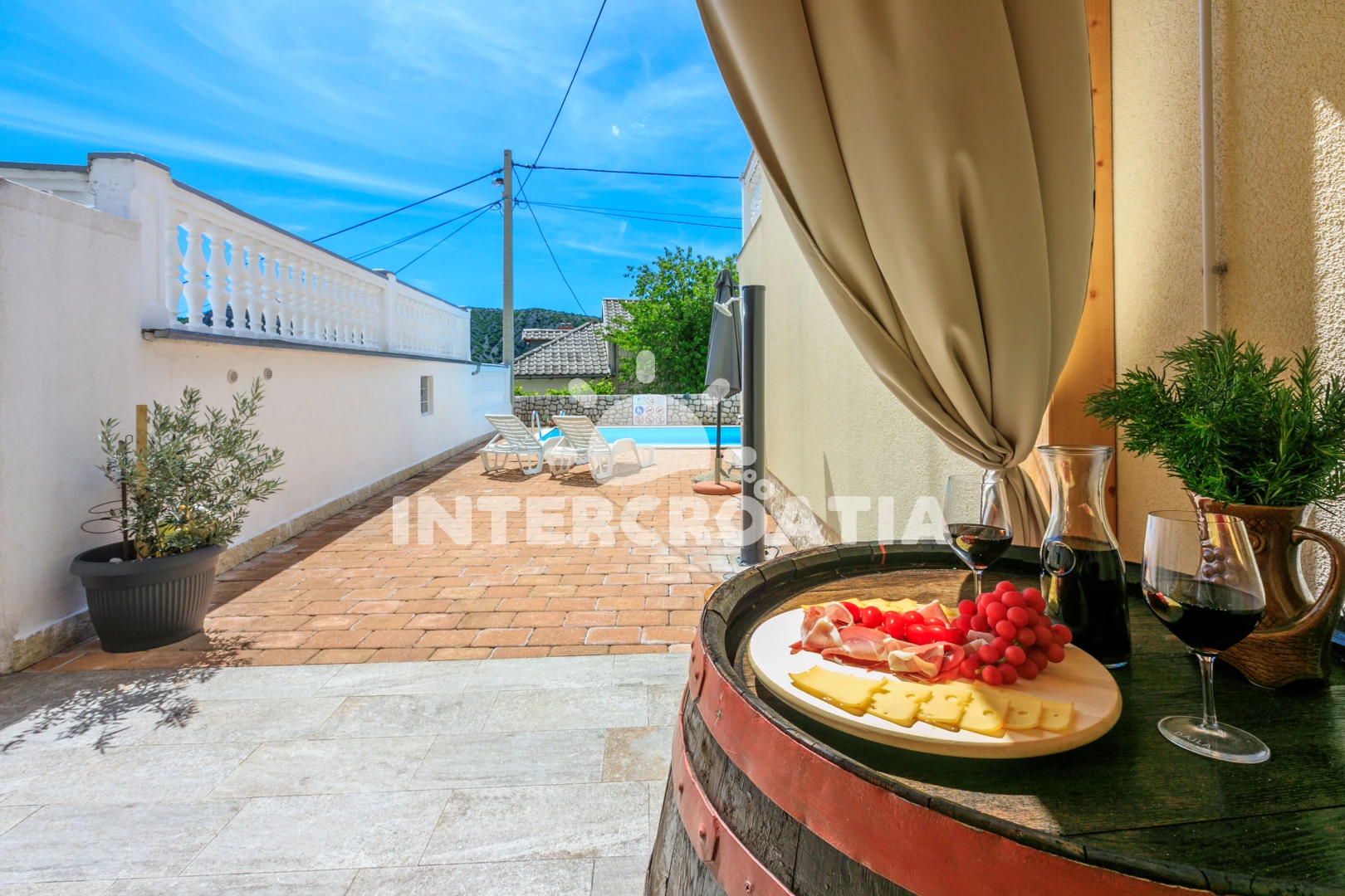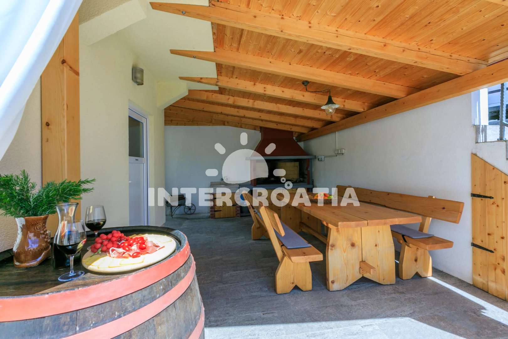 Domek se nachází 4800 m od moře a pláže. Pláž je písčitá, oblázková a větší kamení. Domek disponuje bazénem s lehátky pro ubytované hosty. U objektu je k dispozici společná zahrada s posezením a grilem.