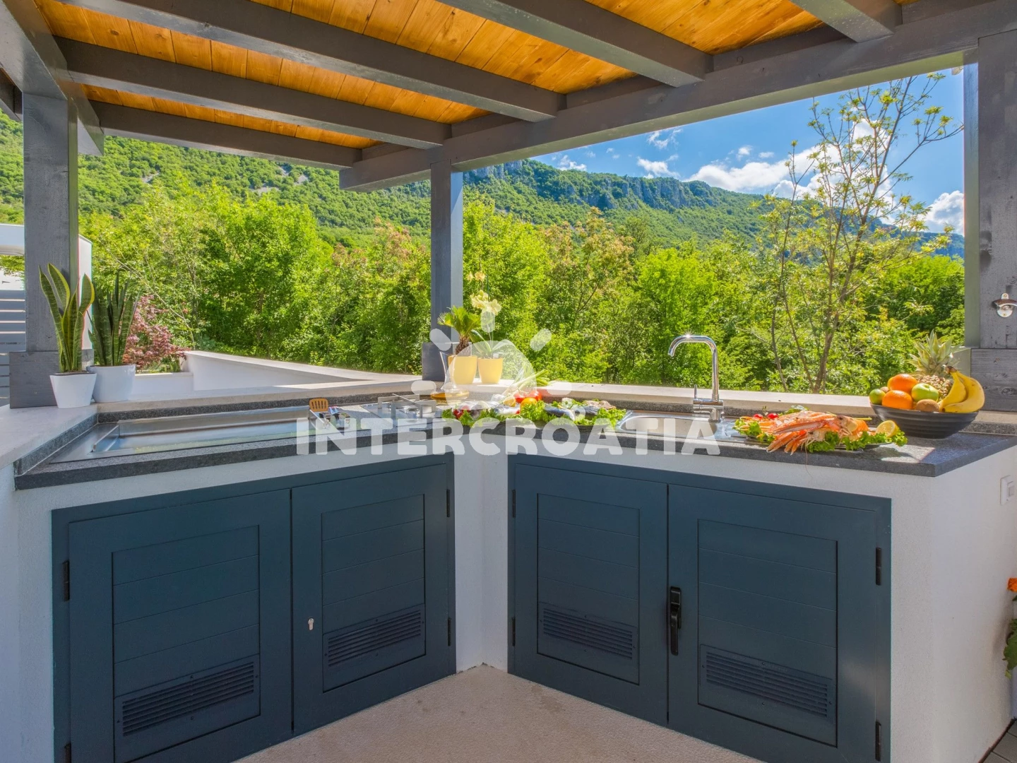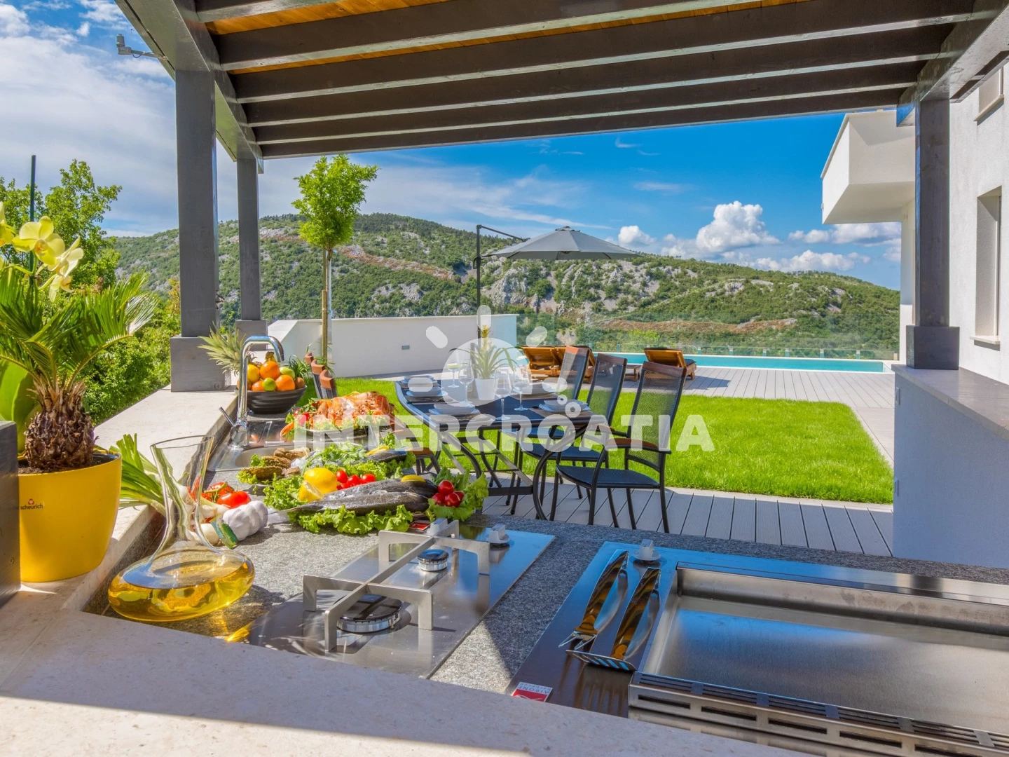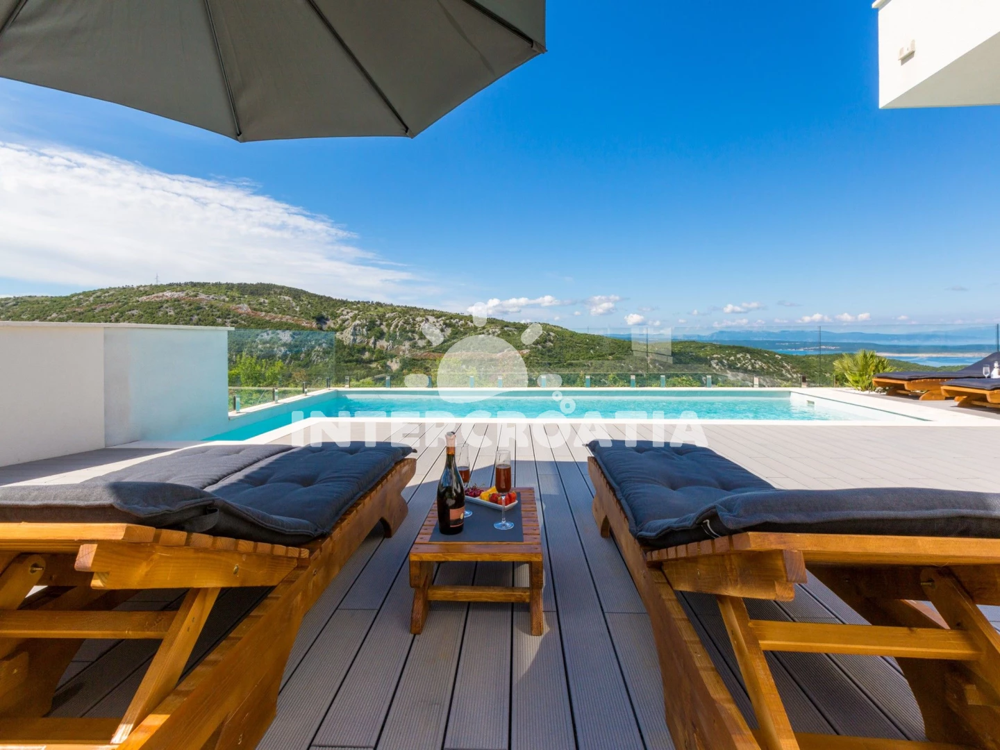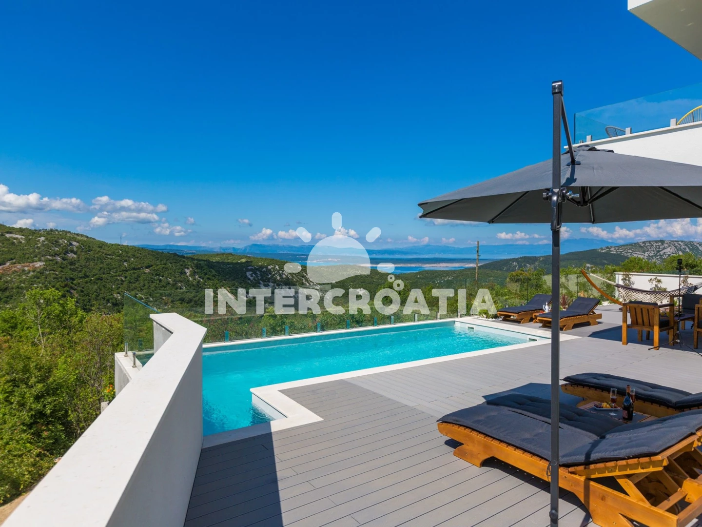 Domek se nachází 6000 m od moře a pláže. Pláž je oblázková a betonové desky. Domek disponuje bazénem s lehátky pro ubytované hosty. U objektu je k dispozici společná zahrada s posezením a grilem.