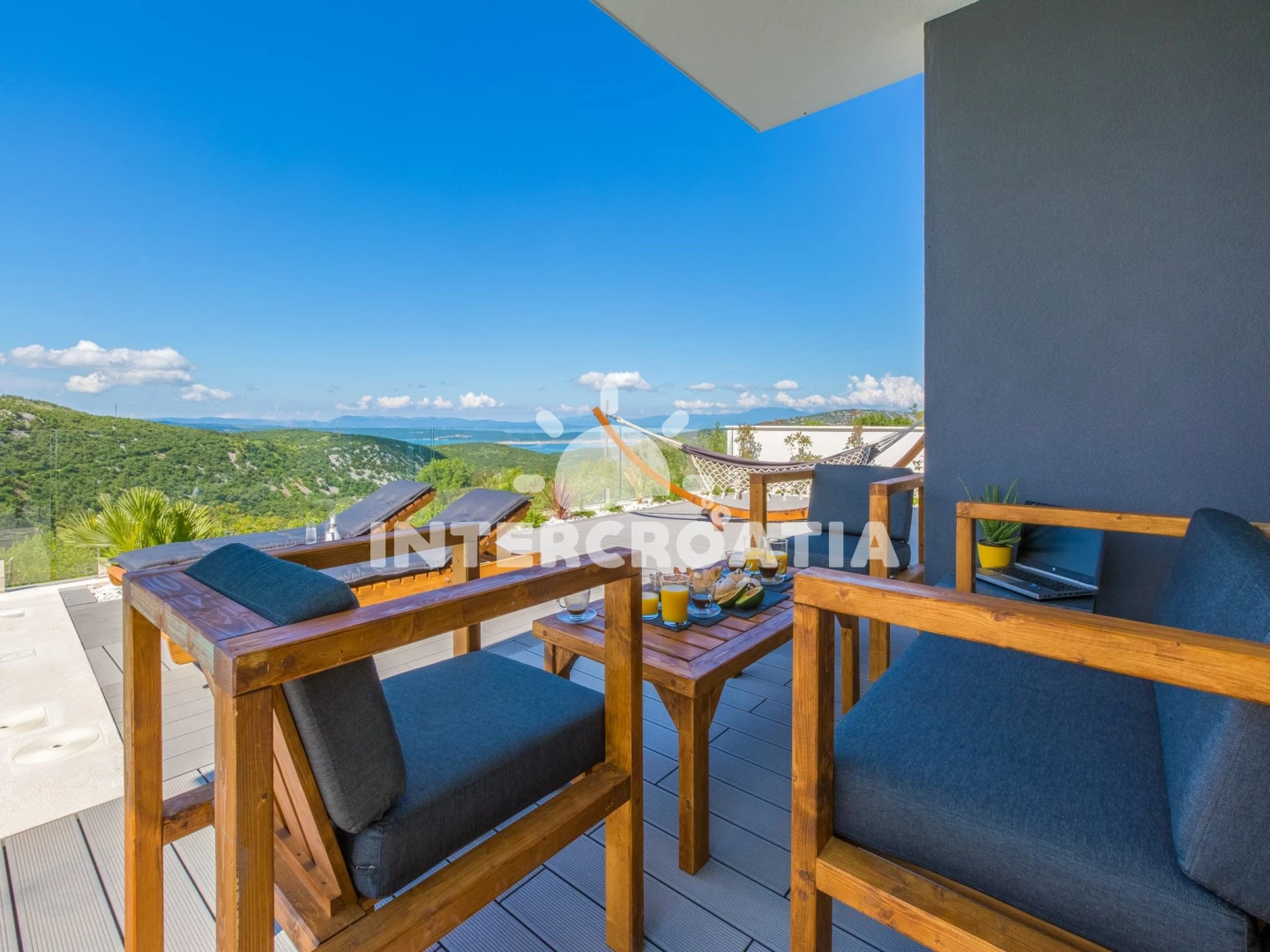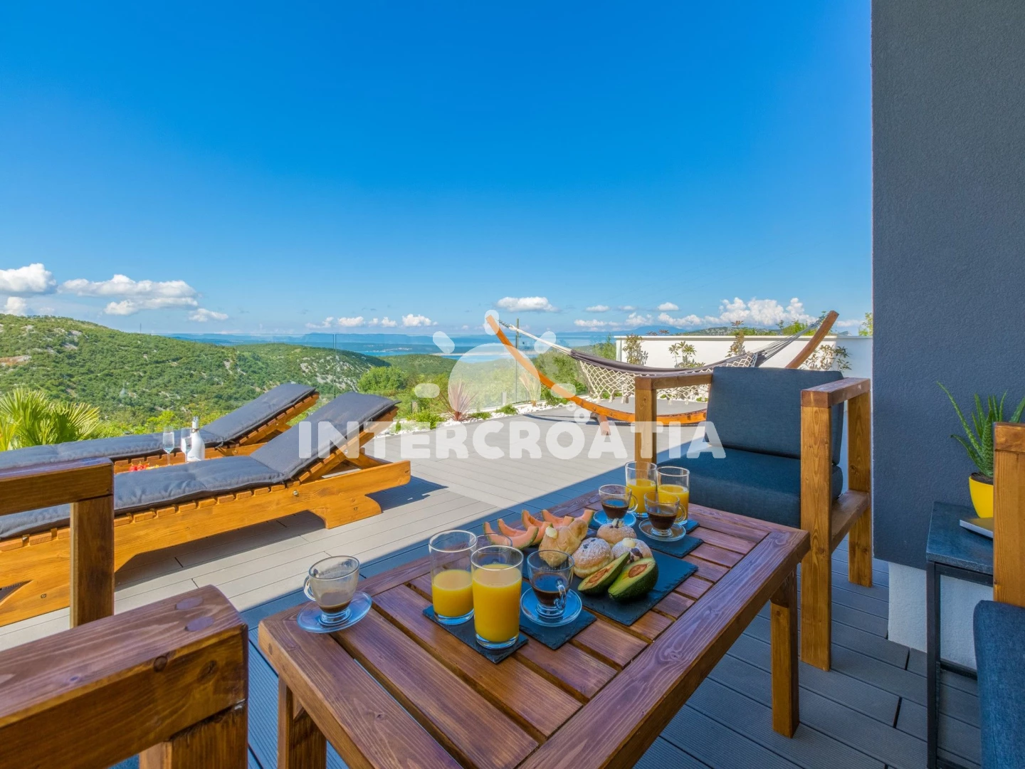 Domek (150 m2) s balkonem. Nachází se ve dvou patrech objektu. Domek má 1 ložnici a je vhodný pro až 6 osob. Kuchyňská linka je vybavena varnou deskou, kávovarem, troubou, toustovačem, myčkou na nádobí, mikrovlnnou troubou, rychlovarnou konvicí, nádobím, lednicí, mrazákem. K dispozici televize se satelitním programem, radio, žehlička. První koupelna se sprchovým koutem, umyvadlem, fénem a WC. Druhá koupelna se sprchovým koutem, umyvadlem, fénem a WC. Třetí koupelna se sprchovým koutem, umyvadlem, fénem a WC.
