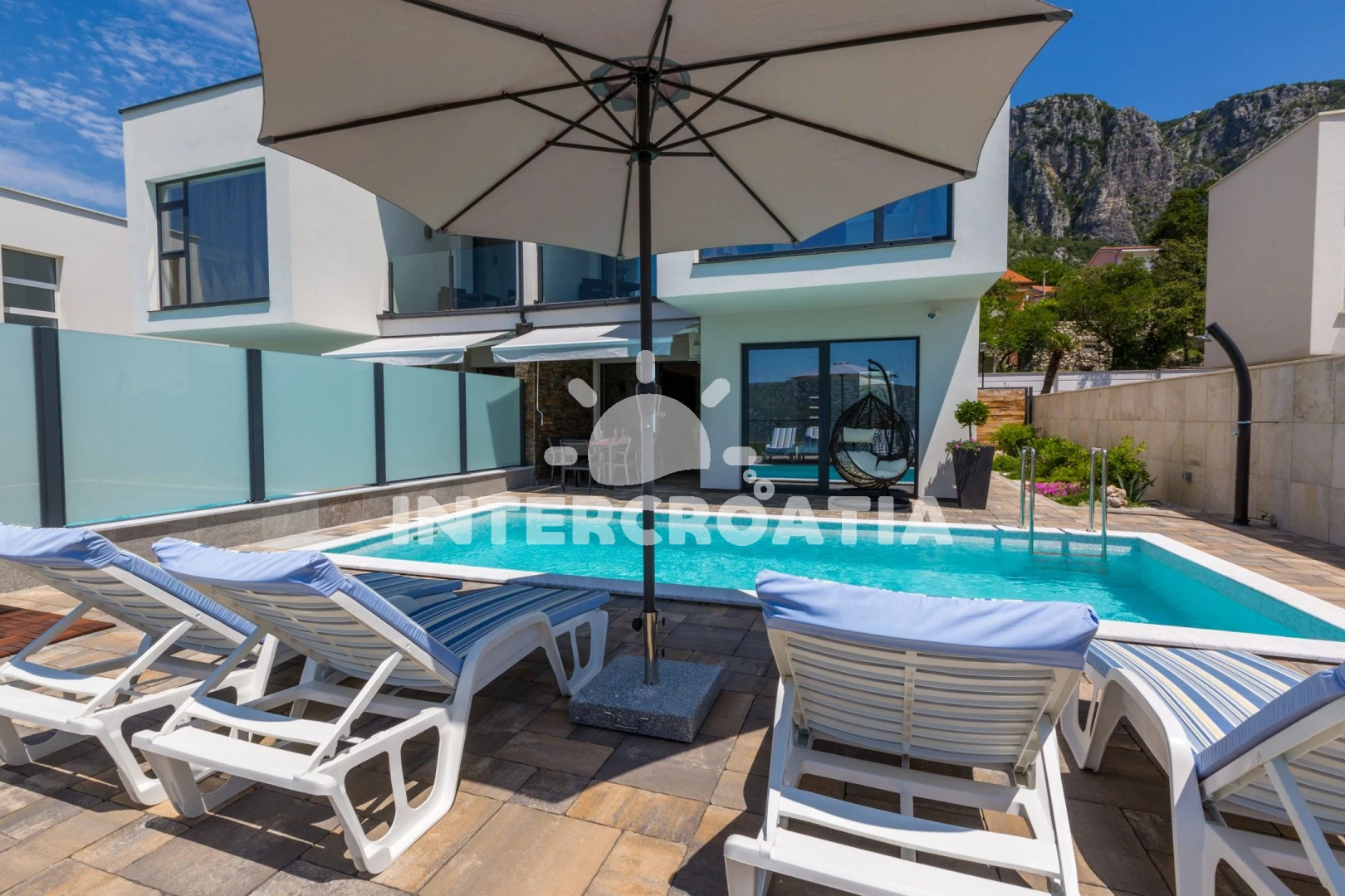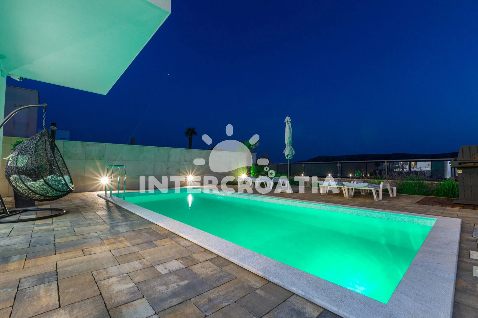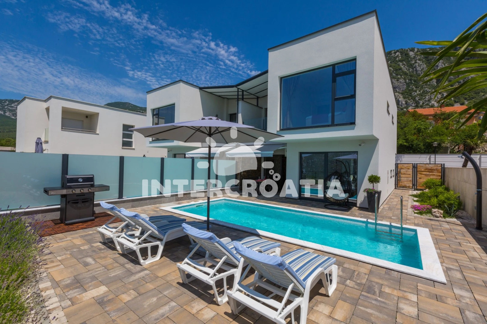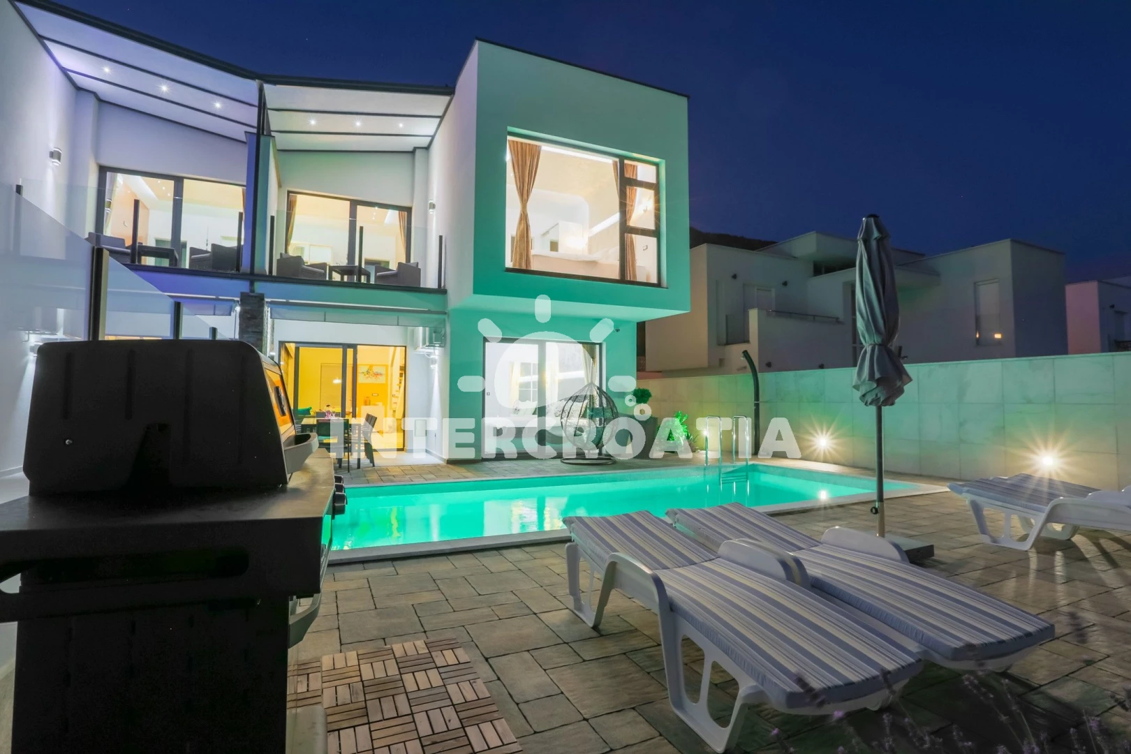 Domek se nachází 5700 m od moře a pláže. Pláž je oblázková a betonové desky. Domek disponuje bazénem s lehátky pro ubytované hosty. U objektu je k dispozici společná zahrada s posezením a grilem. Parkování je před domem.