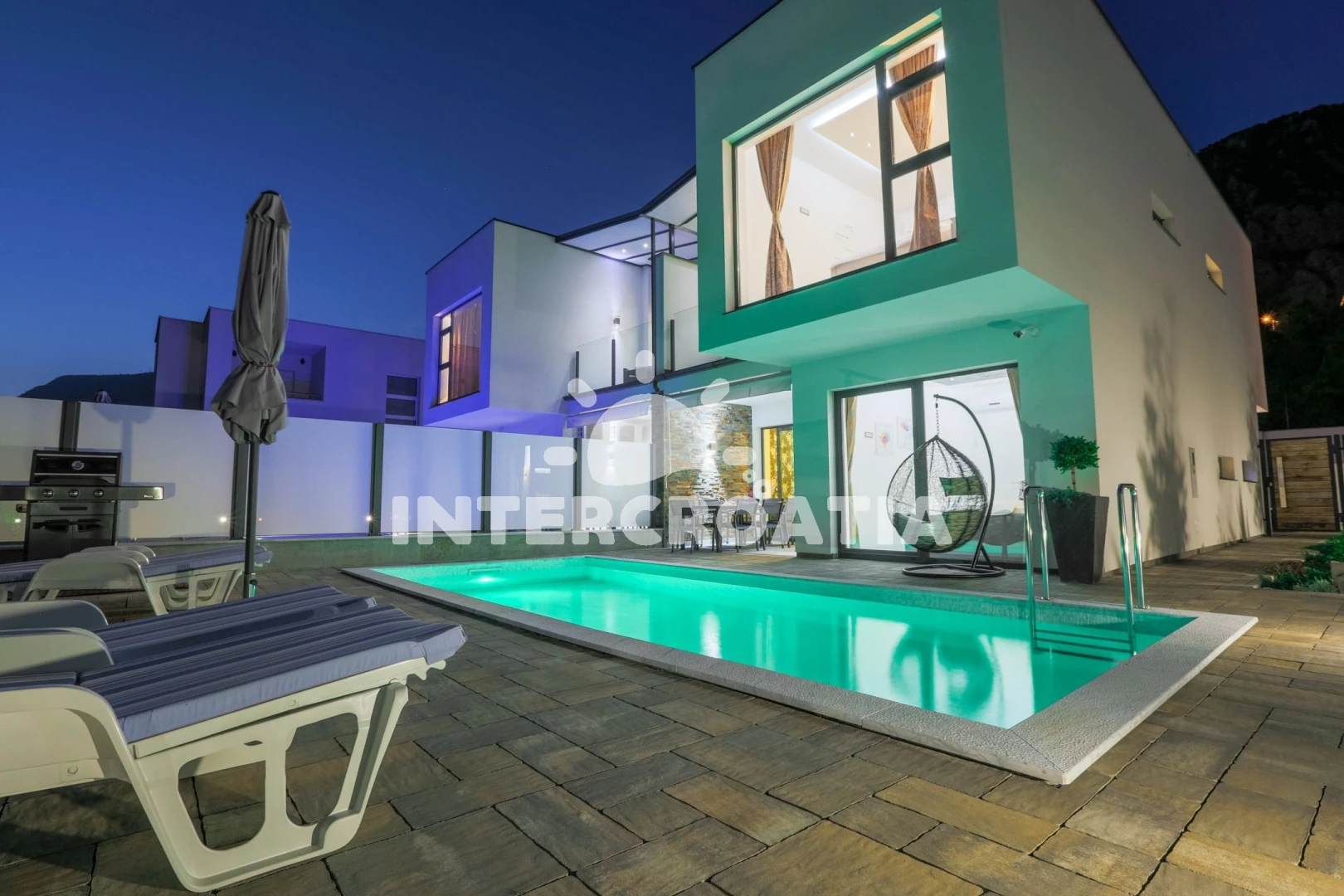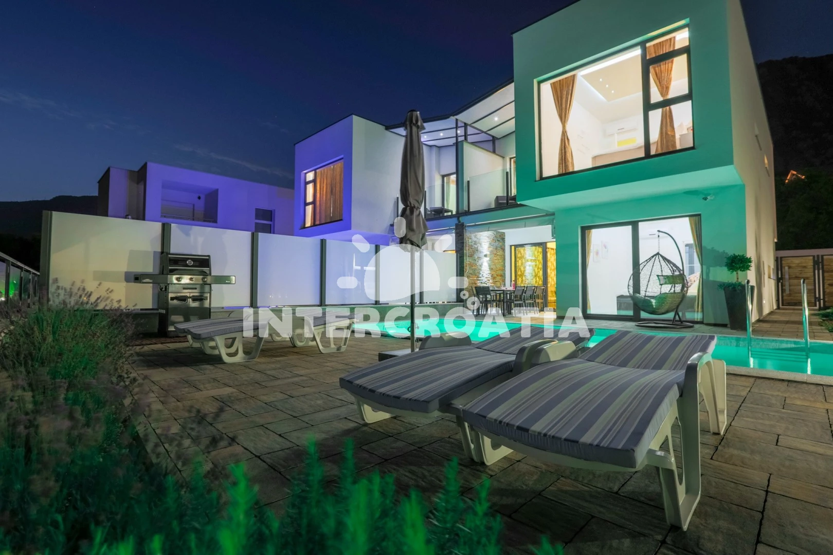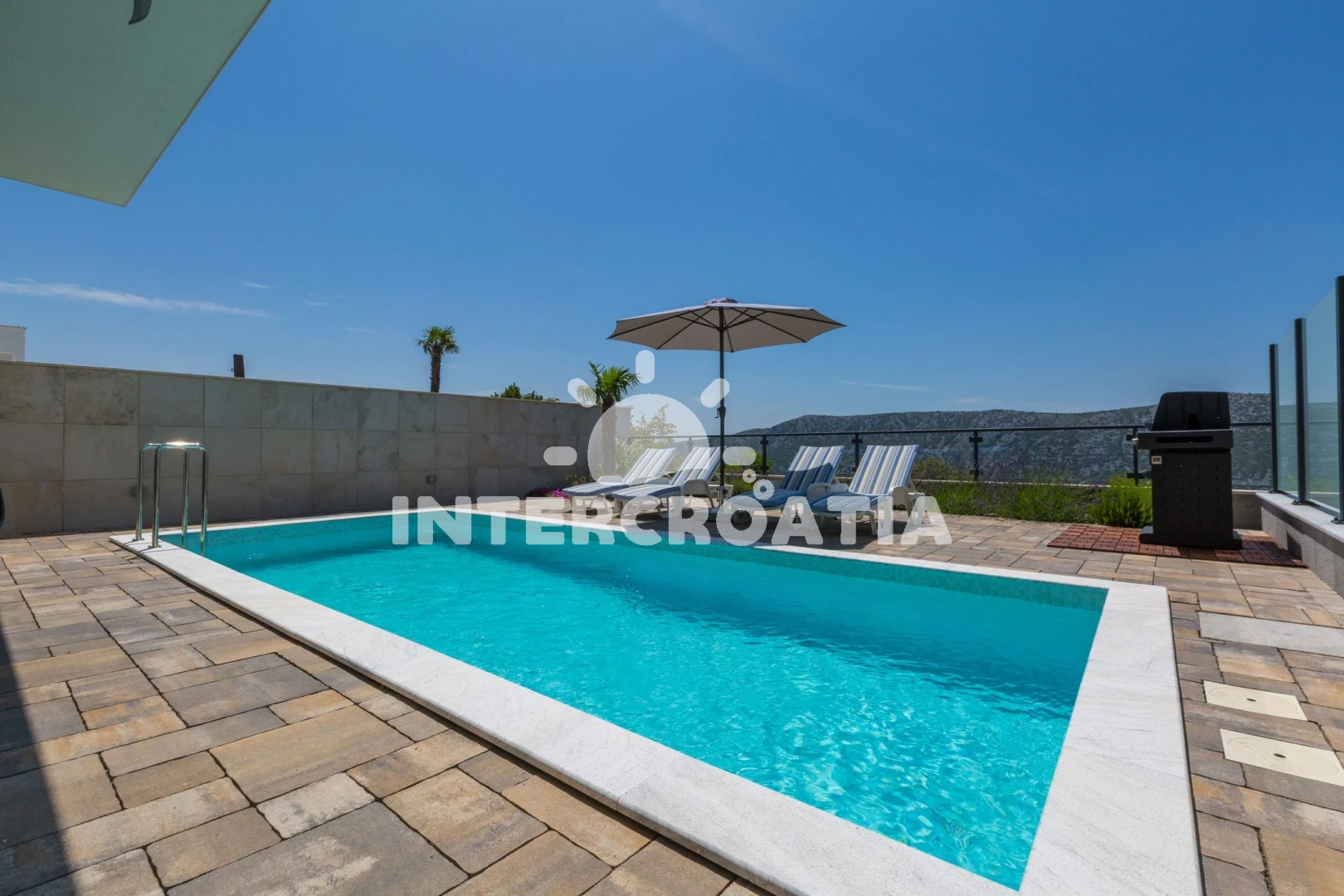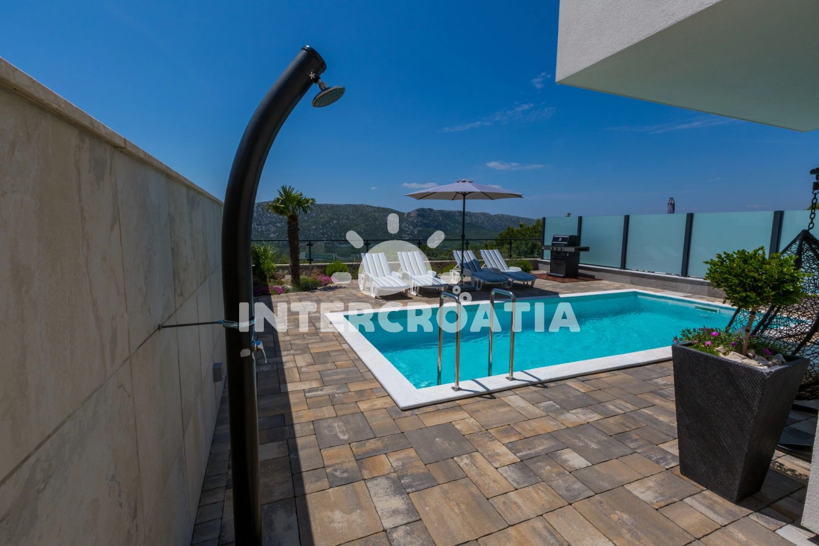 Domek se nachází 5700 m od moře a pláže. Pláž je oblázková a betonové desky. Domek disponuje bazénem s lehátky pro ubytované hosty. U objektu je k dispozici společná zahrada s posezením a grilem. Parkování je před domem.