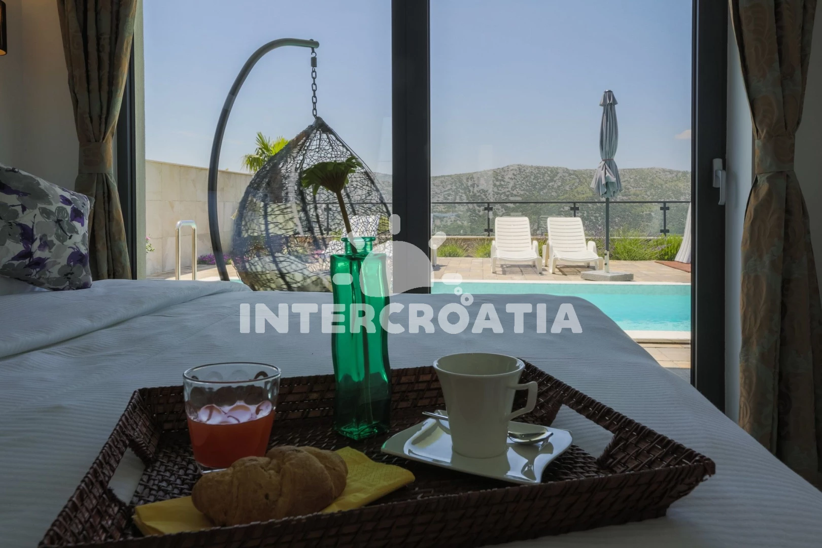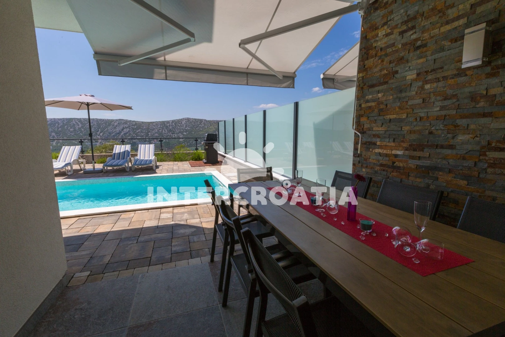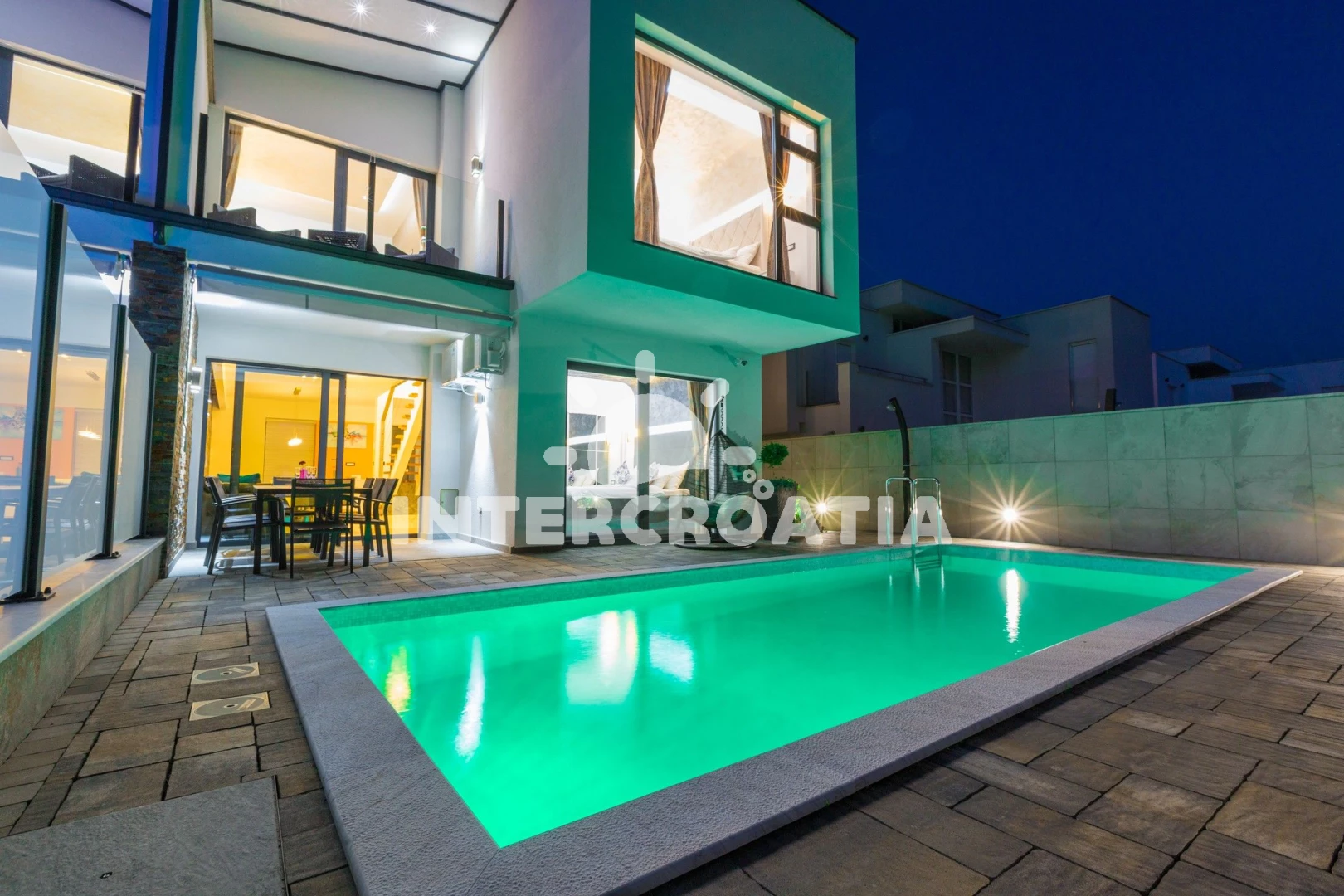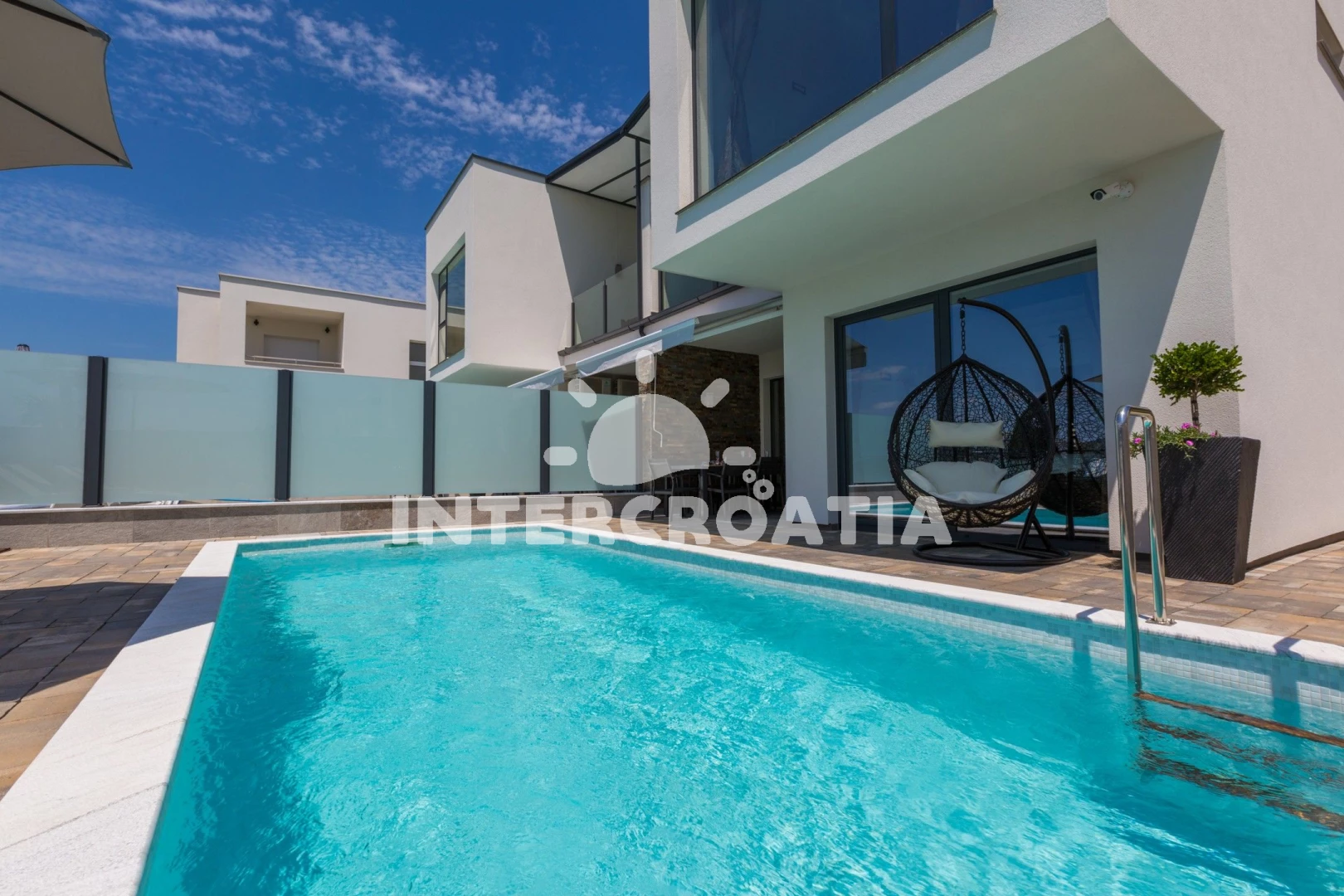 Domek se nachází 5700 m od moře a pláže. Pláž je oblázková a betonové desky. Domek disponuje bazénem s lehátky pro ubytované hosty. U objektu je k dispozici společná zahrada s posezením a grilem. Parkování je před domem.