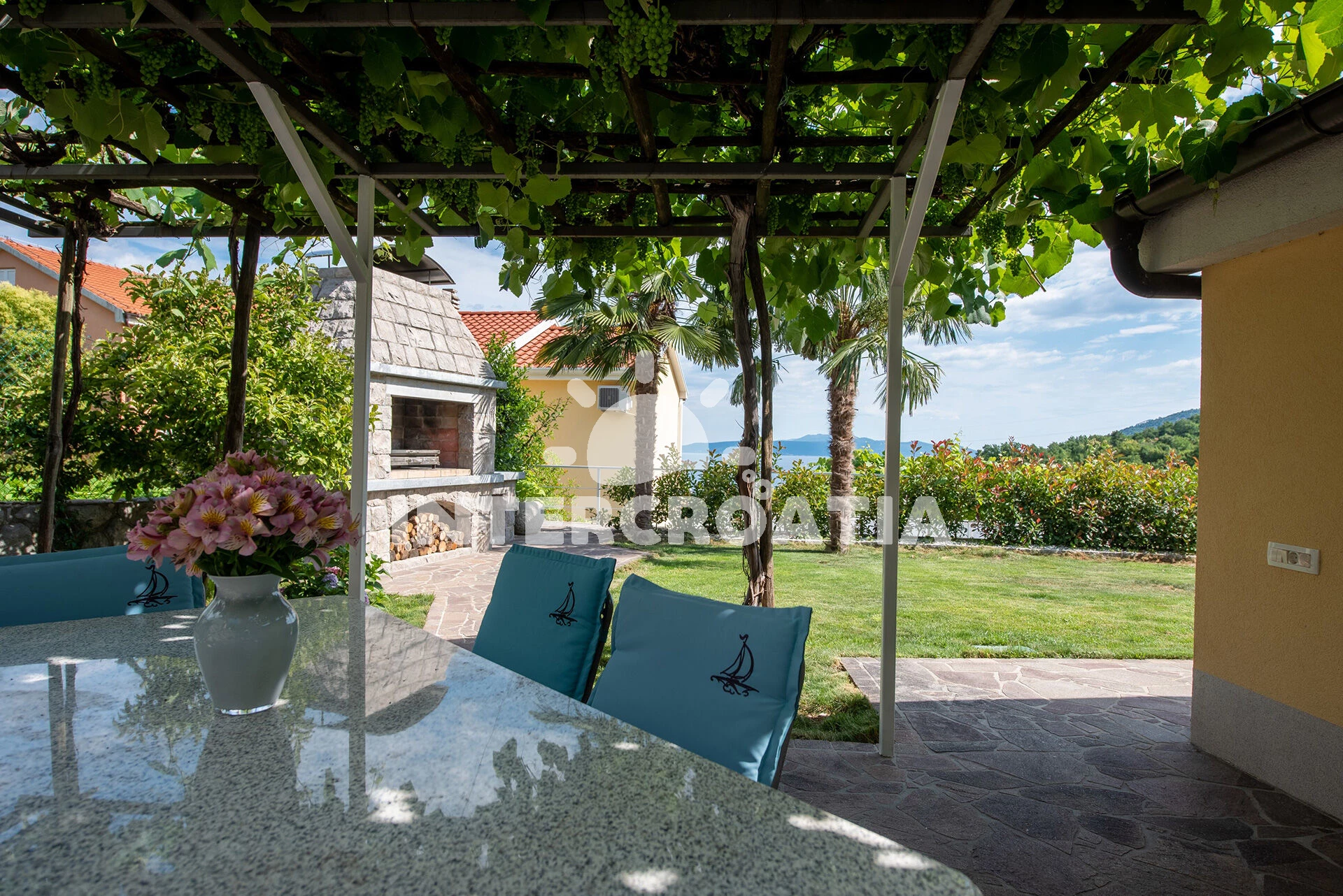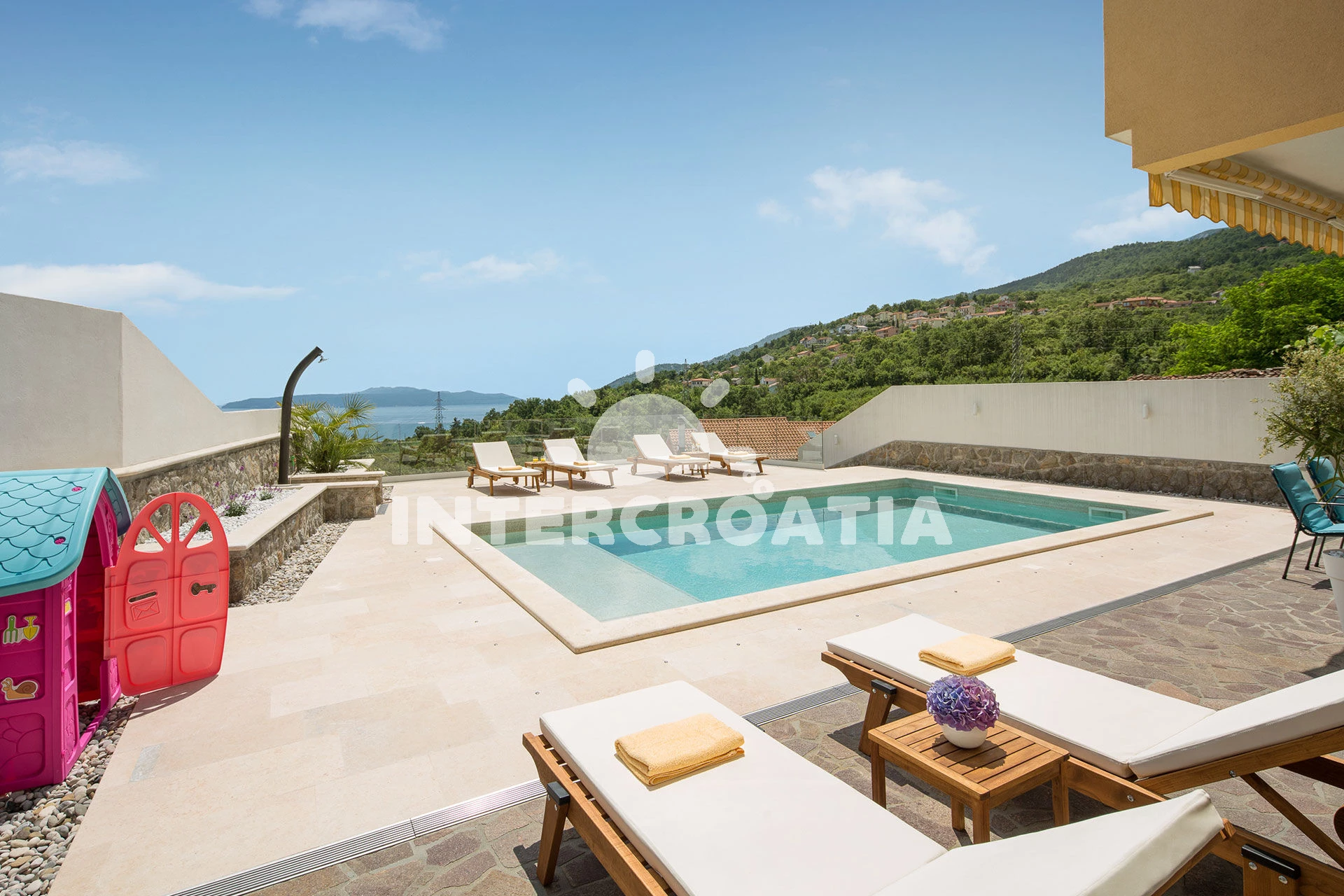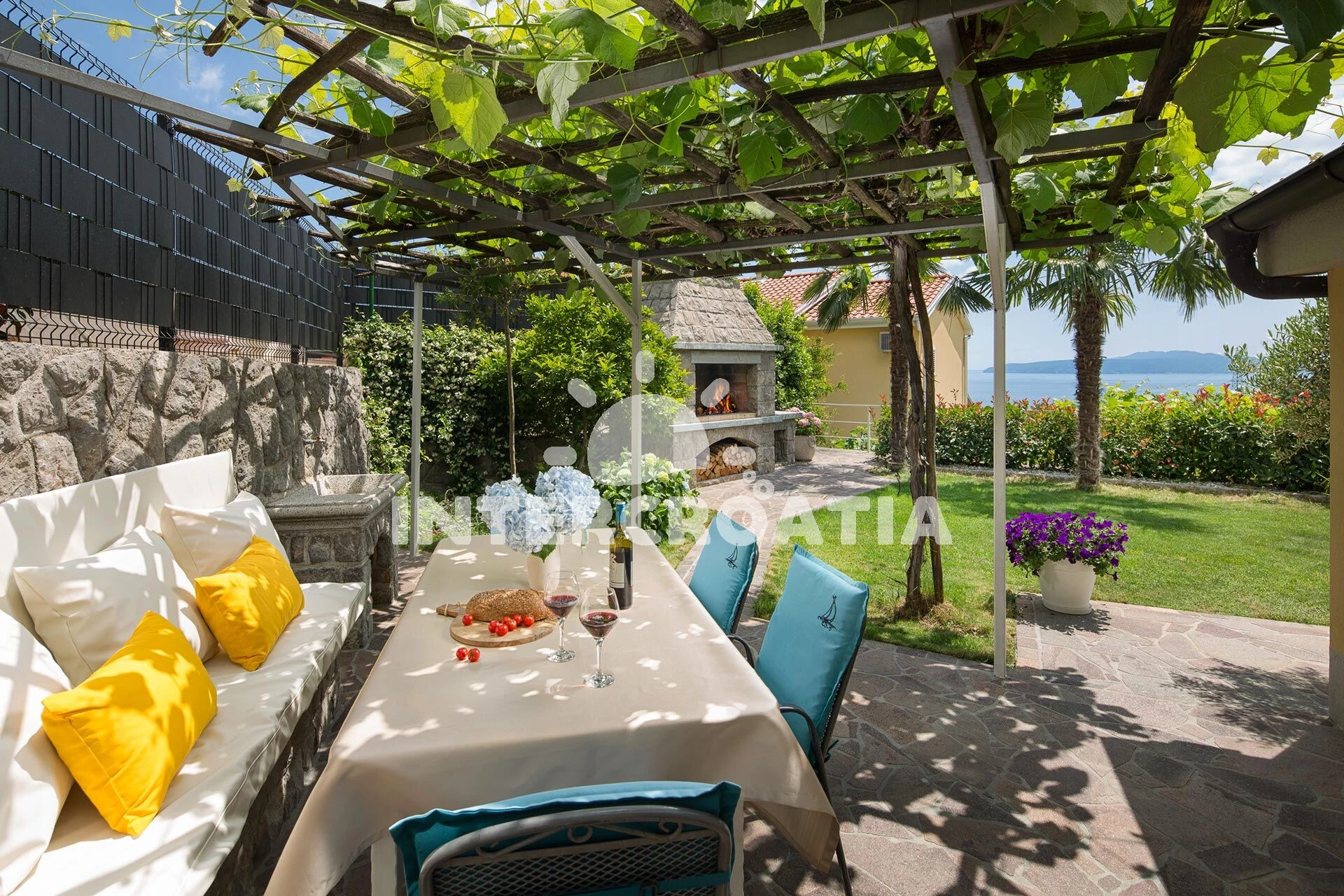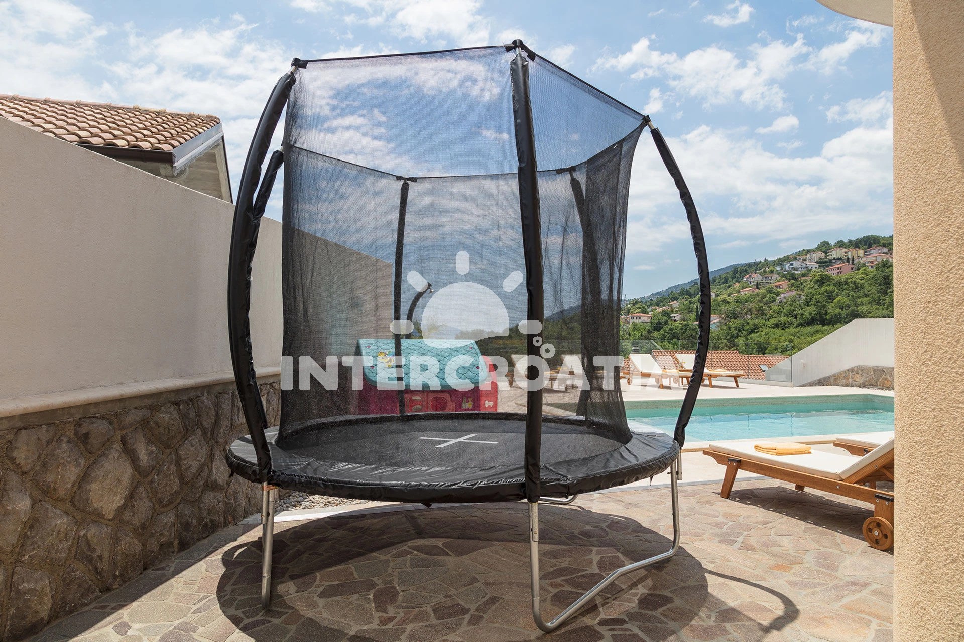 Domek se nachází 3010 m od moře a pláže. Pláž je oblázková a betonové desky. Domek disponuje bazénem s lehátky pro ubytované hosty. U objektu je k dispozici společná zahrada s posezením a grilem. Parkování je před domem.