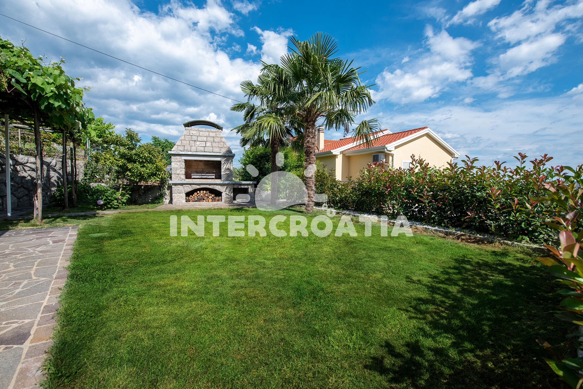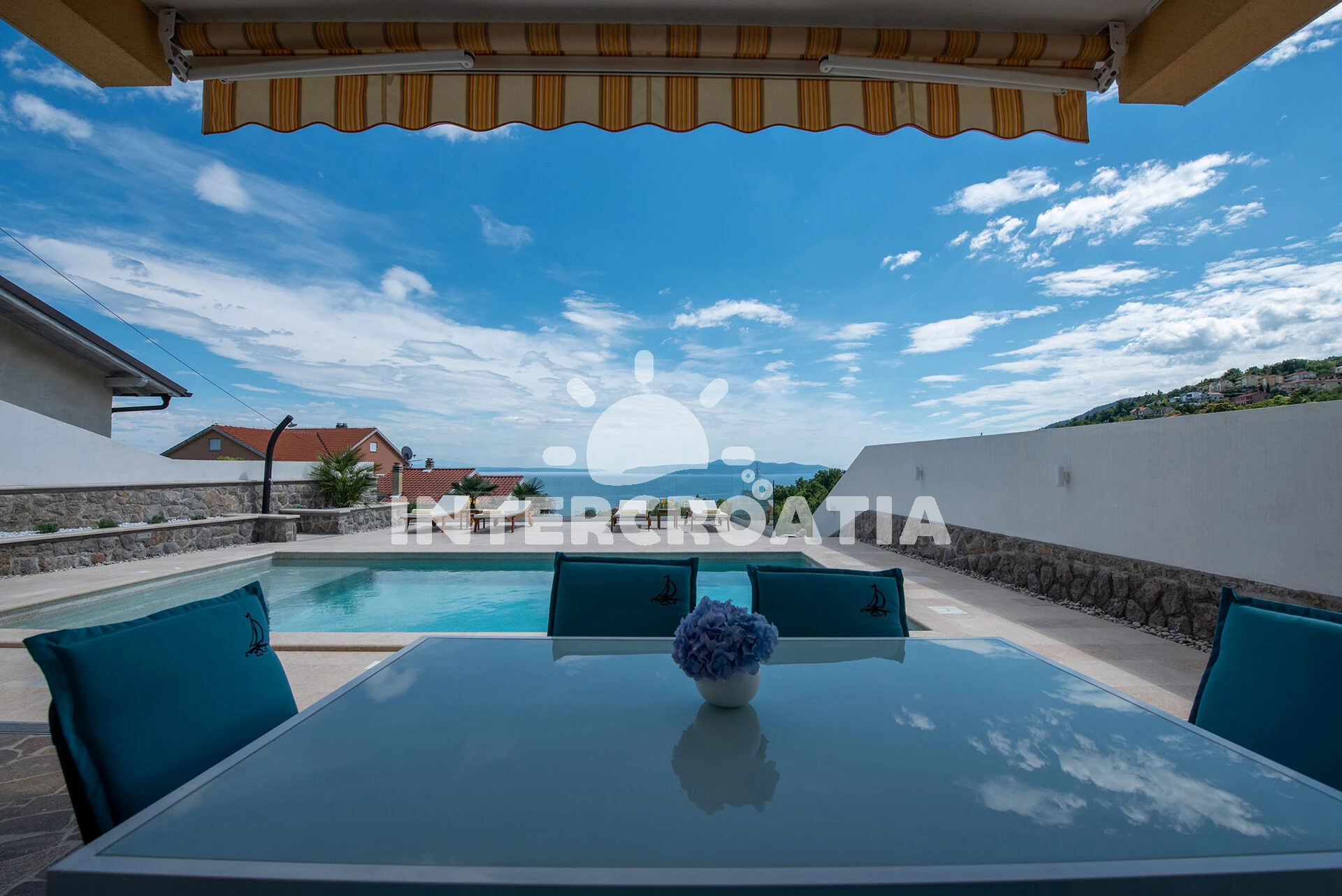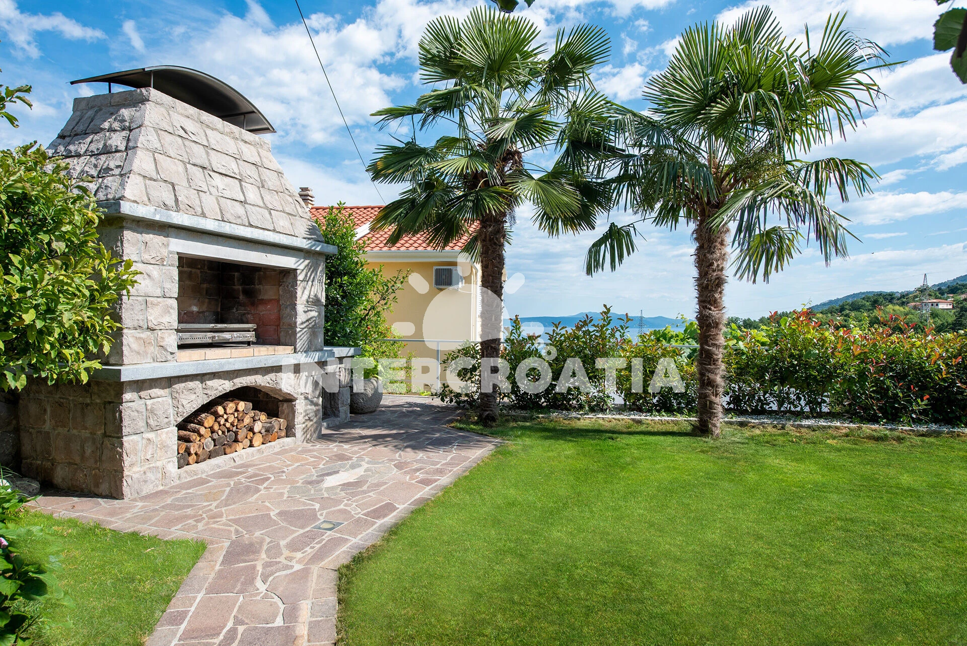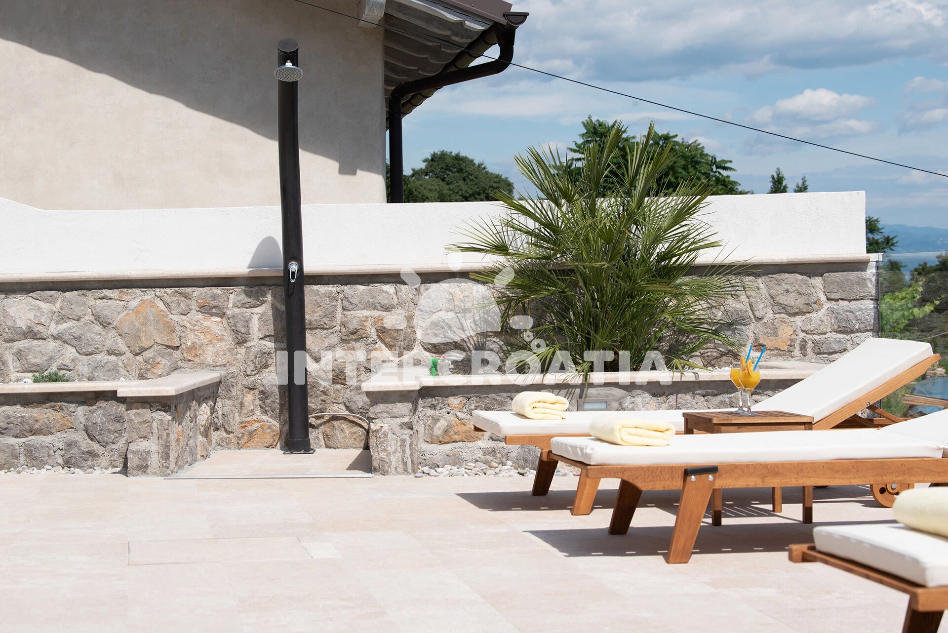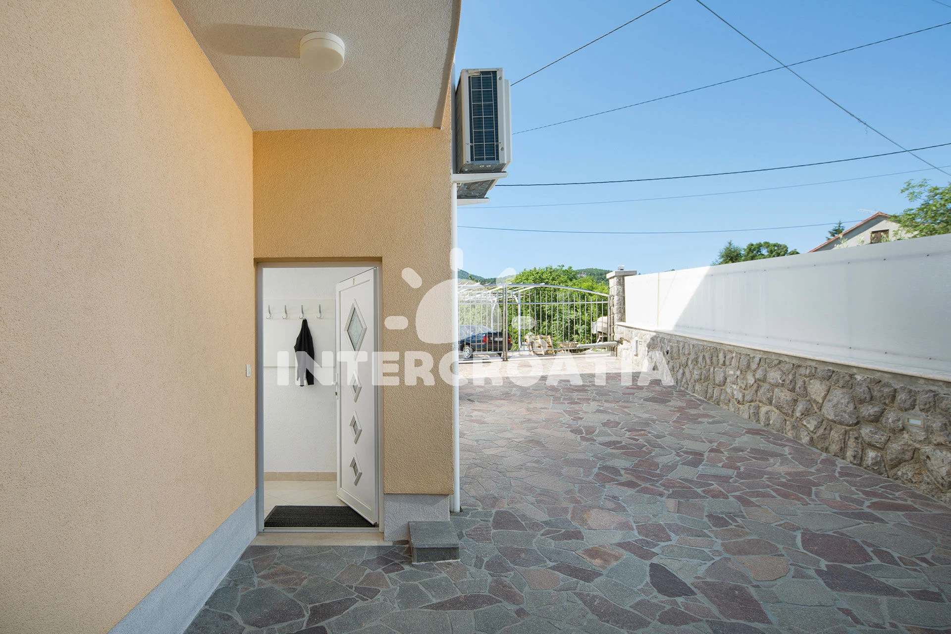 Domek se nachází 3010 m od moře a pláže. Pláž je oblázková a betonové desky. Domek disponuje bazénem s lehátky pro ubytované hosty. U objektu je k dispozici společná zahrada s posezením a grilem. Parkování je před domem.