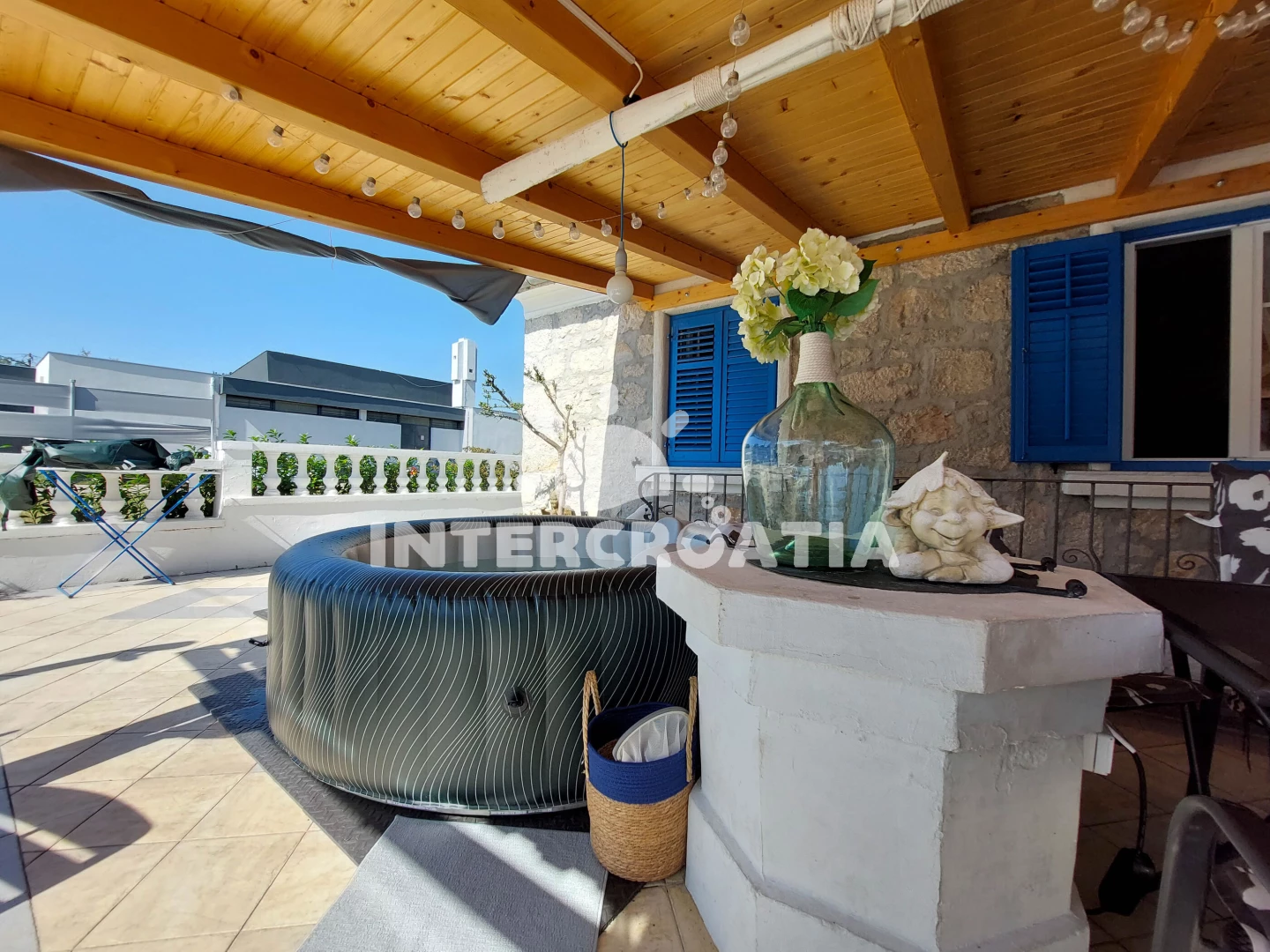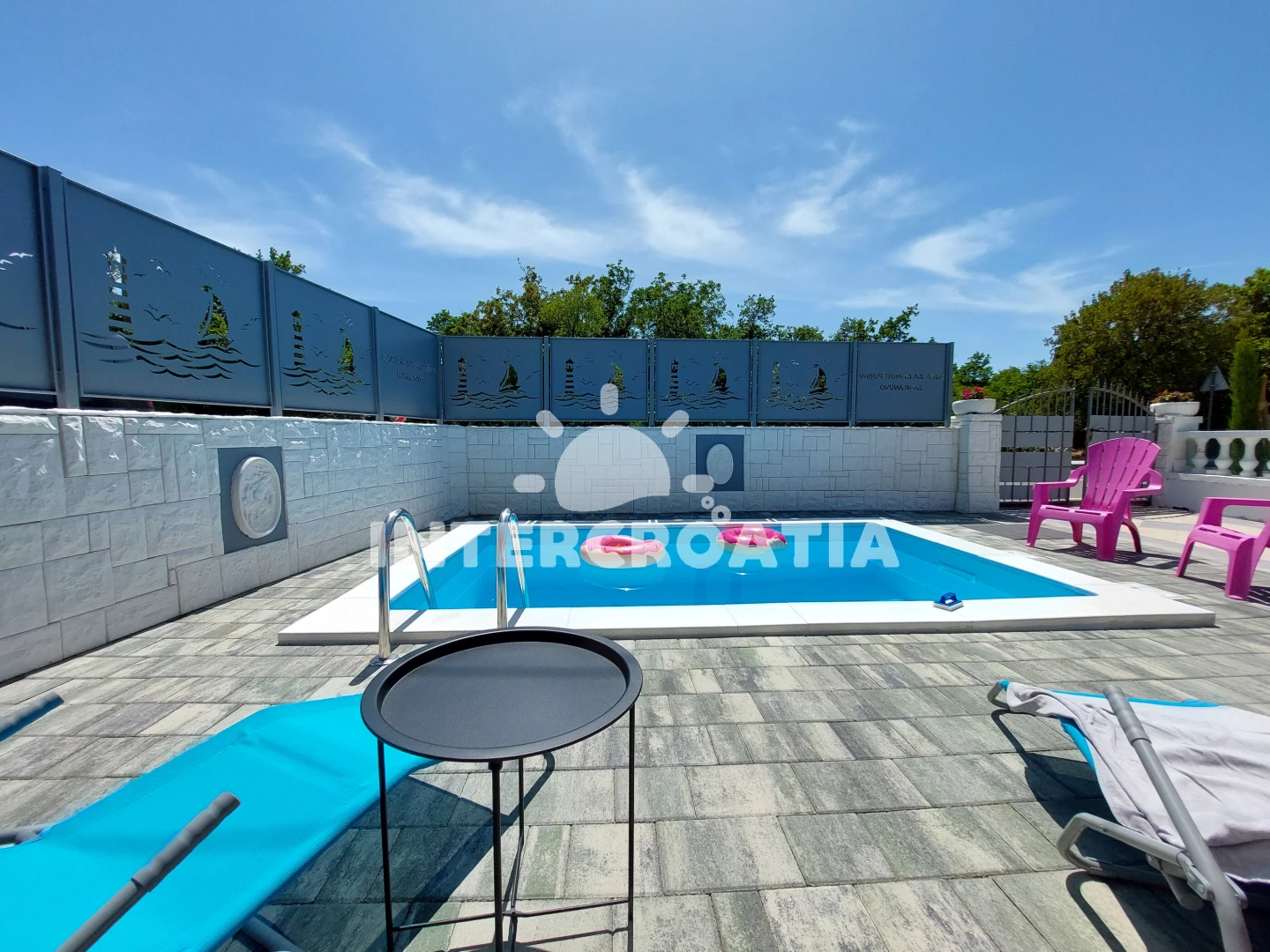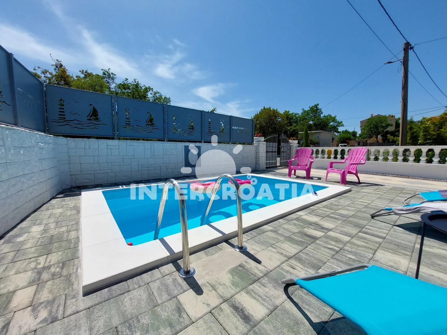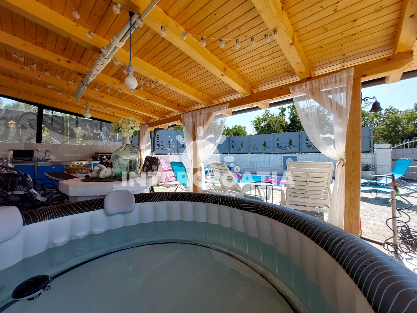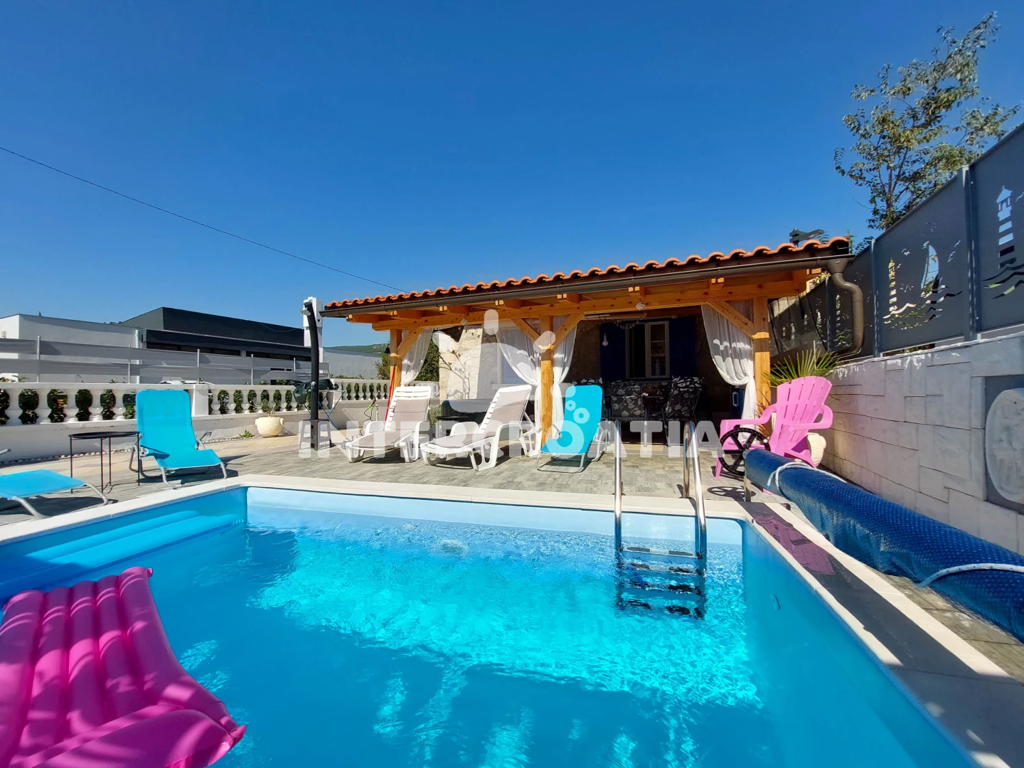Domek se nachází 150 m od moře a pláže. Pláž je oblázková a betonové desky. Domek disponuje bazénem s lehátky pro ubytované hosty. K dispozici vířivka. U objektu je k dispozici společná zahrada s posezením a grilem. Parkování je před domem.