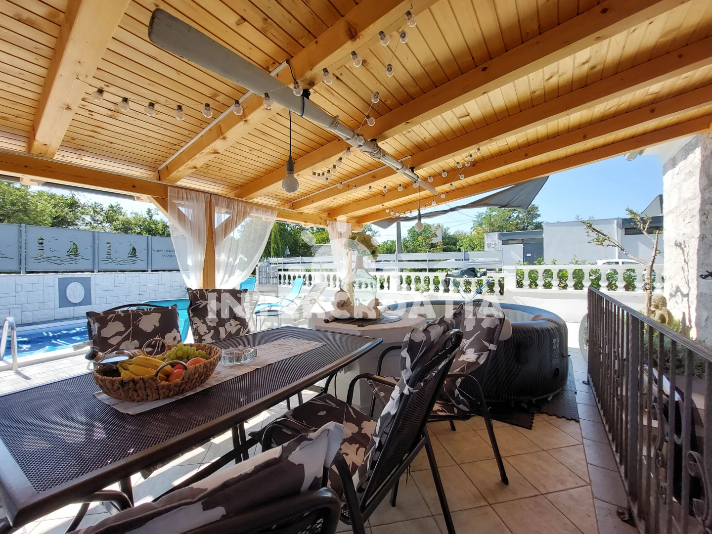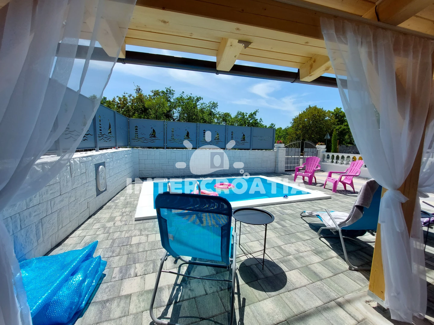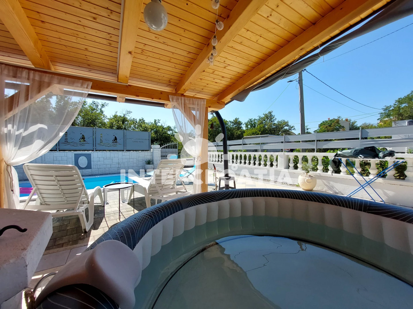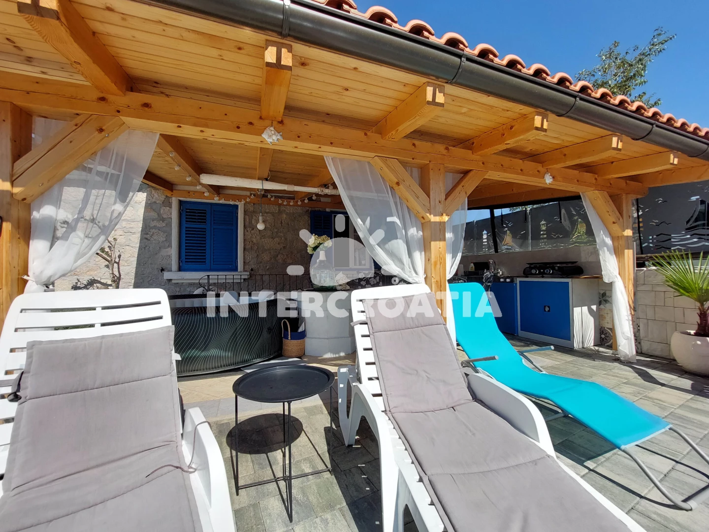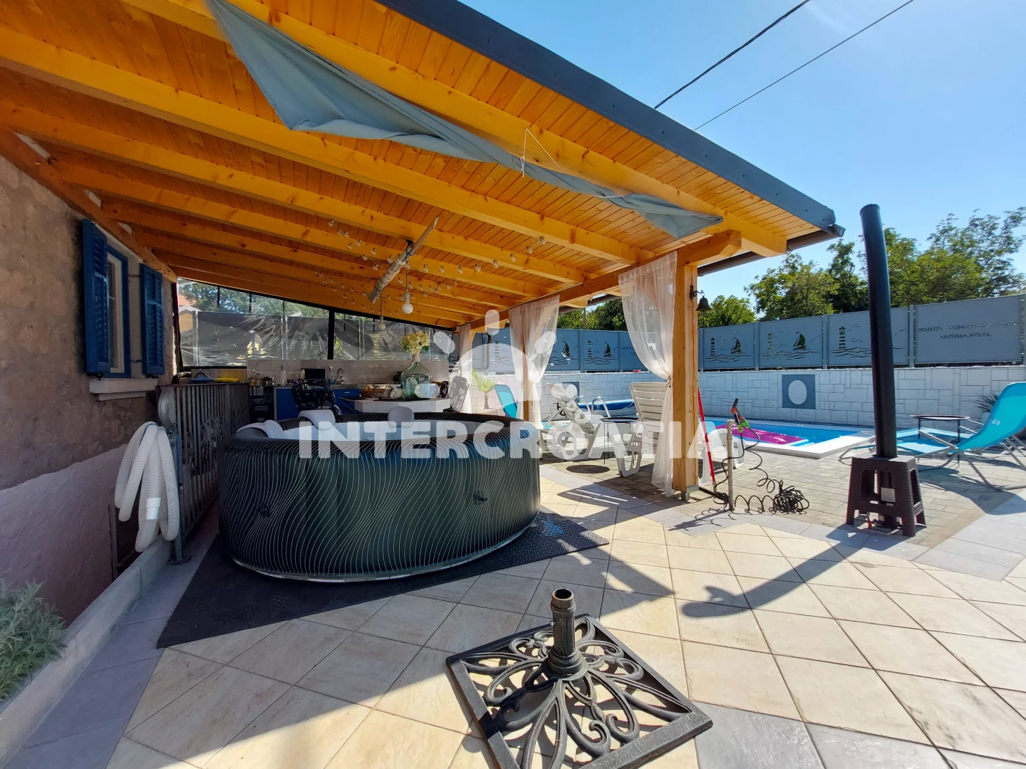 Domek se nachází 150 m od moře a pláže. Pláž je oblázková a betonové desky. Domek disponuje bazénem s lehátky pro ubytované hosty. K dispozici vířivka. U objektu je k dispozici společná zahrada s posezením a grilem. Parkování je před domem.
