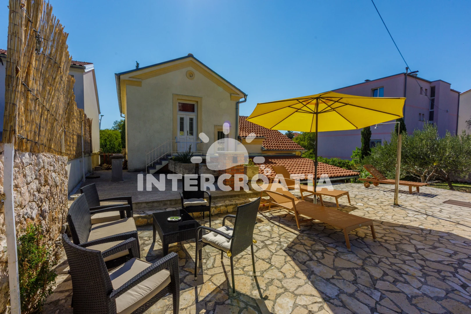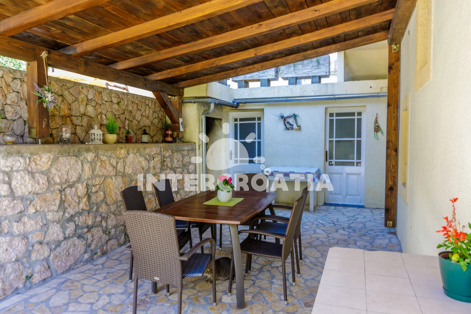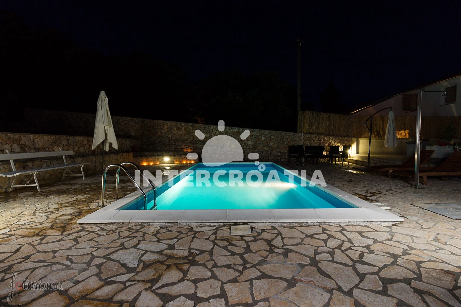 Domek se nachází 100 m od moře a pláže. Pláž je skalnatá, oblázková a betonové desky. Domek disponuje bazénem s lehátky pro ubytované hosty. U objektu je k dispozici společná zahrada s posezením a grilem. Parkování je před domem.