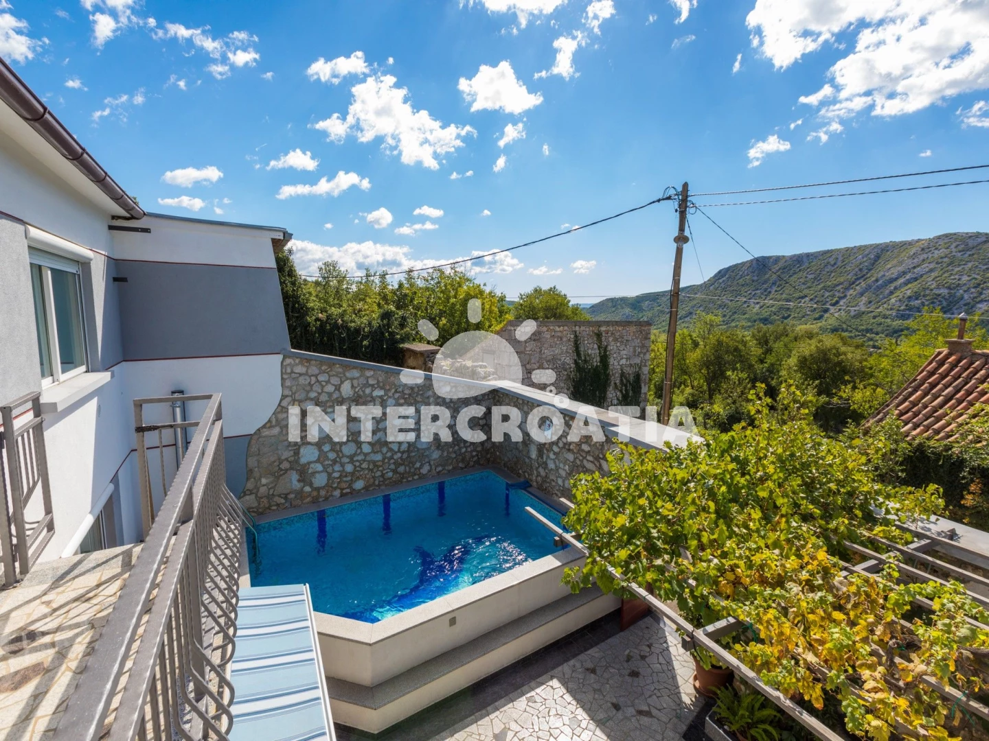 Domek se nachází 6000 m od moře a pláže. Pláž je oblázková a betonové desky. Domek disponuje bazénem s lehátky pro ubytované hosty. U objektu je k dispozici společná zahrada s posezením a grilem. Parkování je před domem.
