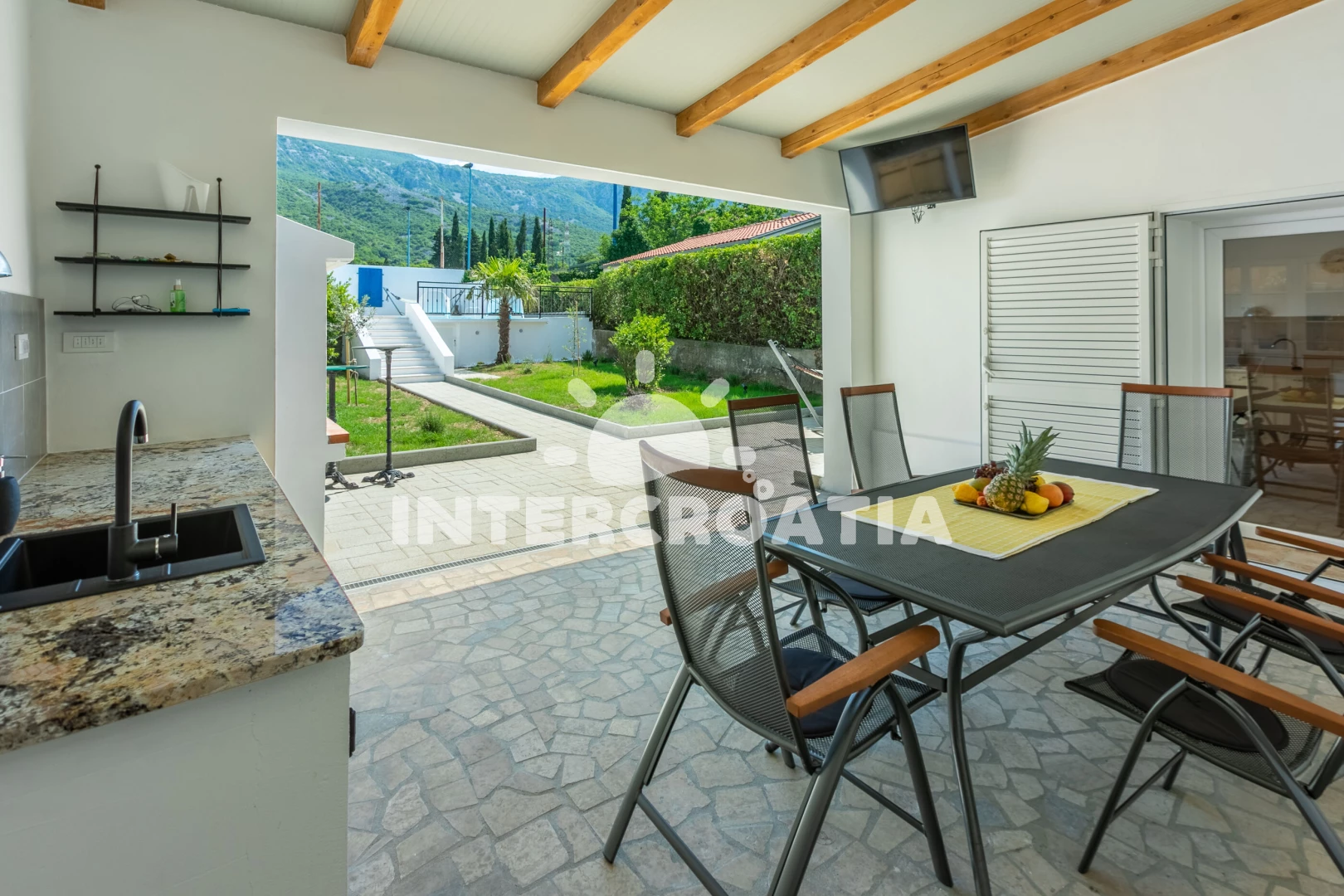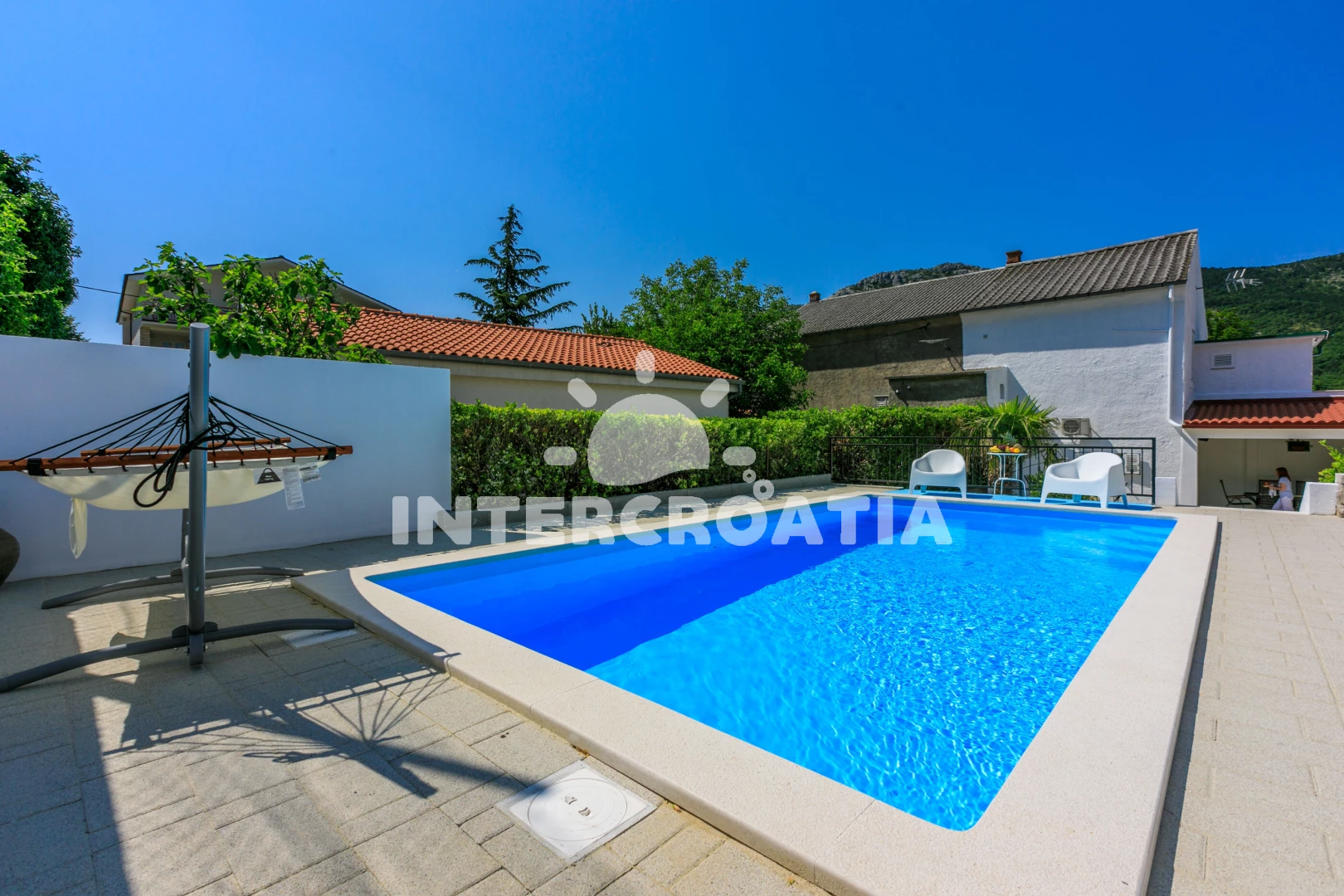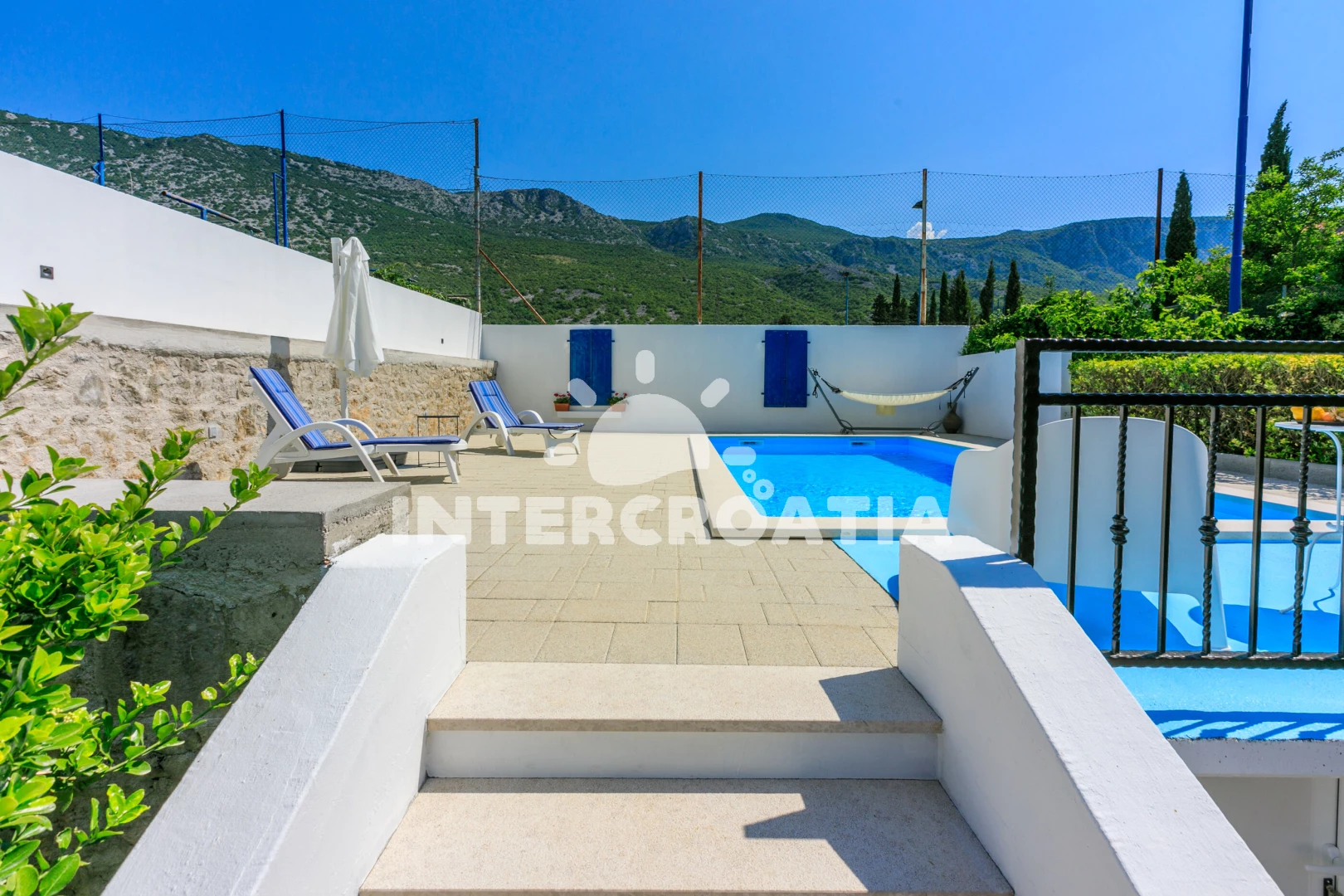 Domek se nachází 6200 m od moře a pláže. Pláž je oblázková a betonové desky. Domek disponuje bazénem s lehátky pro ubytované hosty. U objektu je k dispozici společná zahrada s posezením a grilem. Parkování je před domem.