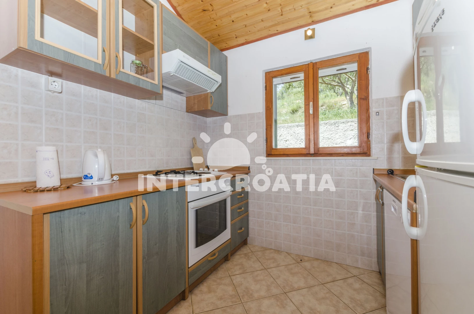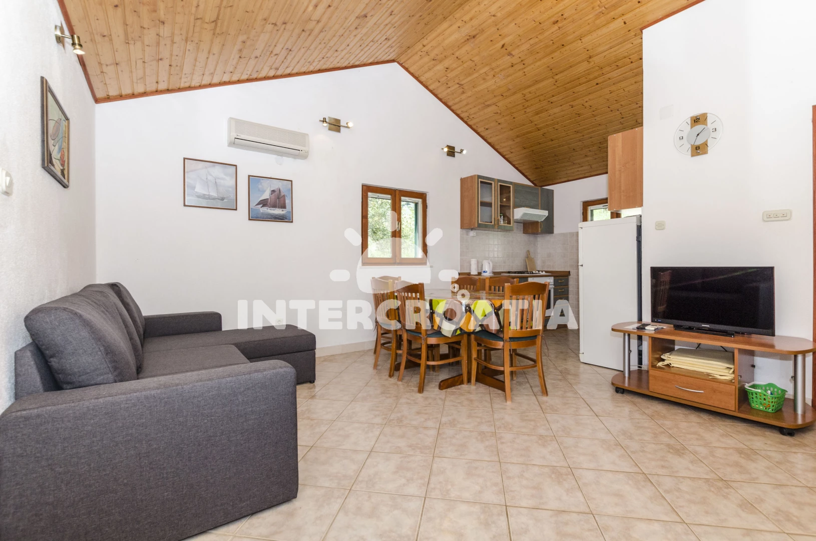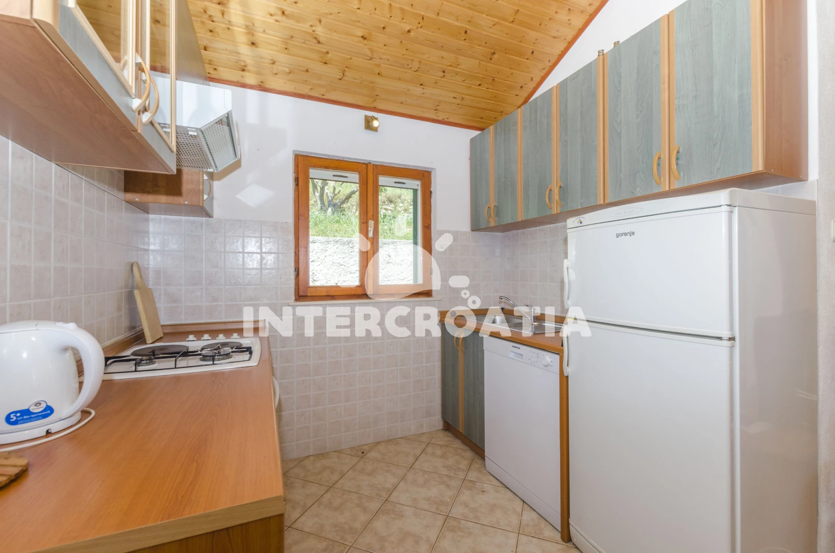 Domek (2). Domek má 1 ložnici a je vhodný pro až 2 osoby. Kuchyňská linka je vybavena varnou deskou, kávovarem, troubou, rychlovarnou konvicí, nádobím, lednicí. V obývací místnosti je rozložitelná pohovka (extra lůžko pro osoby). K dispozici televize, žehlička.