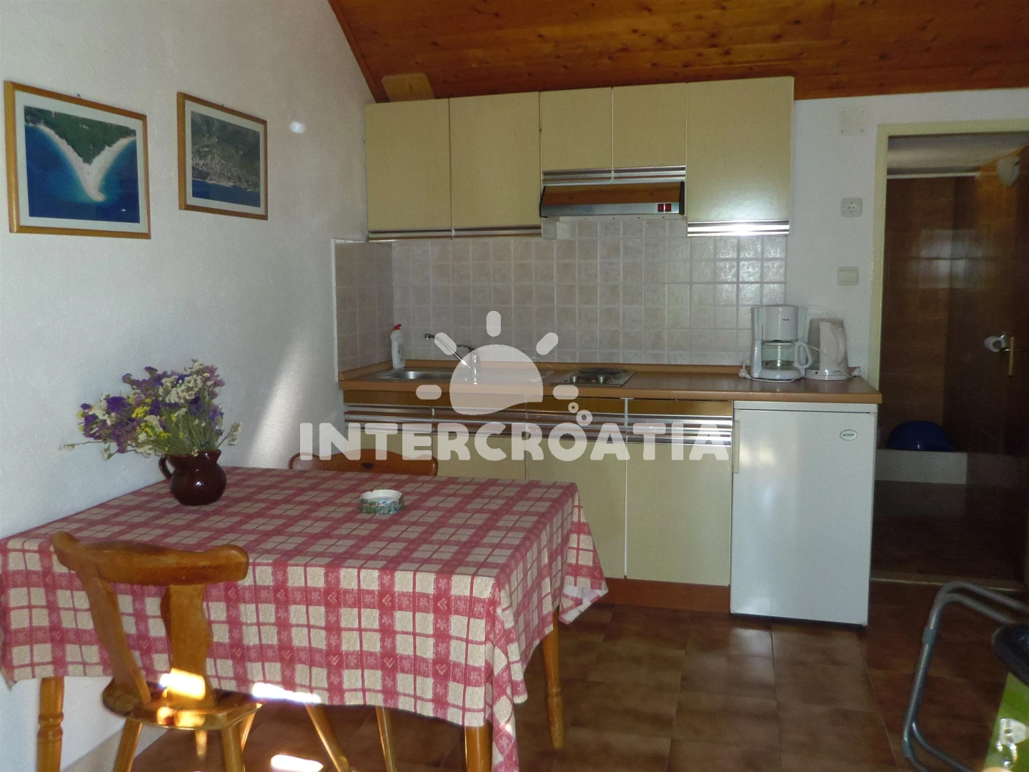 Domek (2). Domek má 1 ložnici a je vhodný pro až 0 osoby. Kuchyňská linka je vybavena varnou deskou, kávovarem, rychlovarnou konvicí, nádobím, lednicí, mrazákem. V obývací místnosti je rozložitelná pohovka (extra lůžko pro osoby). K dispozici televize, žehlička.