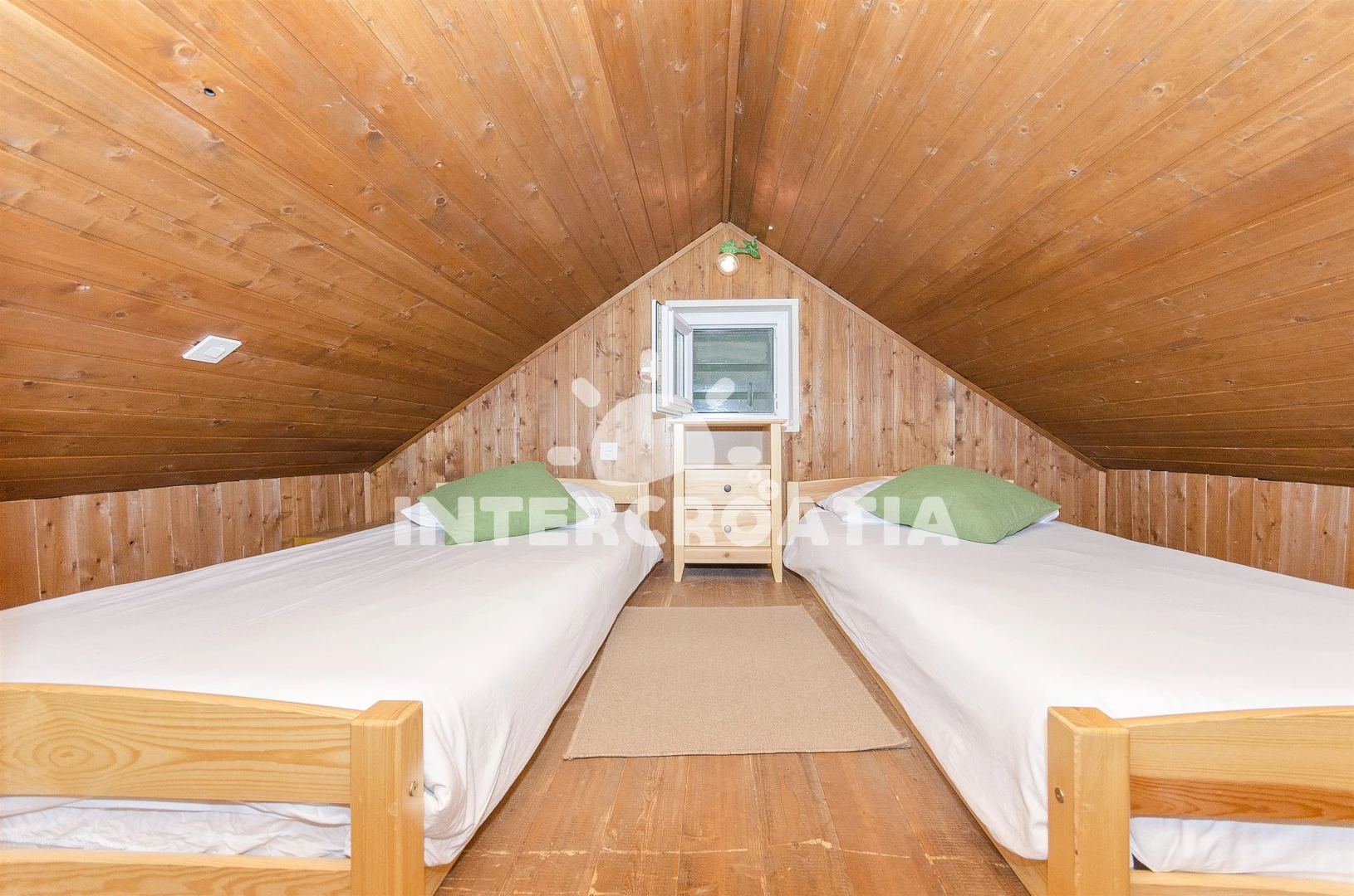 Domek (45 m2). Domek má 2 ložnice a je vhodný pro až 4 osoby. Kuchyňská linka je vybavena varnou deskou, troubou, kávovarem, toustovačem, myčkou na nádobí, rychlovarnou konvicí, nádobím, lednicí, mrazákem. K dispozici televize se satelitním programem, radio, žehlička. První ložnice s dvoulůžkem. Druhá ložnice se 2 jednolůžky. Koupelna se sprchovým koutem, umyvadlem, fénem a WC.