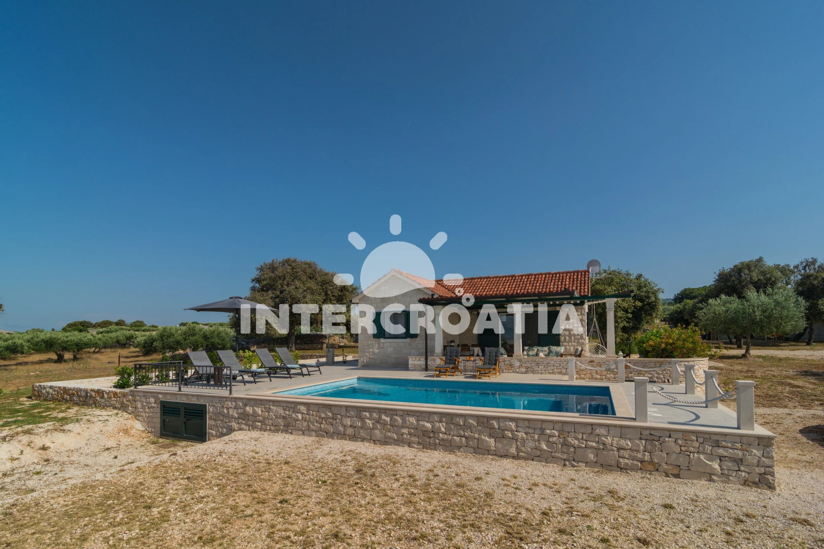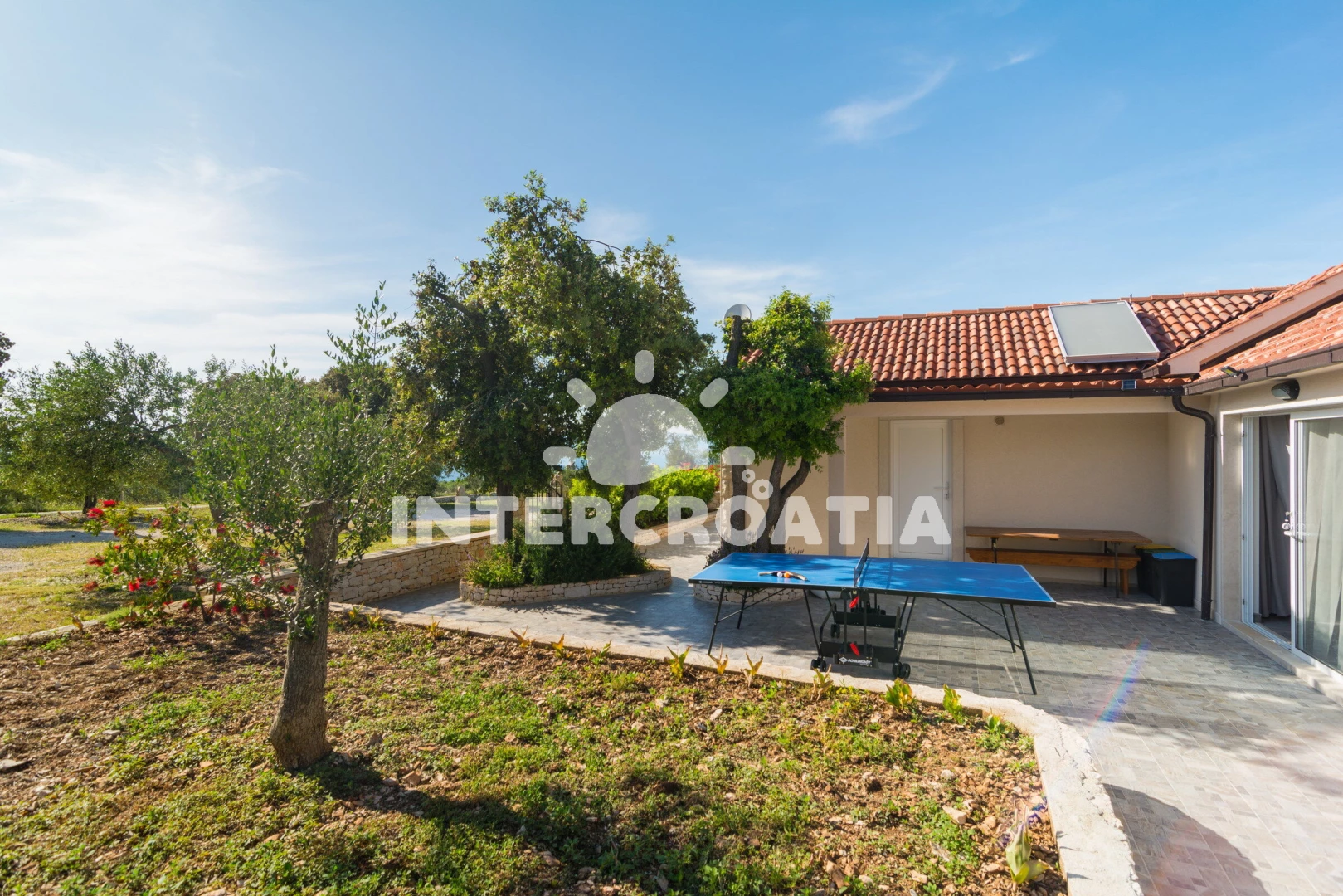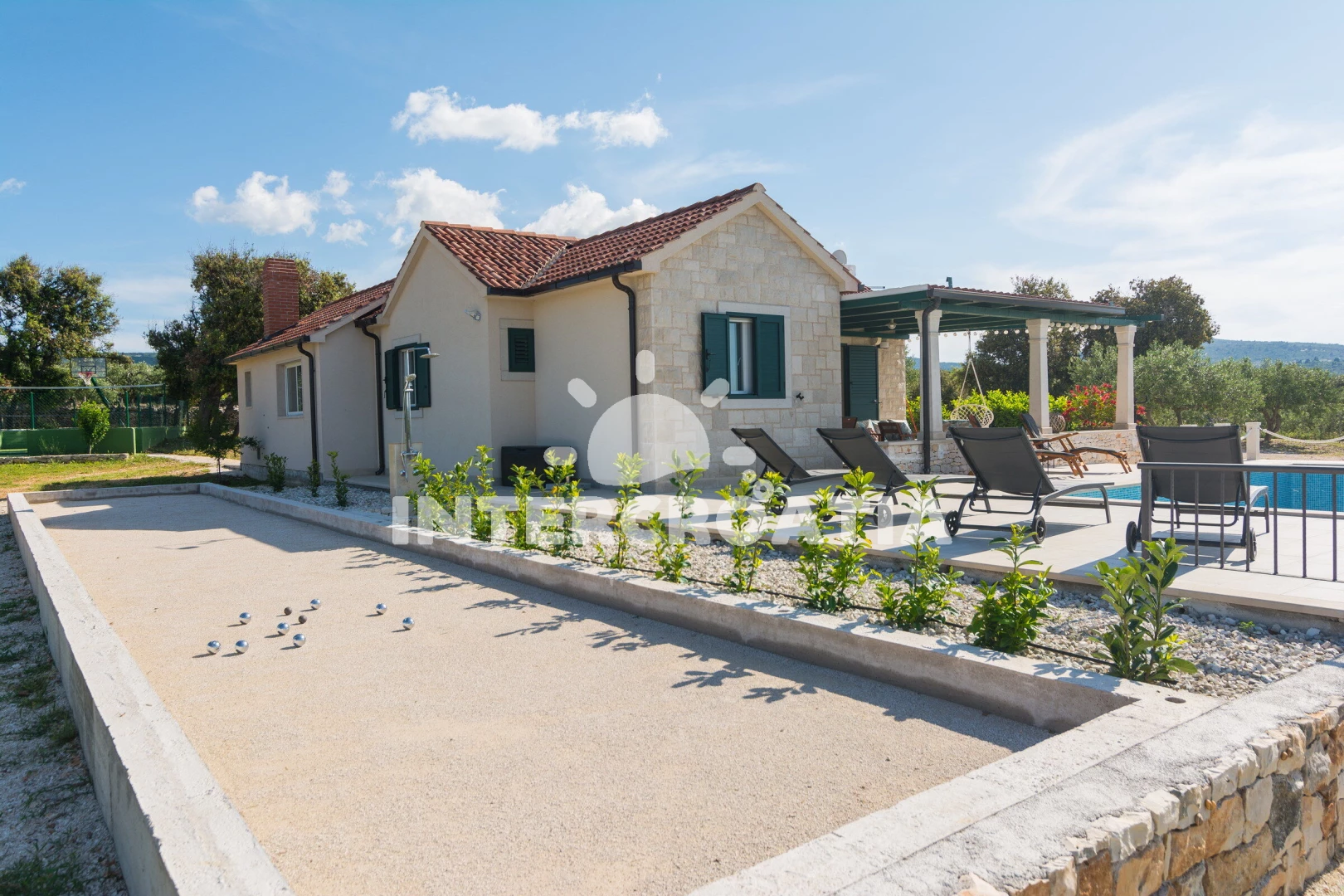 Domek se nachází 1200 m od moře a pláže. Pláž je oblázková a betonové desky. Domek disponuje bazénem s lehátky pro ubytované hosty. K dispozici posilovna. U objektu je k dispozici společná zahrada s posezením a grilem. Parkování je před domem.