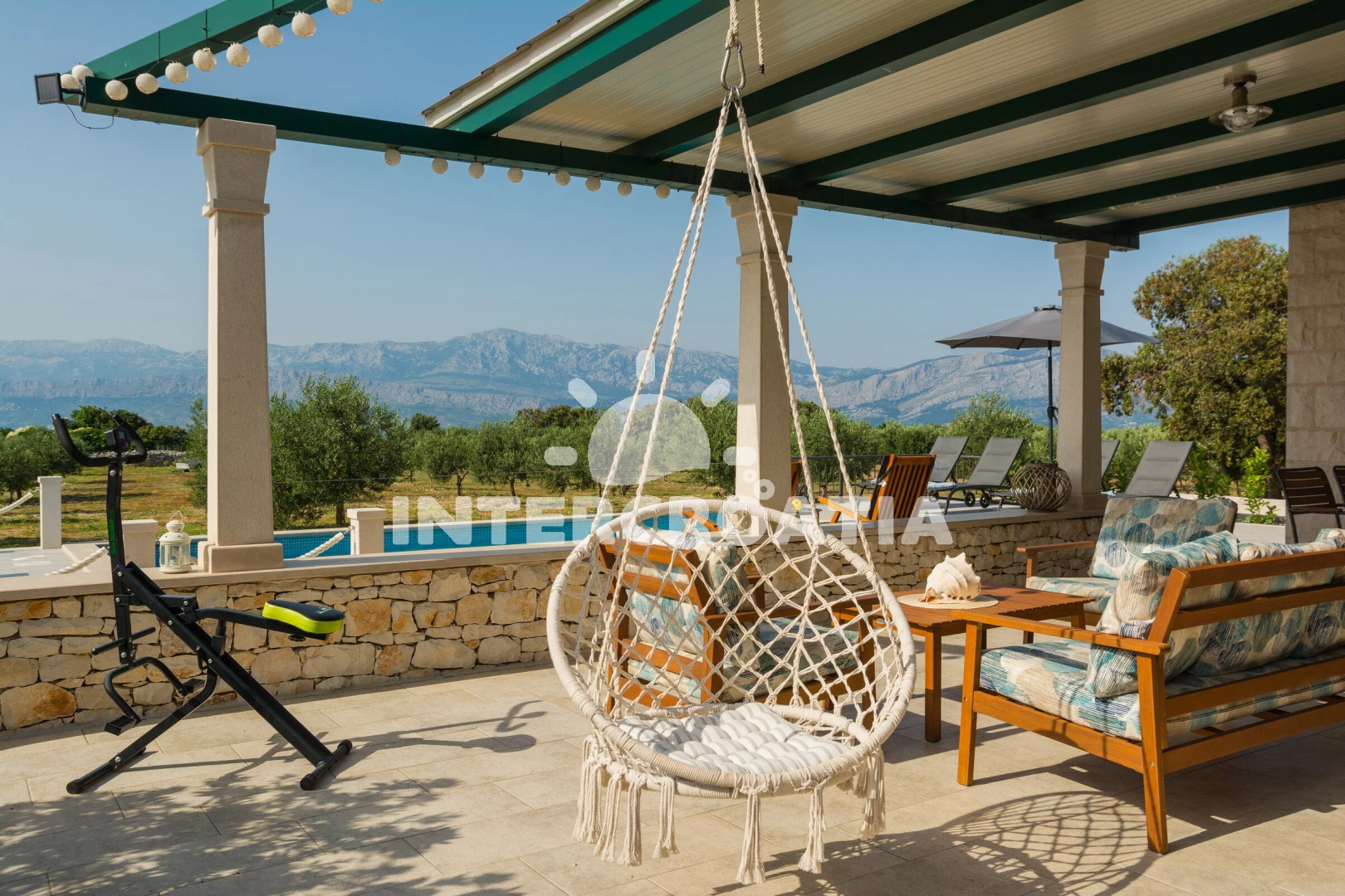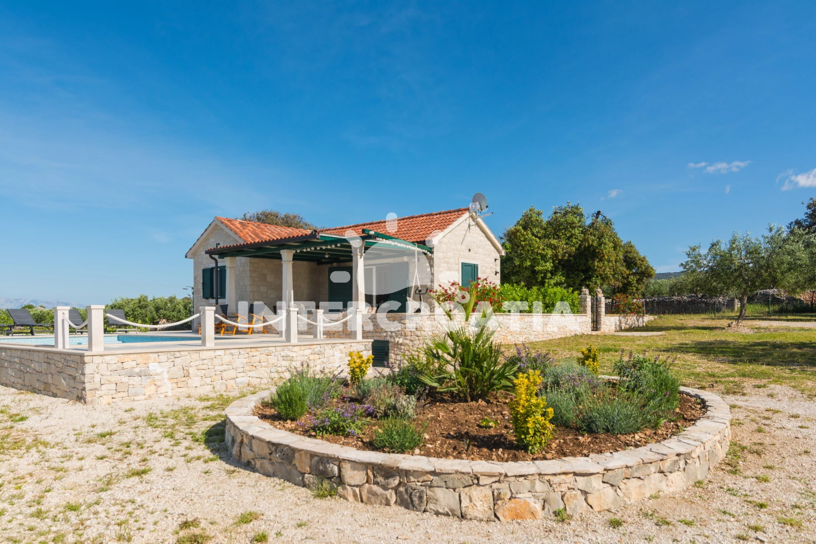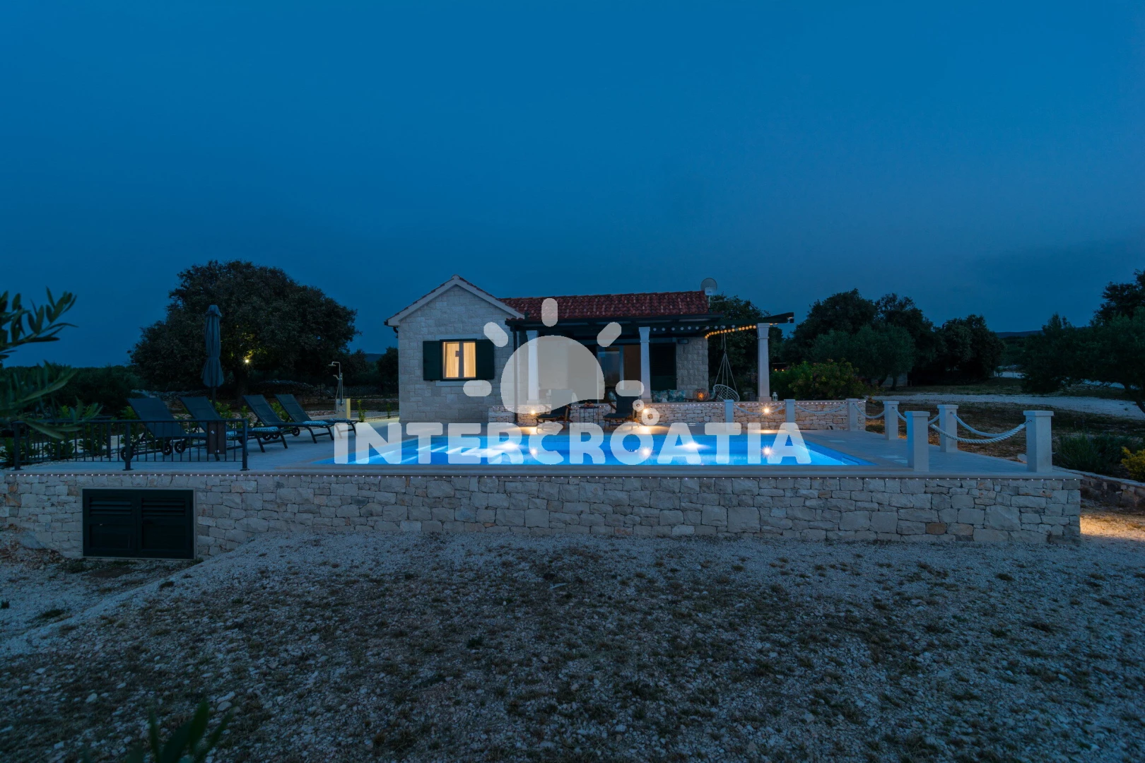 Domek se nachází 1200 m od moře a pláže. Pláž je oblázková a betonové desky. Domek disponuje bazénem s lehátky pro ubytované hosty. K dispozici posilovna. U objektu je k dispozici společná zahrada s posezením a grilem. Parkování je před domem.