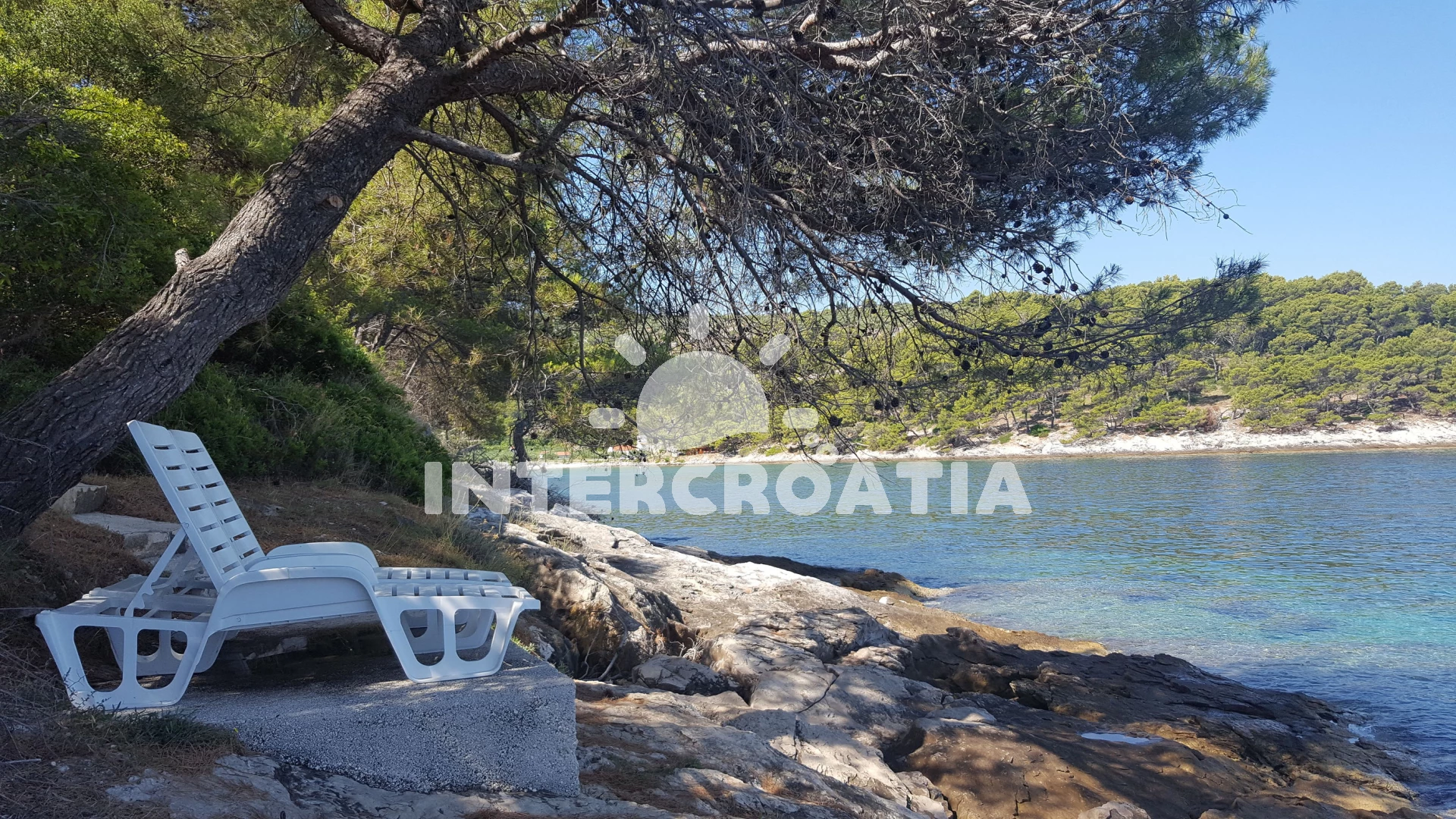 Predivna privatna stjenovita plaža u hladu sa ležajkama. Osama, tišina, cvrčci, šum valova.