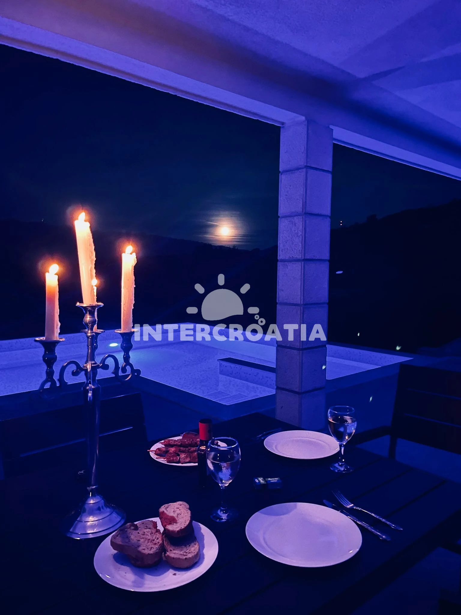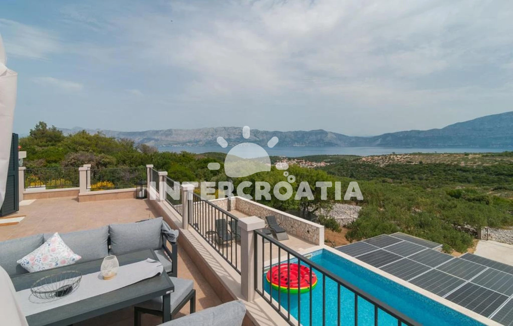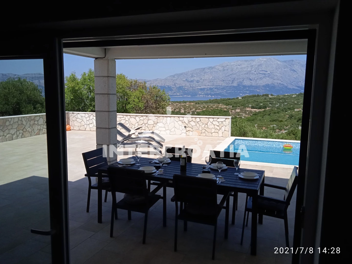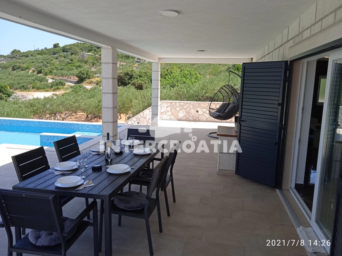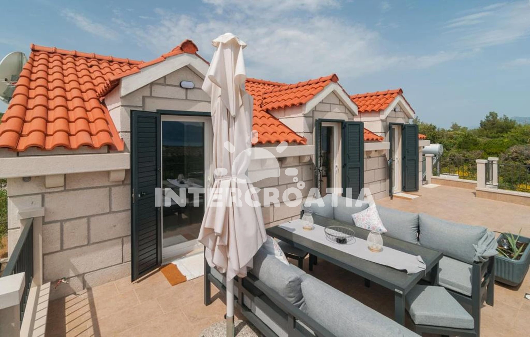 Domek se nachází 2500 m od moře a pláže. Pláž je oblázková a betonové desky. Domek disponuje bazénem s lehátky pro ubytované hosty. U objektu je k dispozici společná zahrada s posezením a grilem. Parkování je před domem.