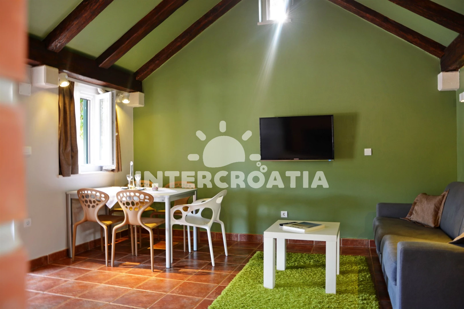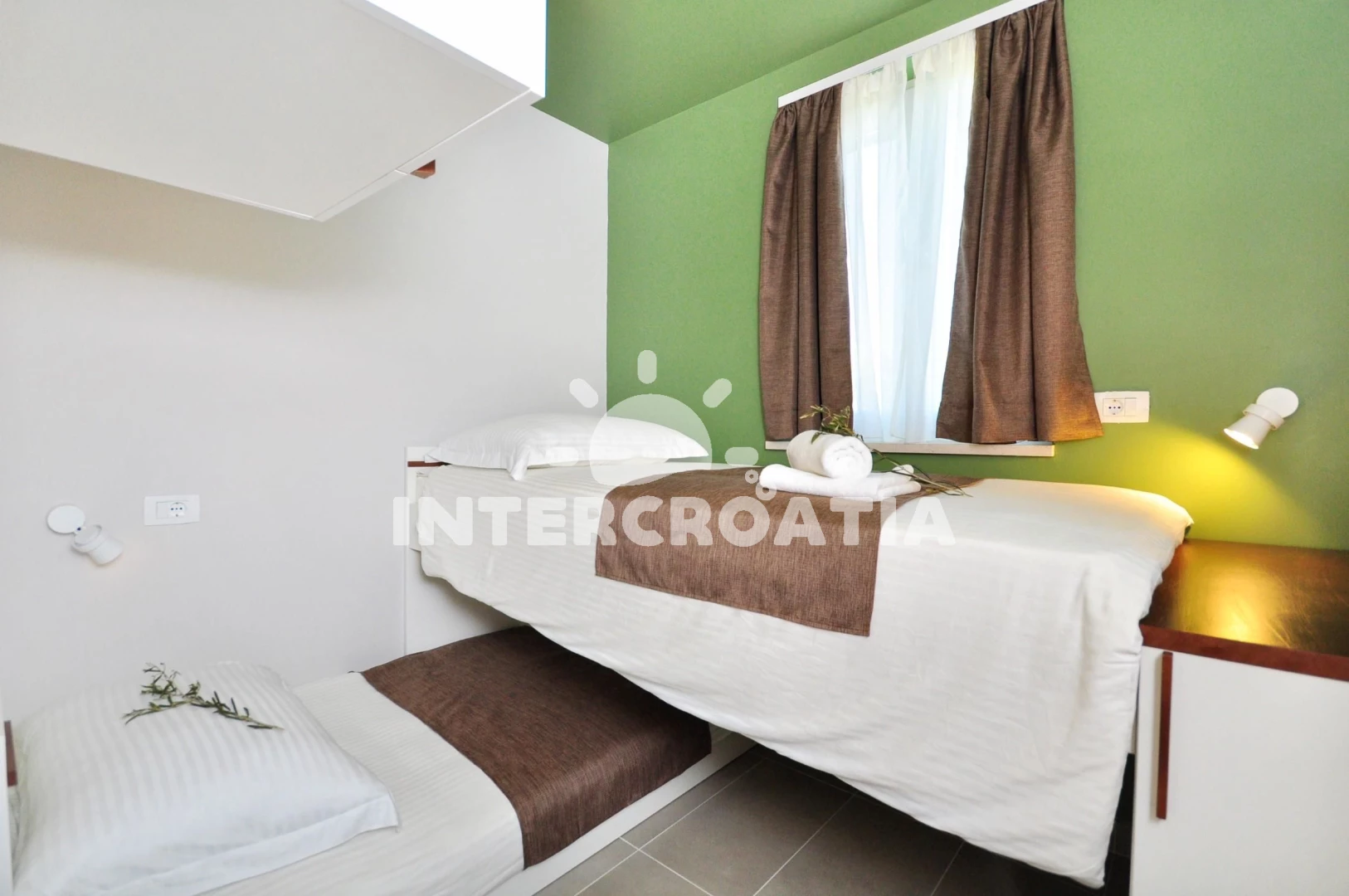 Domek (70 m2). Domek má 2 ložnice a je vhodný pro až 6 osob. Kuchyňská linka je vybavena varnou deskou, rychlovarnou konvicí, nádobím, lednicí. V obývací místnosti je rozložitelná pohovka (extra lůžko pro 2 osoby). K dispozici televize se satelitním programem. První ložnice s dvoulůžkem. Druhá ložnice se 2 jednolůžky. První koupelna se sprchovým koutem, umyvadlem, WC. Druhá koupelna se sprchovým koutem, umyvadlem, WC.