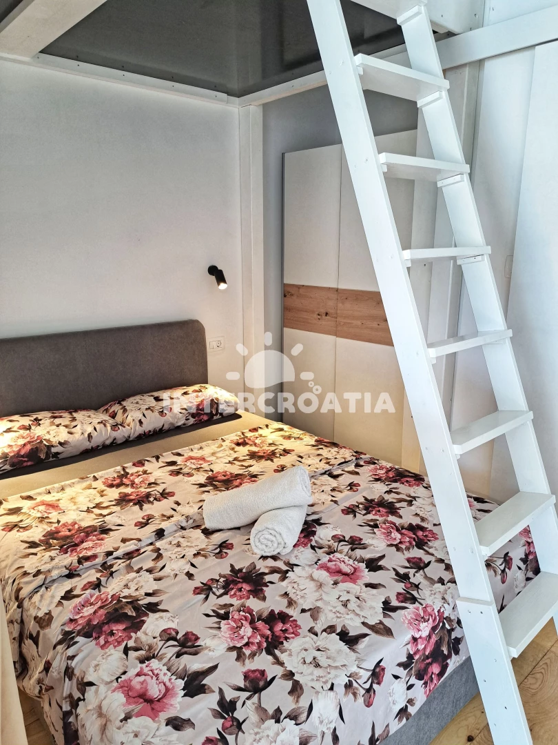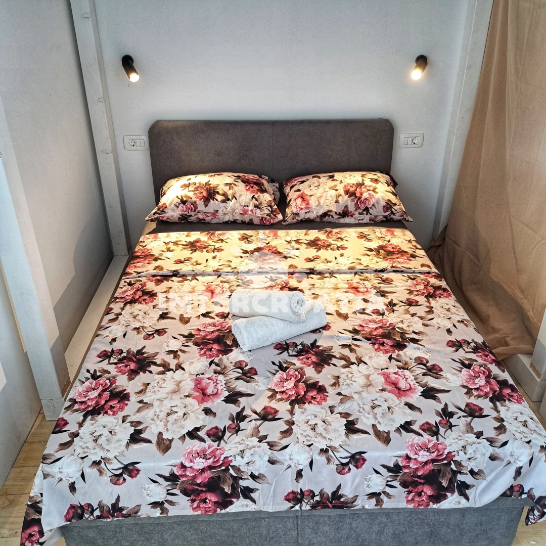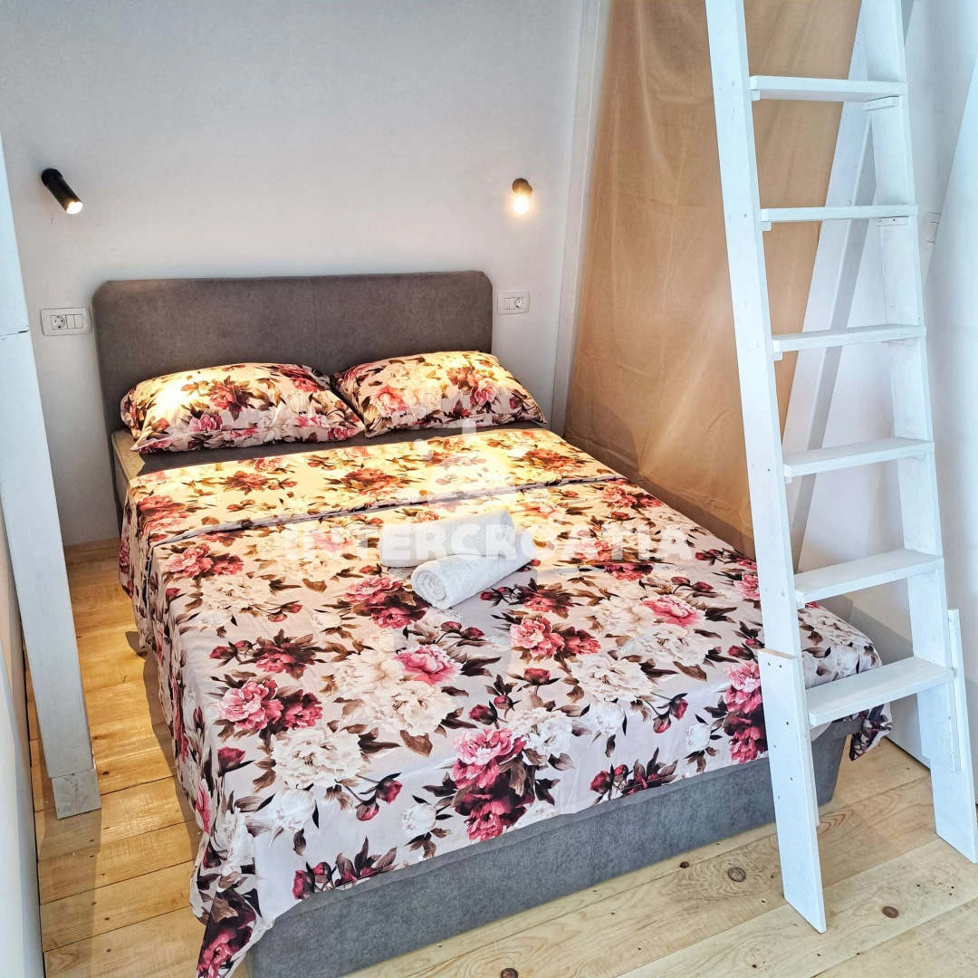 Domek (40 m2) s výhledem na moře. Nachází se v přízemí objektu. Domek má 1 ložnici a je vhodný pro až 4 osoby. Kuchyňská linka je vybavena varnou deskou, myčkou na nádobí, nádobím, lednicí, mrazákem. K dispozici televize. Ložnice se 2 dvoulůžky. Koupelna se sprchovým koutem, umyvadlem, fénem a WC. Dále samostatné WC.