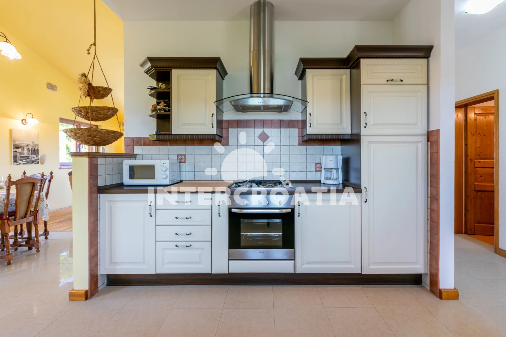 3 ložnice, 2 kompletní koupelny, plus samostatné WC. Dobře vybavená kuchyň, velký jídelní stůl, nepoužitelný krb, kožená sedací souprava 3-2-1. Všechny pokoje kromě koupelen mají klimatizaci. 2 terasy, velká zahrada, gril, parkovací místo a podzemní garáž.