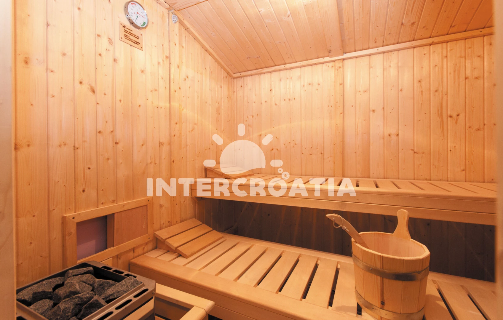 Domek se nachází 500 m od moře a pláže. Pláž je písčitá a kamenitá. Domek disponuje bazénem s lehátky pro ubytované hosty. K dispozici sauna. U objektu je k dispozici společná zahrada s posezením a grilem. Parkování je před domem.