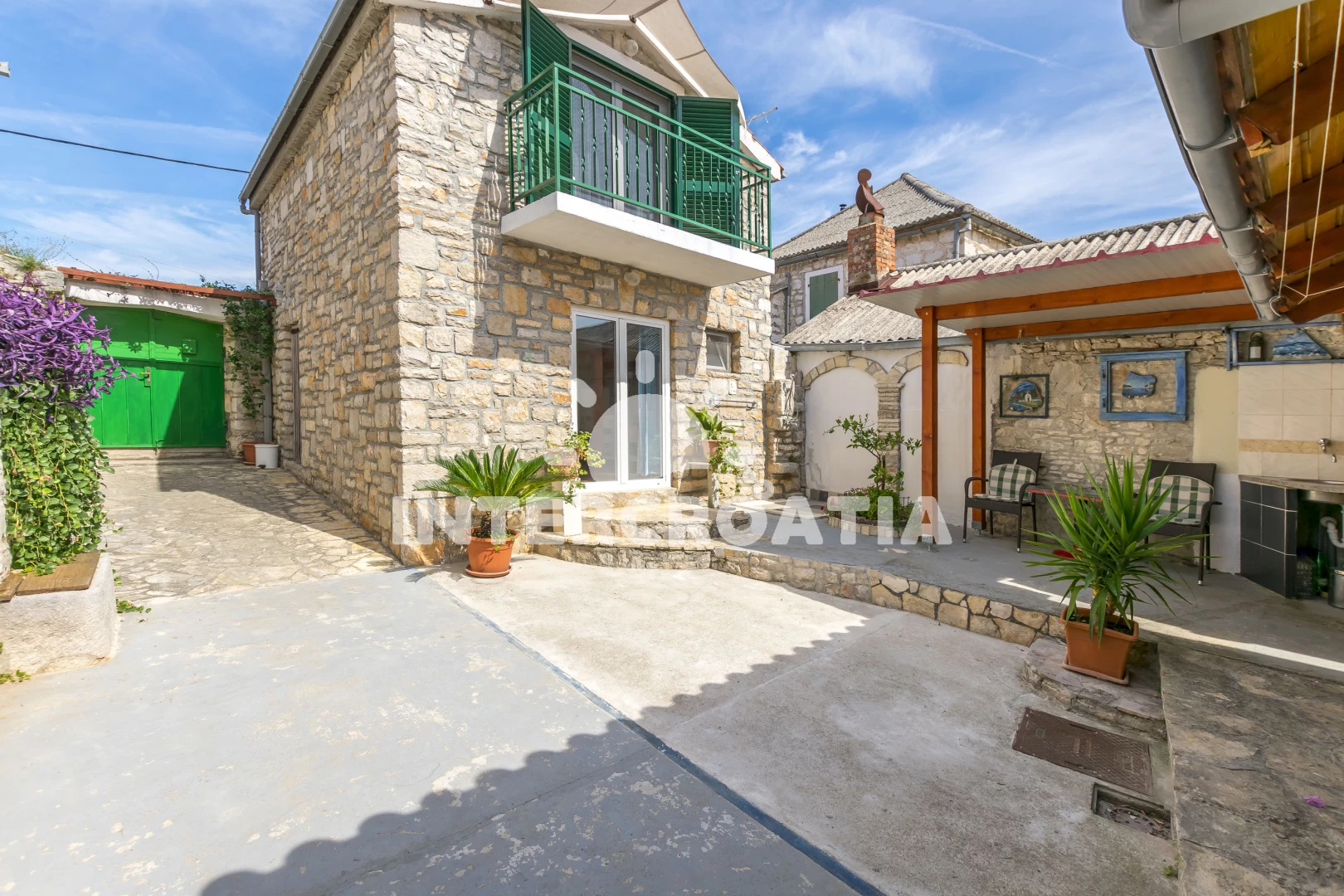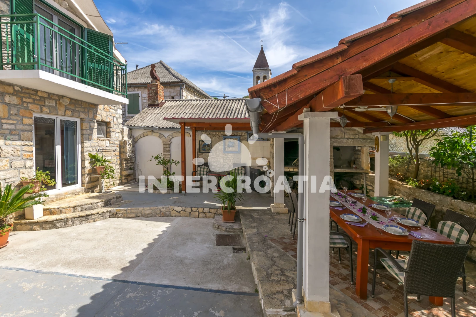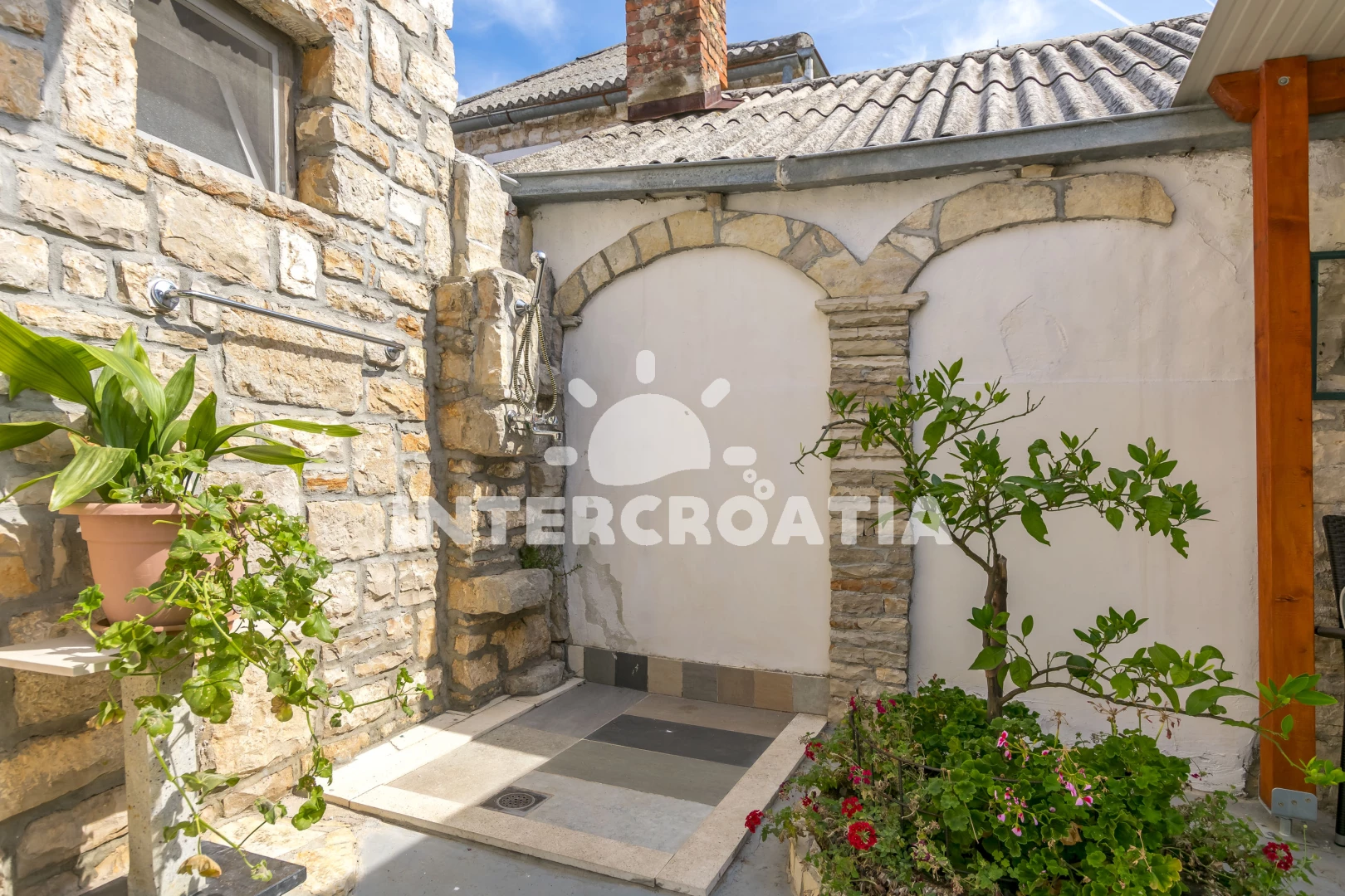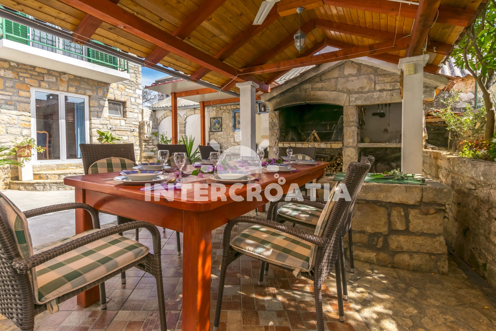 Dva samostatné domy spojené krásným dvorem jsou ideální pro dvě rodiny nebo páry. Oba domy mají dvě ložnice s klimatizací a WC v horním patře. Ve spodním patře se nachází obývací pokoj, kuchyň s jídelním stolem a mokrá místnost se sprchovým koutem. Vnitřní nádvoří má neuvěřitelně krásný gril s velkým, těžkým dřevěným stolem pro grilování a společné trávení času, stejně jako venkovní sprchu a vinný/party sklípek, který si hrávaly naše nejmenší děti.