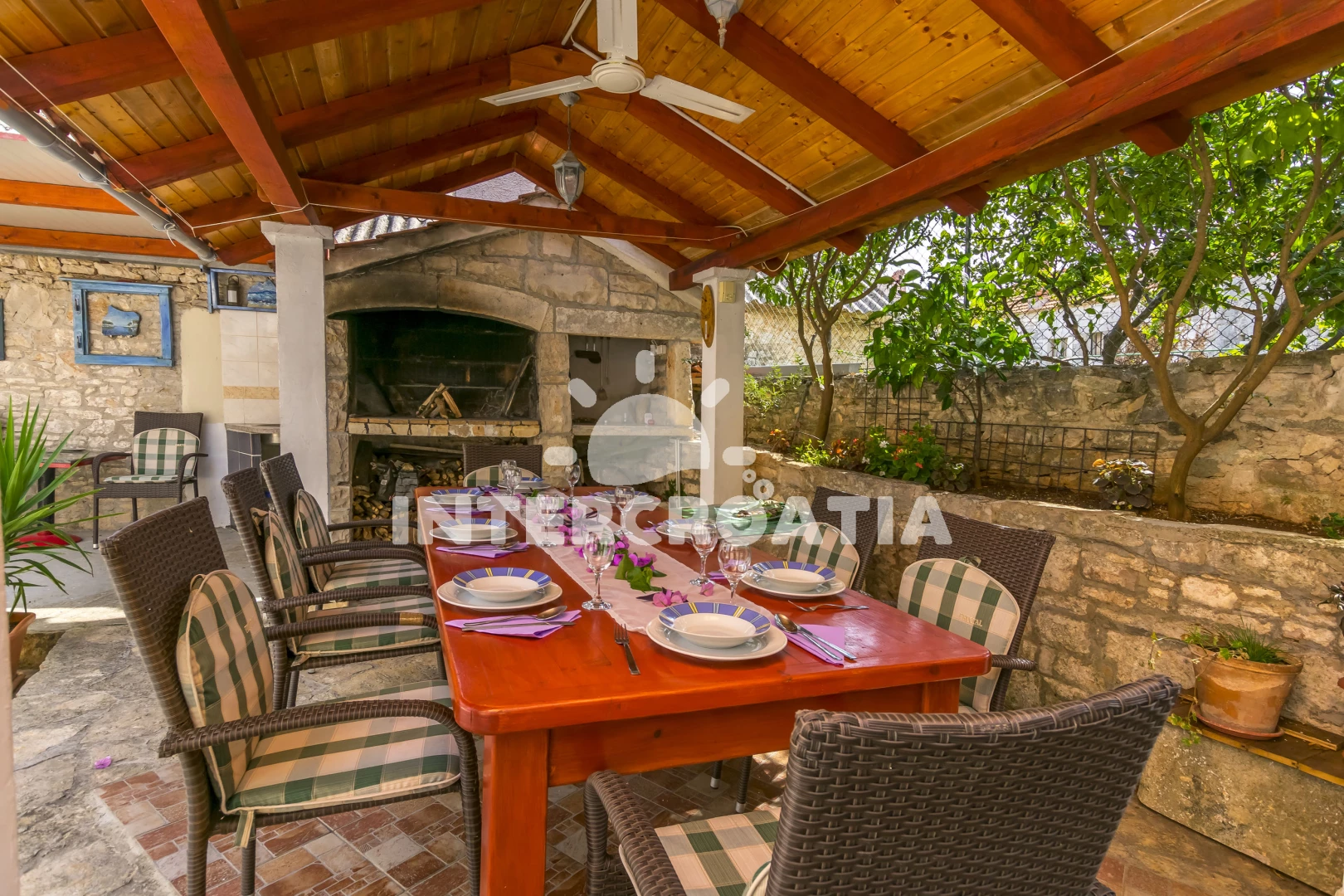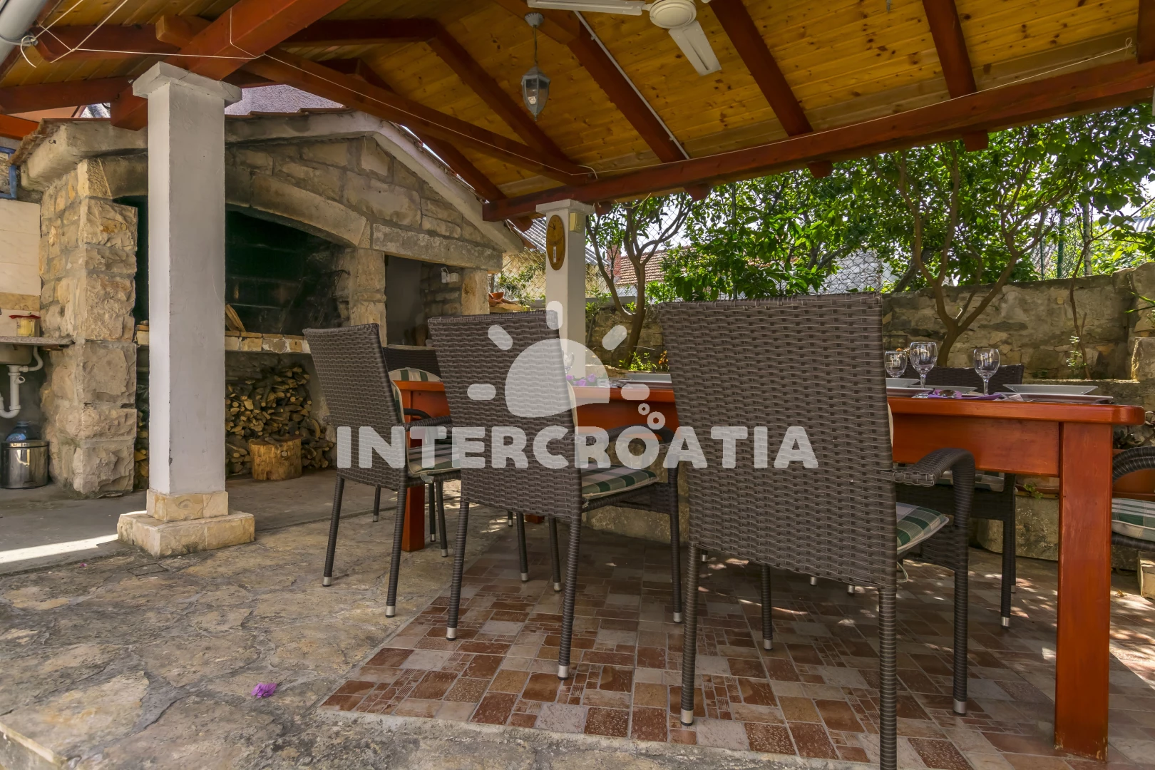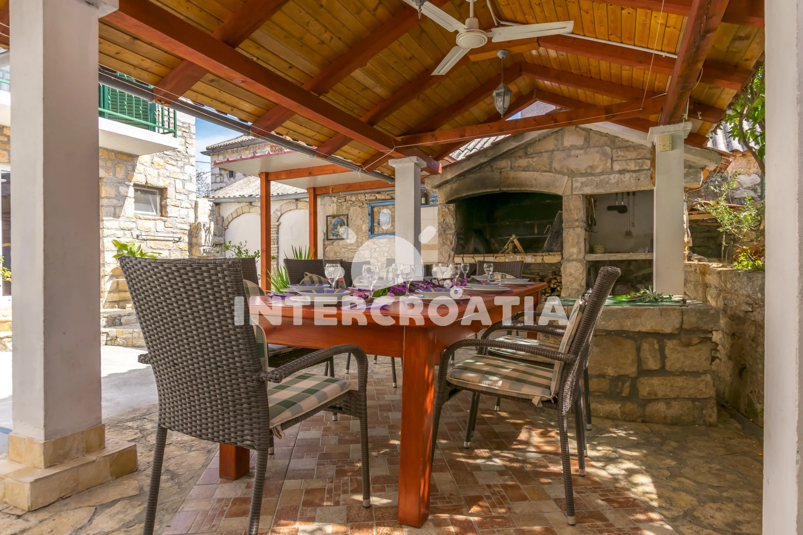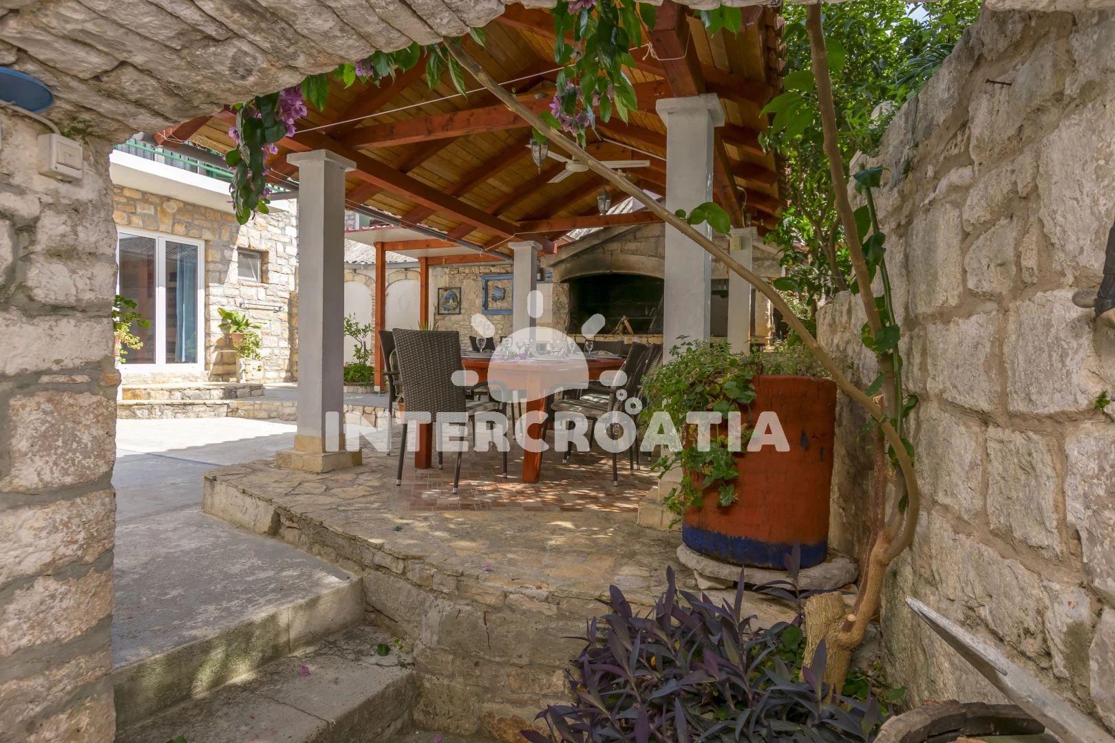 Dva samostatné domy spojené krásným dvorem jsou ideální pro dvě rodiny nebo páry. Oba domy mají dvě ložnice s klimatizací a WC v horním patře. Ve spodním patře se nachází obývací pokoj, kuchyň s jídelním stolem a mokrá místnost se sprchovým koutem. Vnitřní nádvoří má neuvěřitelně krásný gril s velkým, těžkým dřevěným stolem pro grilování a společné trávení času, stejně jako venkovní sprchu a vinný/party sklípek, který si hrávaly naše nejmenší děti.