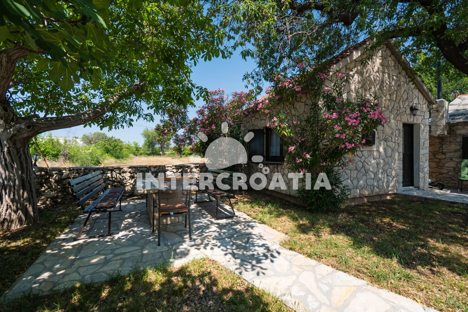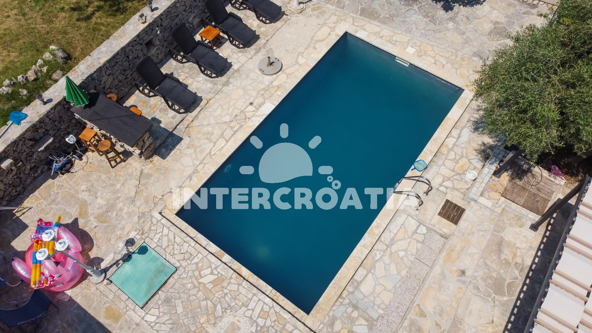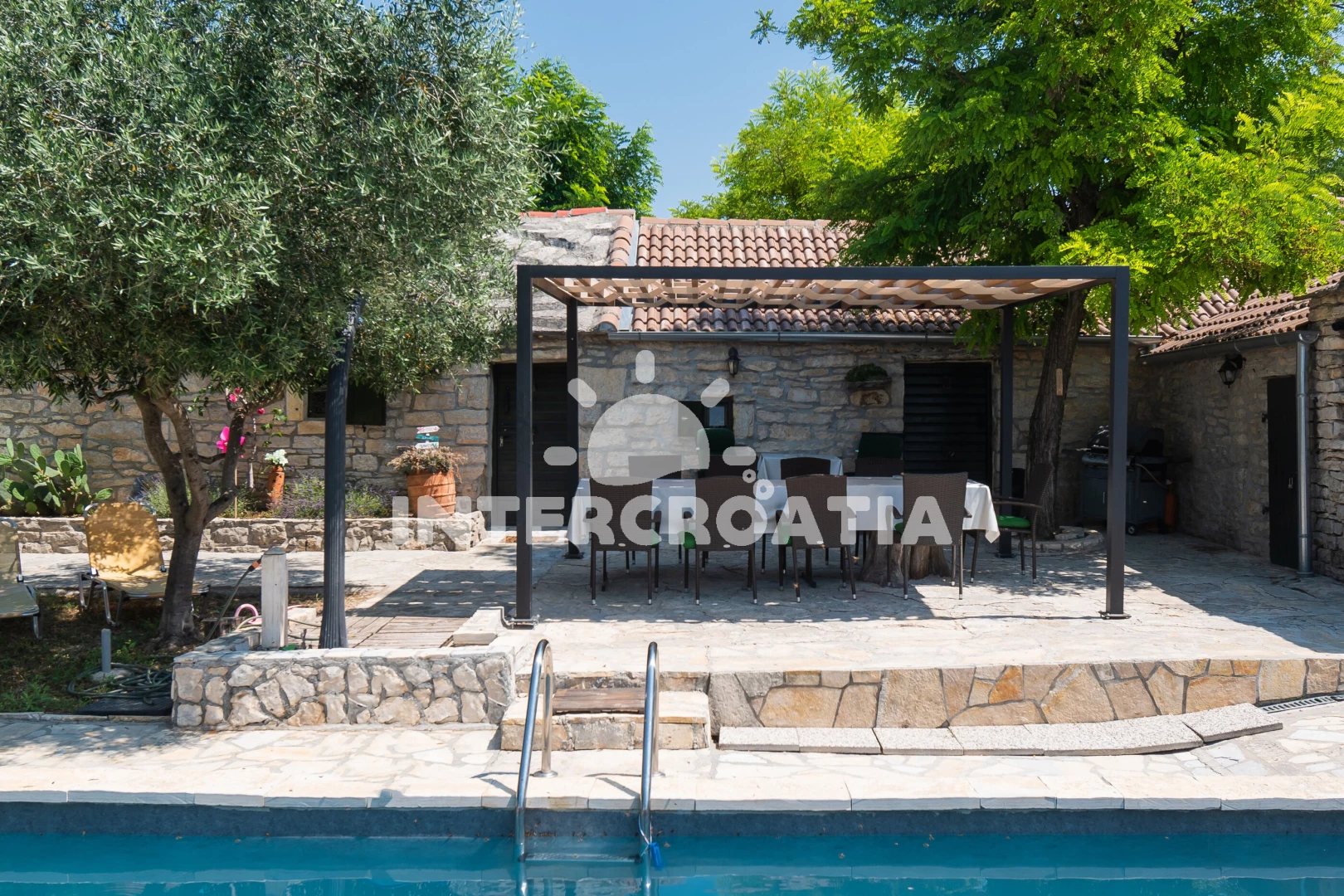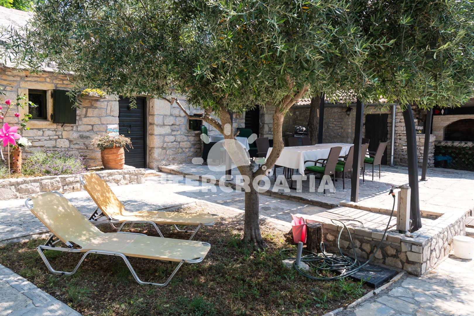 Domek se nachází 20000 m od moře a pláže. Pláž je oblázková a betonové desky. Domek disponuje bazénem s lehátky pro ubytované hosty. U objektu je k dispozici společná zahrada s posezením a grilem. Parkování je před domem.