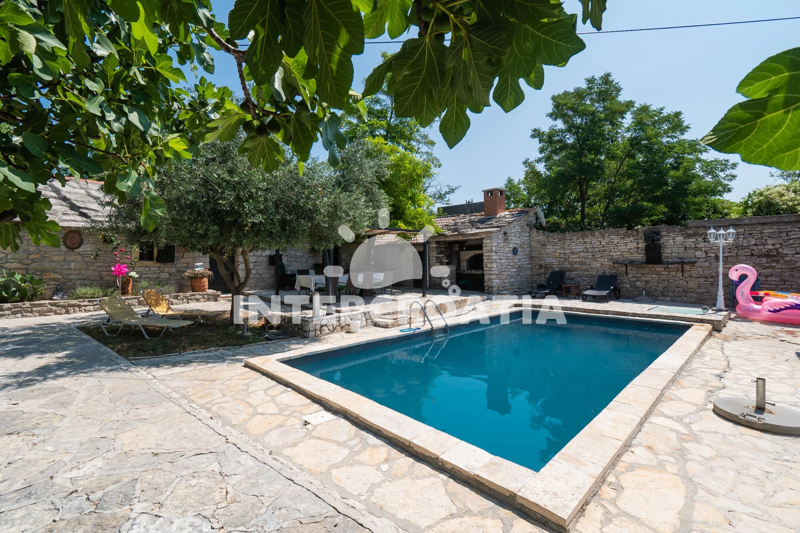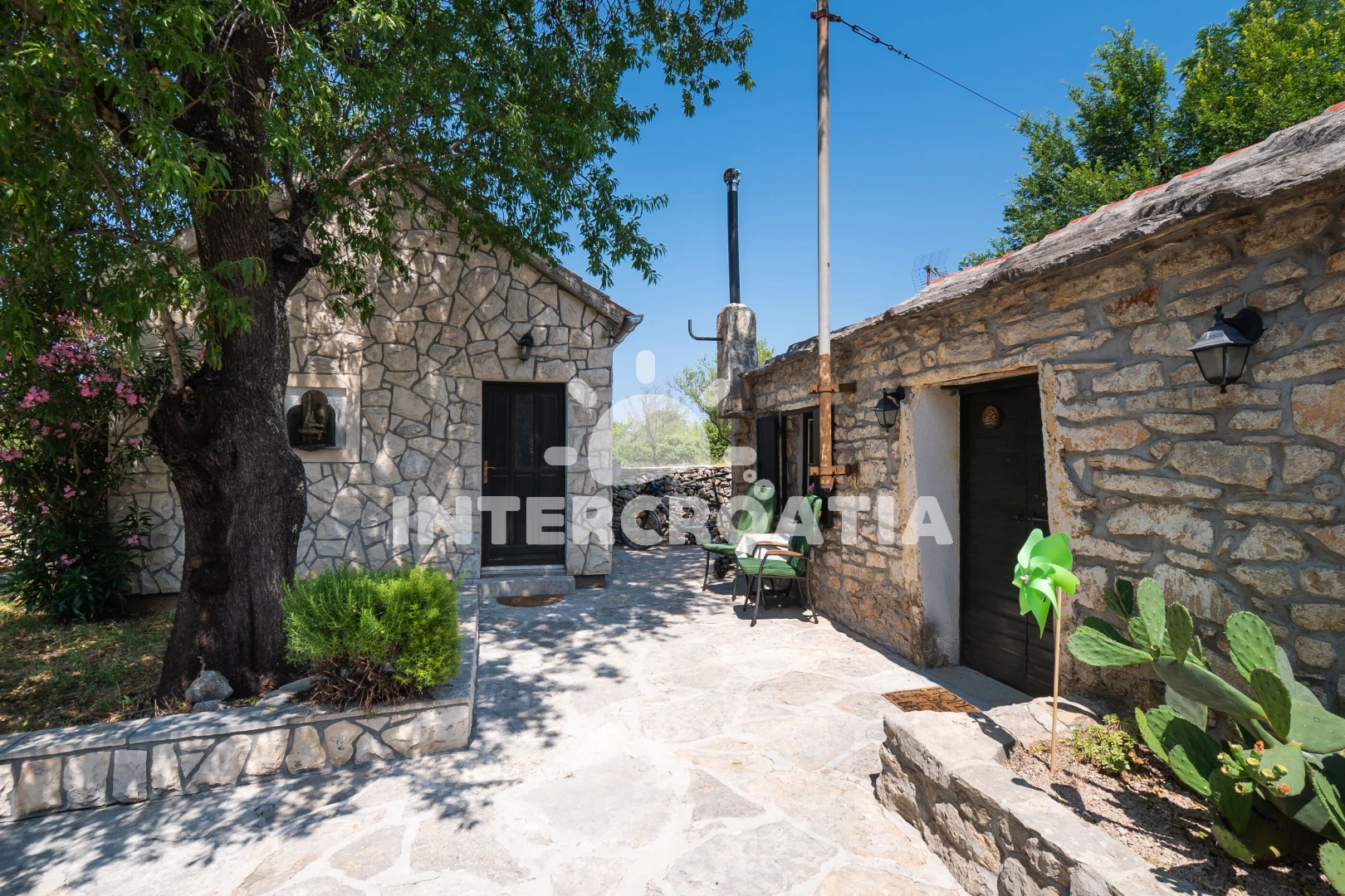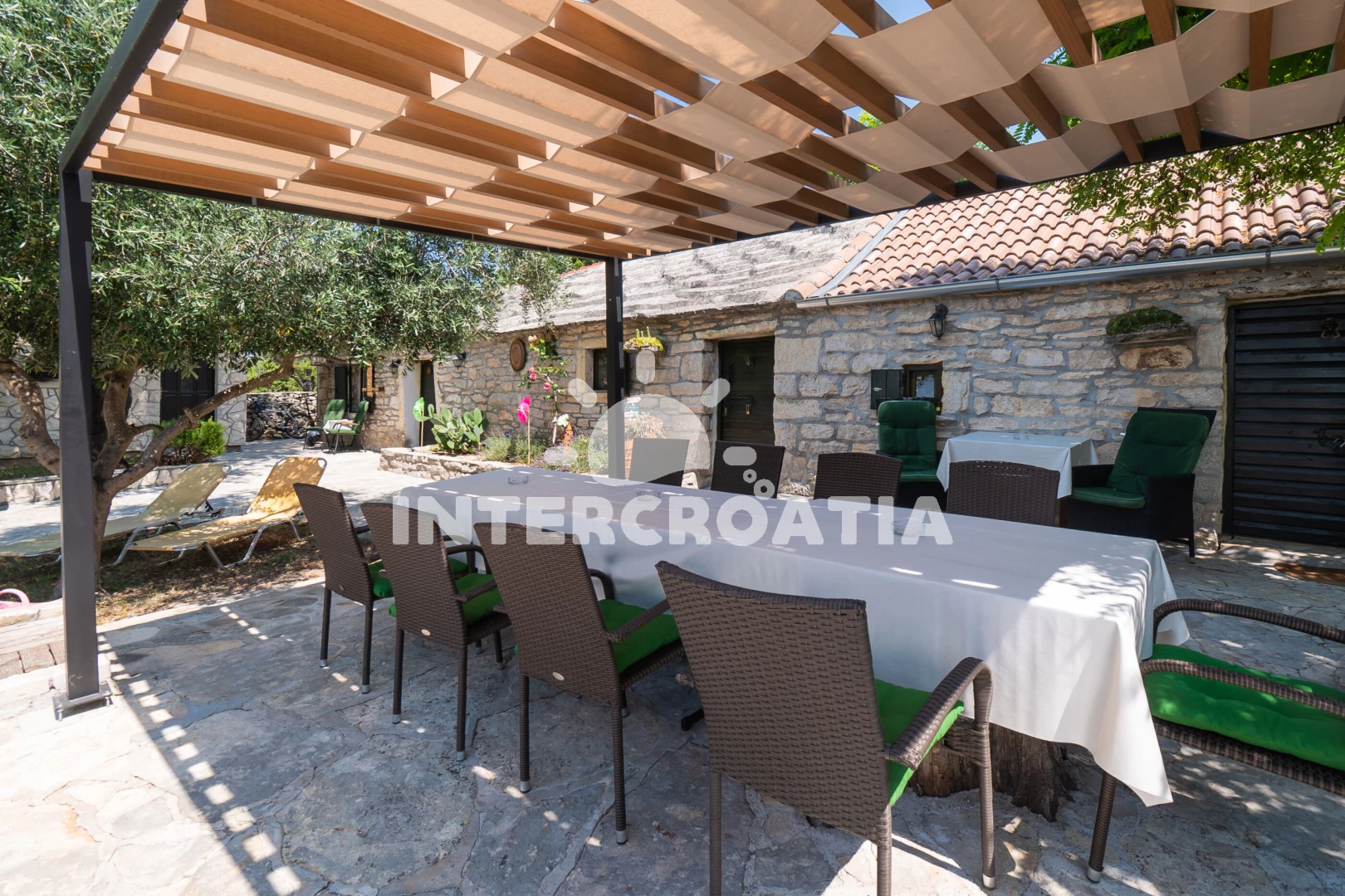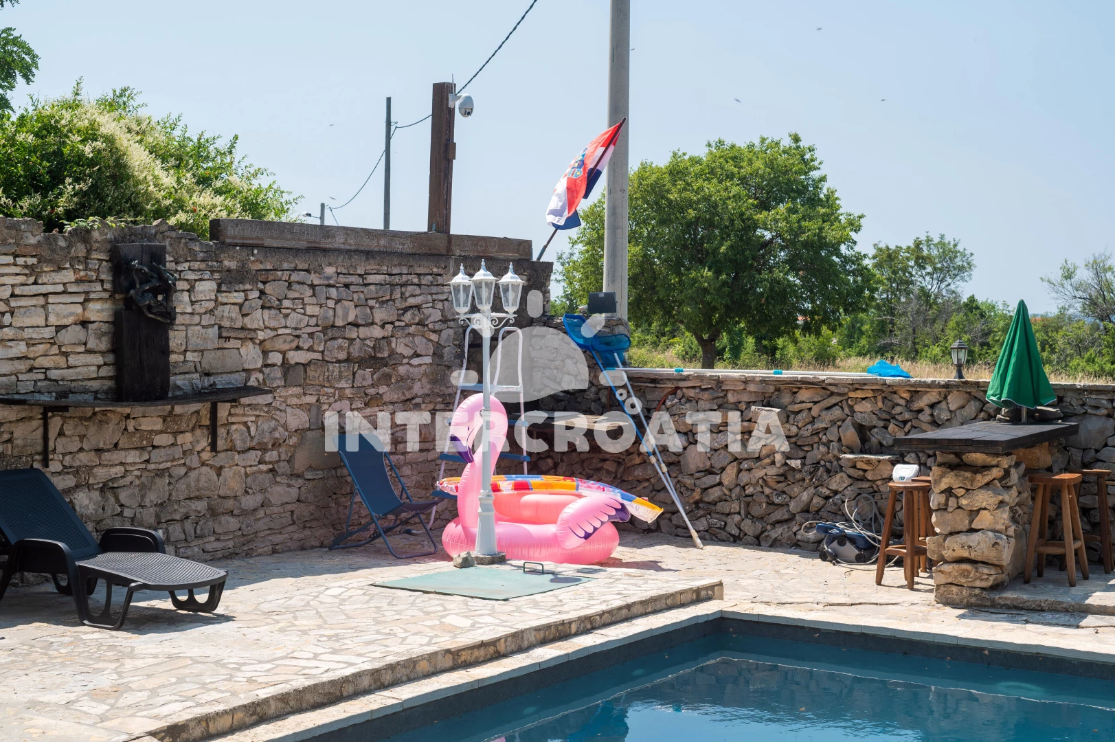 Domek se nachází 20000 m od moře a pláže. Pláž je oblázková a betonové desky. Domek disponuje bazénem s lehátky pro ubytované hosty. U objektu je k dispozici společná zahrada s posezením a grilem. Parkování je před domem.