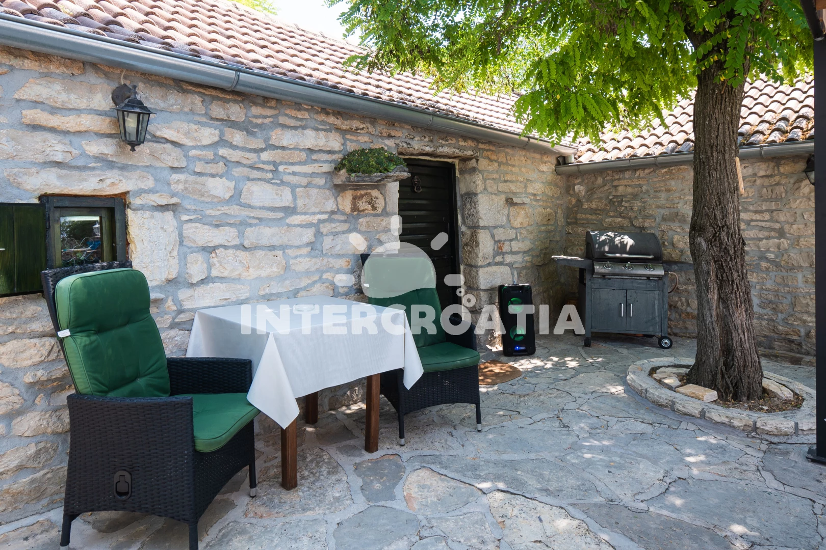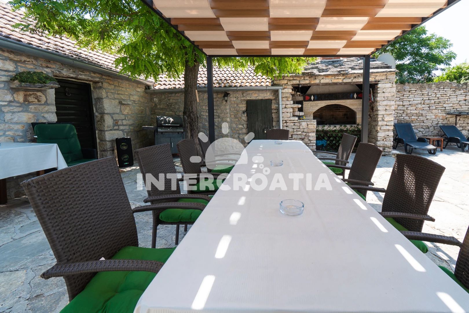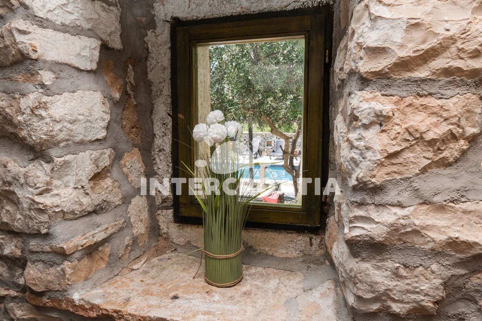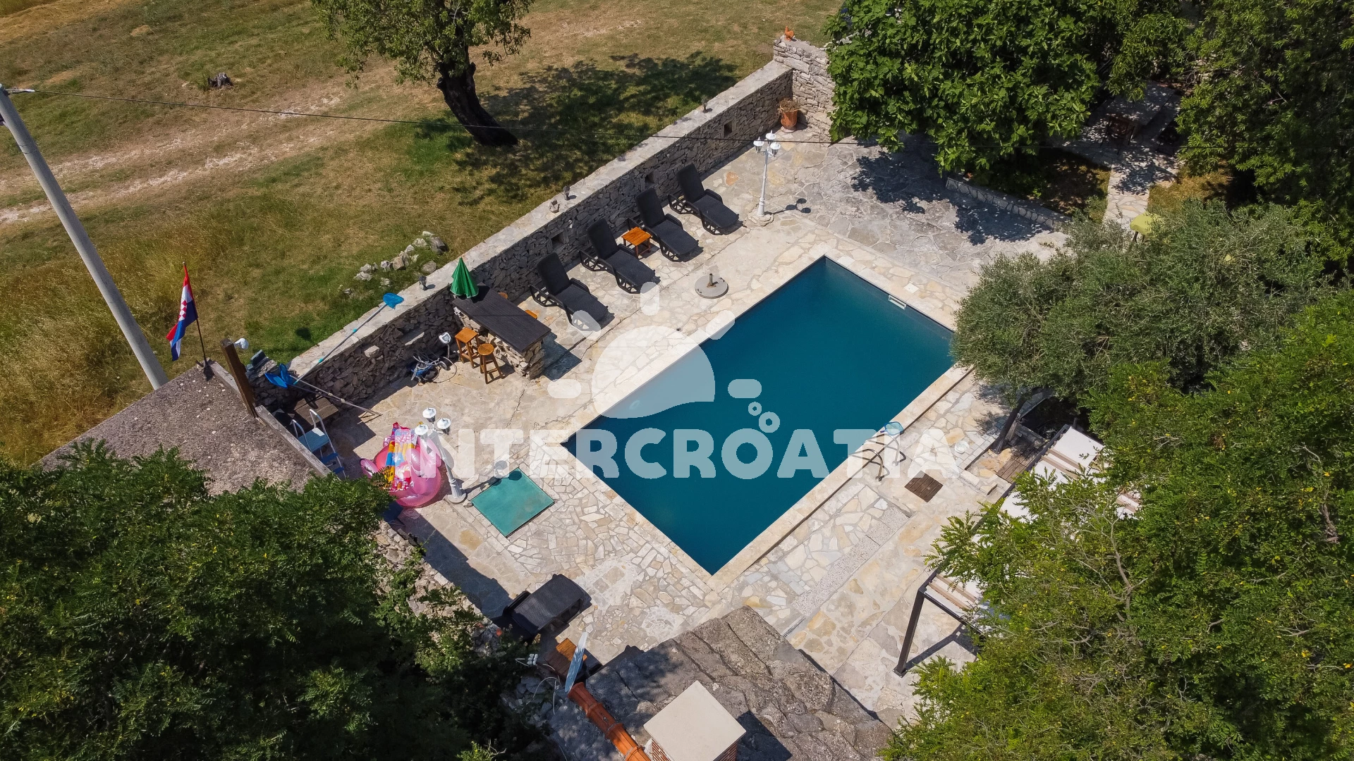 Domek se nachází 20000 m od moře a pláže. Pláž je oblázková a betonové desky. Domek disponuje bazénem s lehátky pro ubytované hosty. U objektu je k dispozici společná zahrada s posezením a grilem. Parkování je před domem.