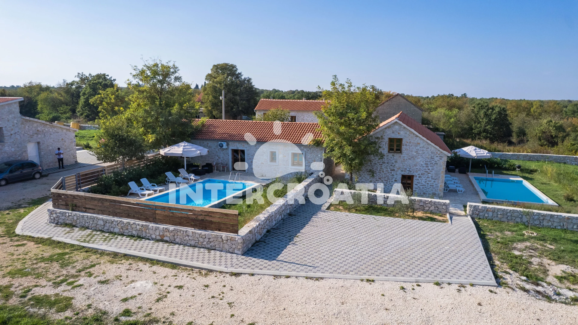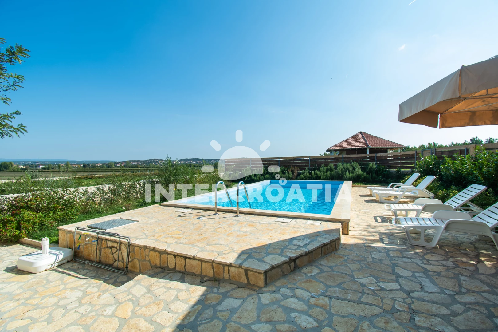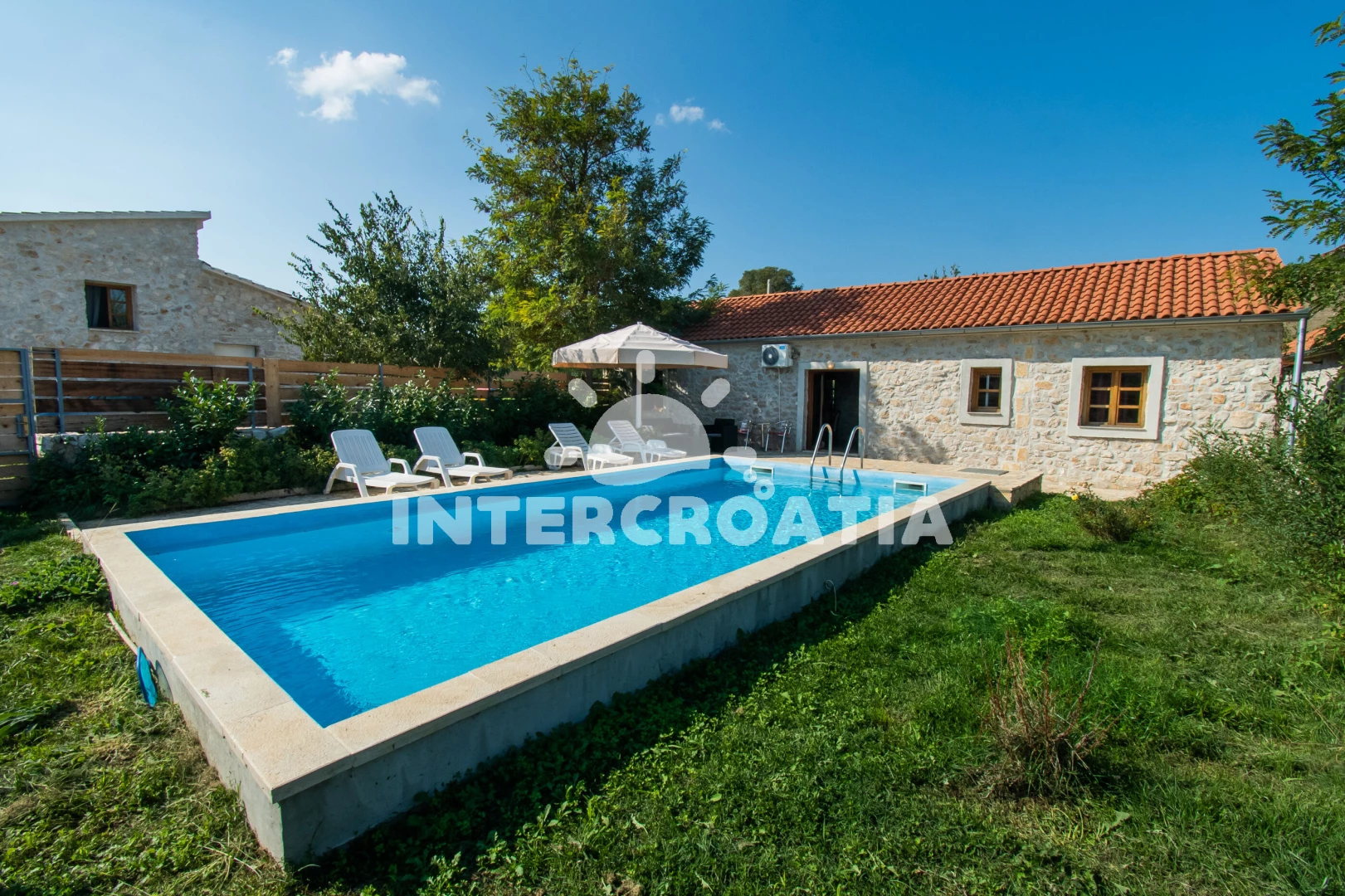 Domek se nachází 11000 m od moře a pláže. Pláž je písčitá a oblázková. Domek disponuje bazénem s lehátky pro ubytované hosty. U objektu je k dispozici společná zahrada s posezením a grilem. Parkování je před domem.