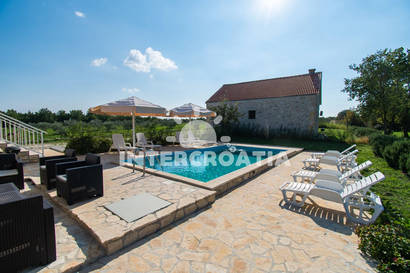 Domek se nachází 11000 m od moře a pláže. Pláž je písčitá a oblázková. Domek disponuje bazénem s lehátky pro ubytované hosty. U objektu je k dispozici společná zahrada s posezením a grilem. Parkování je před domem.