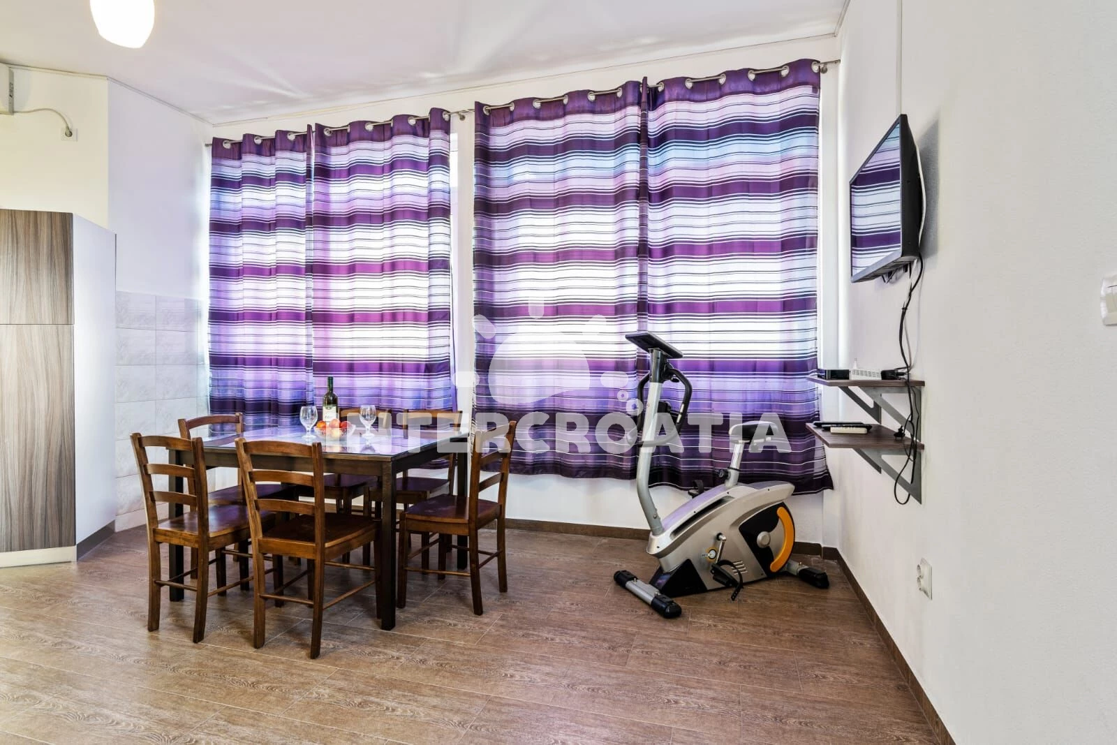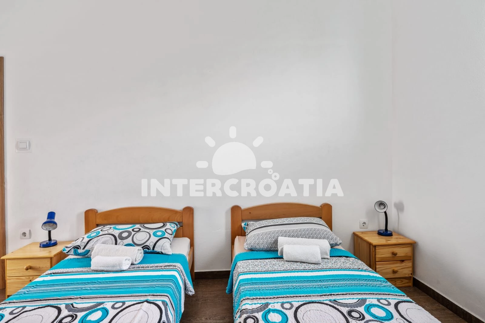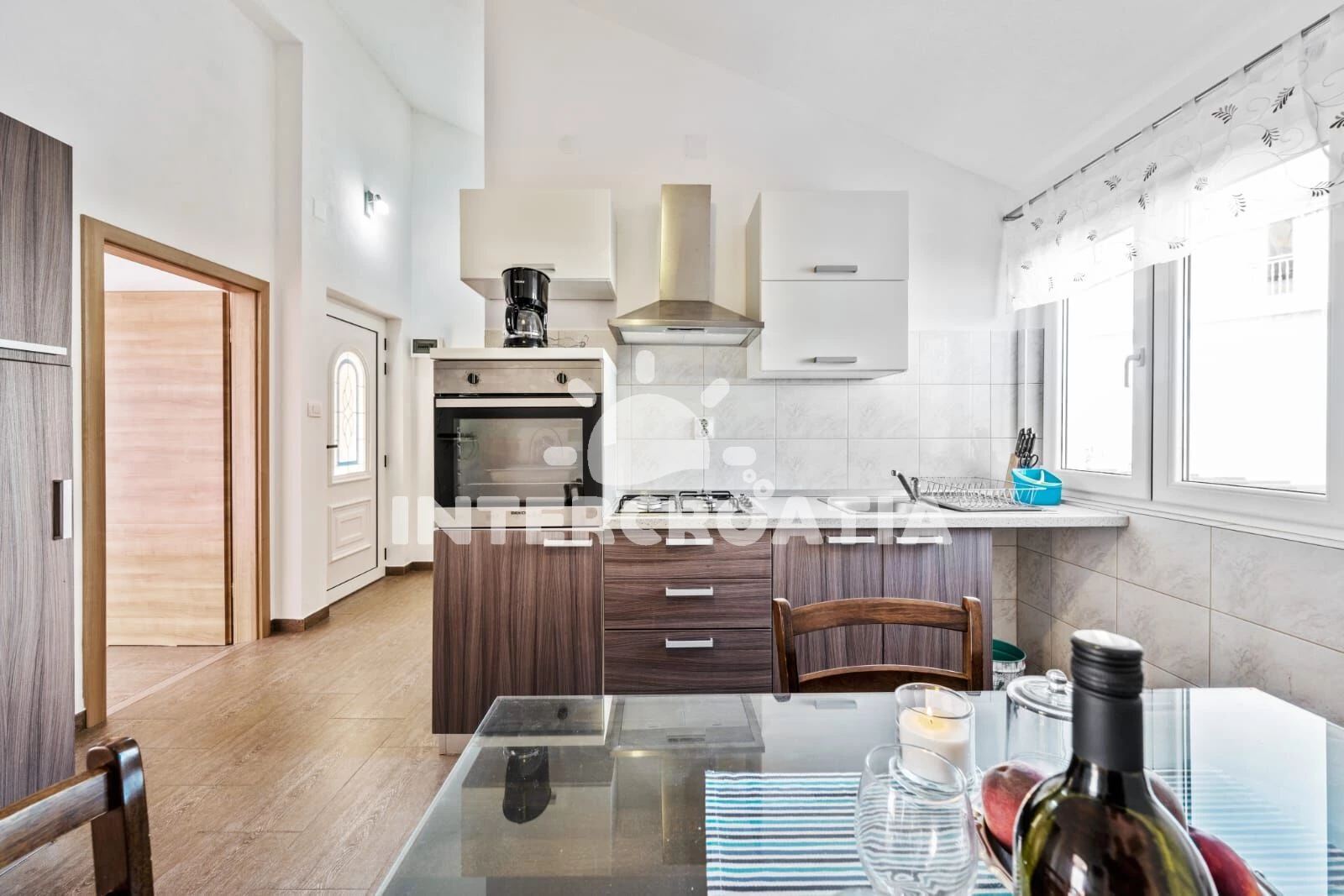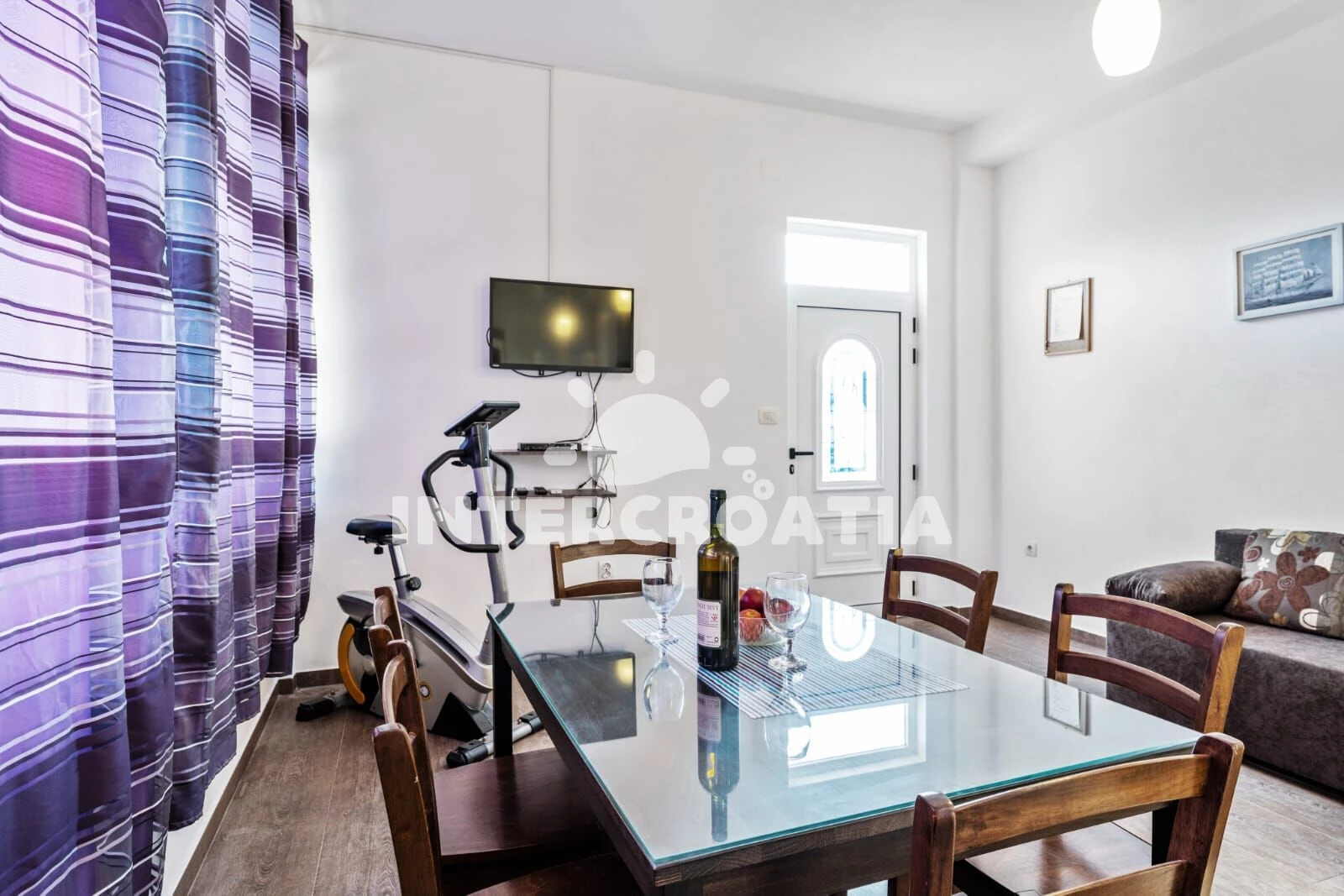 Vzdálenosti: Moře 50 m, pláž 150 m (oblázková a betonové desky), bar 20 m, restaurace 20 m, centrum 20 m, směnárna 50 m, supermarket 50 m, veřejná doprava 500 m, pošta 5 km, lékárna 5 km, ambulance 5 km, banka 10 km, čerpací stanice 10 km, letiště (Split) 40 km, trajekt (Šibenik) 45 km,
