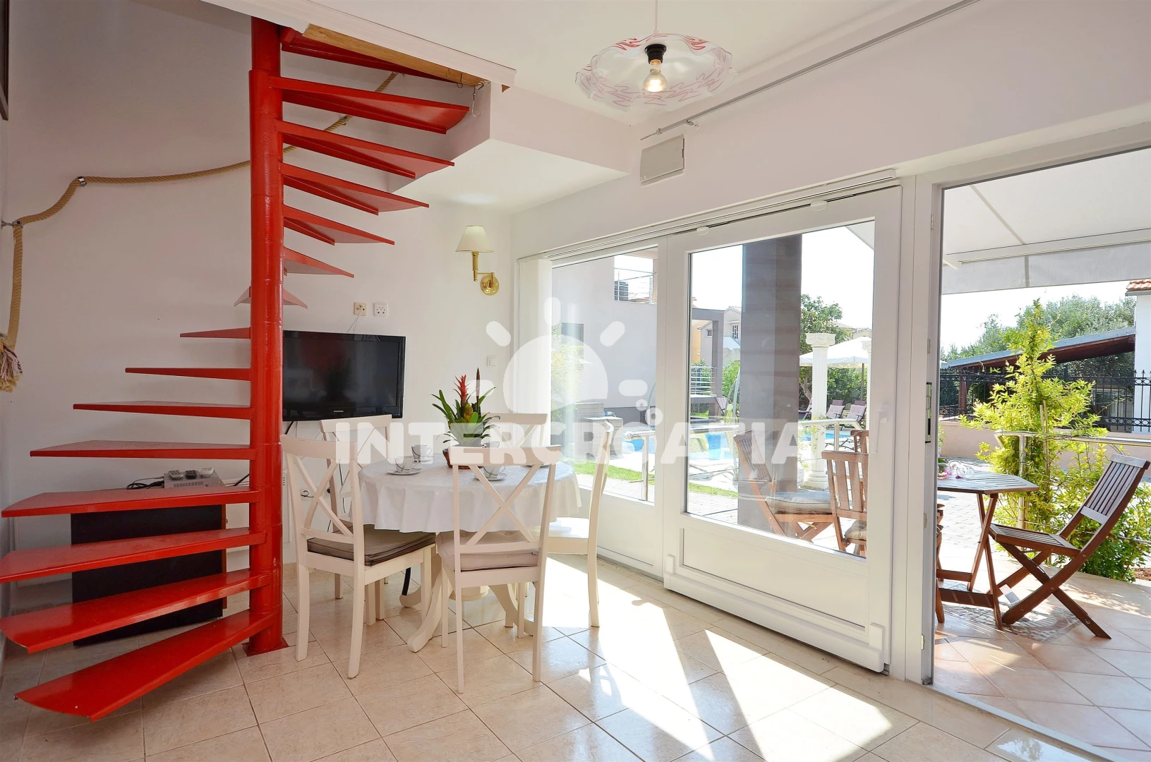 Domek se nachází 900 m od moře a pláže. Pláž je oblázková a betonové desky. Domek disponuje bazénem s lehátky pro ubytované hosty.