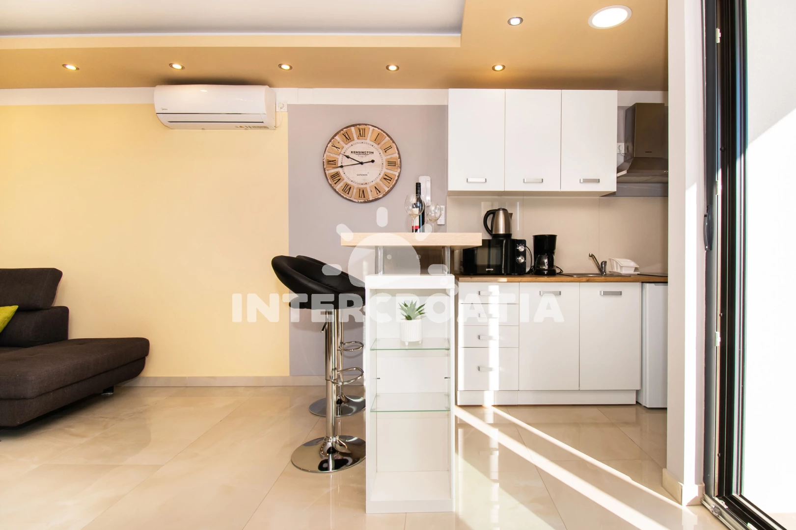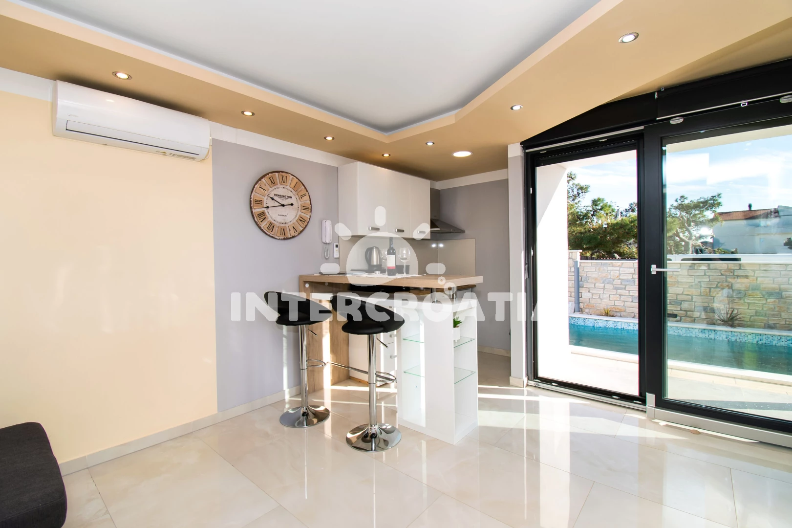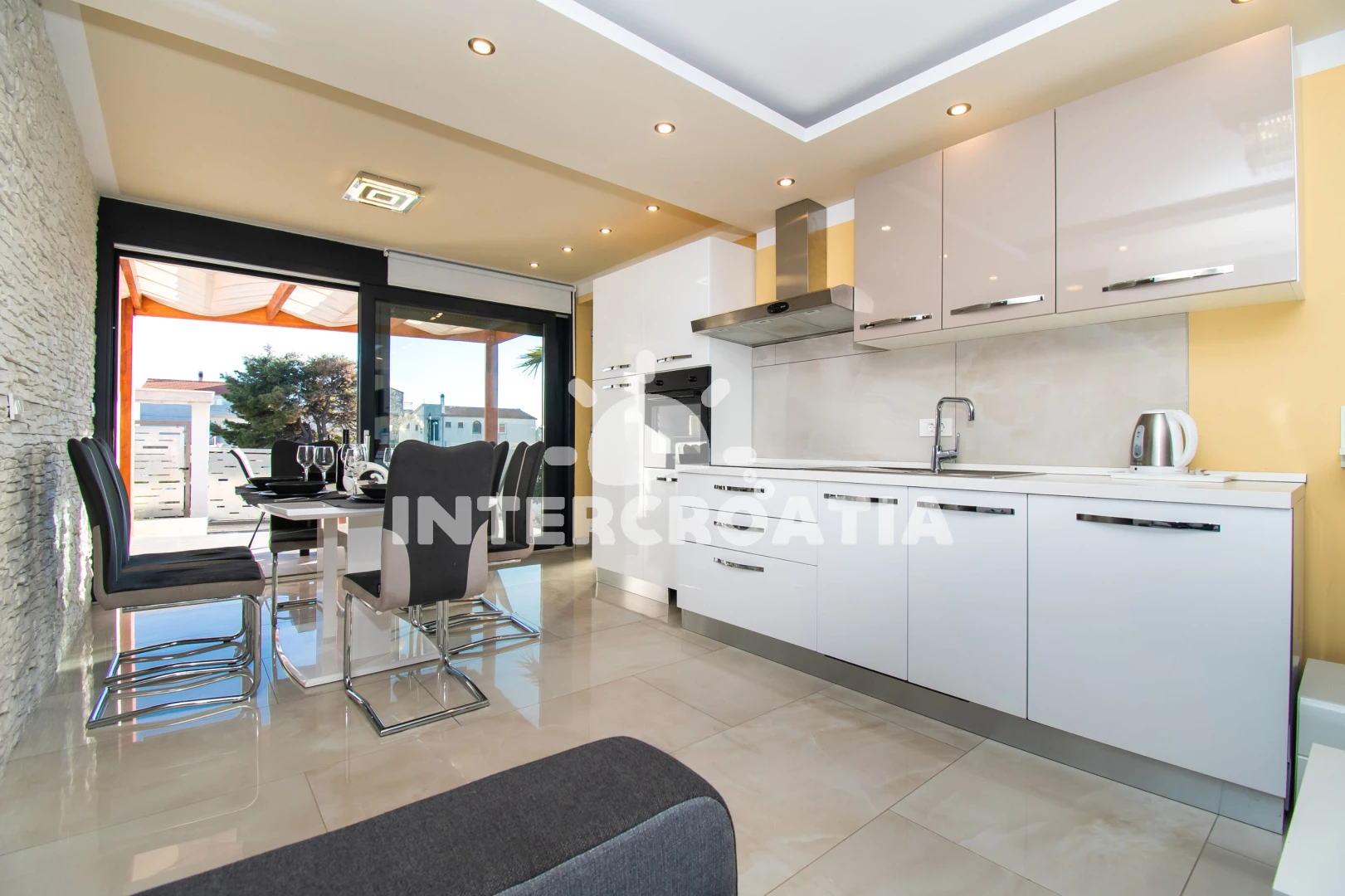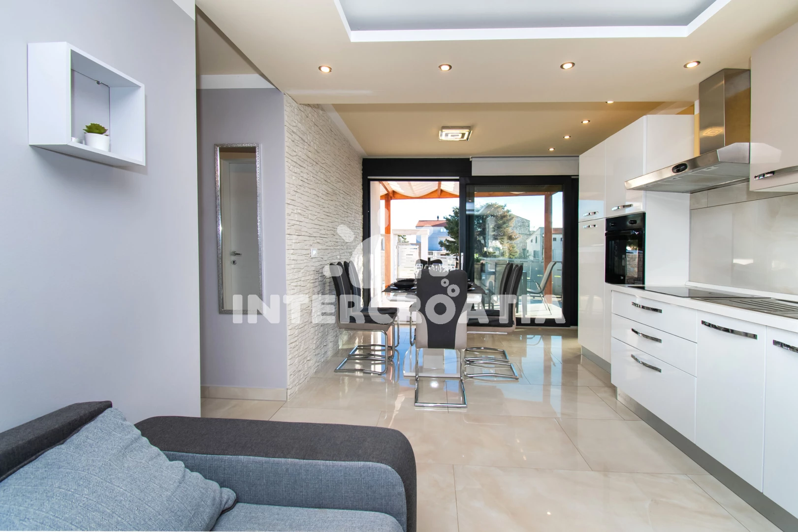 Vzdálenosti: Moře 1,2 km, pláž 1,1 km (písek), bar 100 m, supermarket 600 m, směnárna 700 m, diskotéka 800 m, čerpací stanice 800 m, lékárna 800 m, banka 1 km, pošta 1,1 km, veřejná doprava 1,2 km, restaurace 1,2 km, centrum 1,2 km, půjčovna motorových člunů 1,2 km, marina 1,2 km, ambulance 1,2 km, půjčovna kol 1,4 km, tenisové kurty 1,4 km, potápění 1,4 km, trajekt (Zadar) 15 km, park Plitvice 20 km, letiště (Zadar) 65 km,
