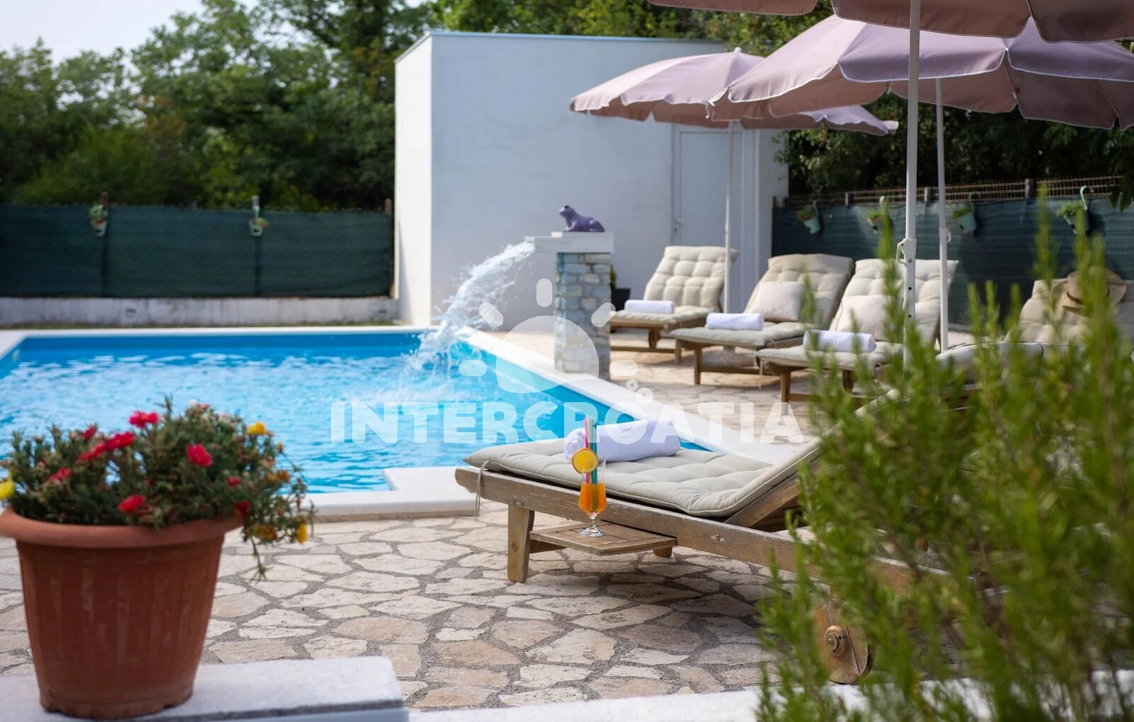 Domek se nachází 13000 m od moře a pláže. Pláž je oblázková. Domek disponuje bazénem s lehátky pro ubytované hosty. K dispozici posilovna. U objektu je k dispozici společná zahrada s posezením a grilem.