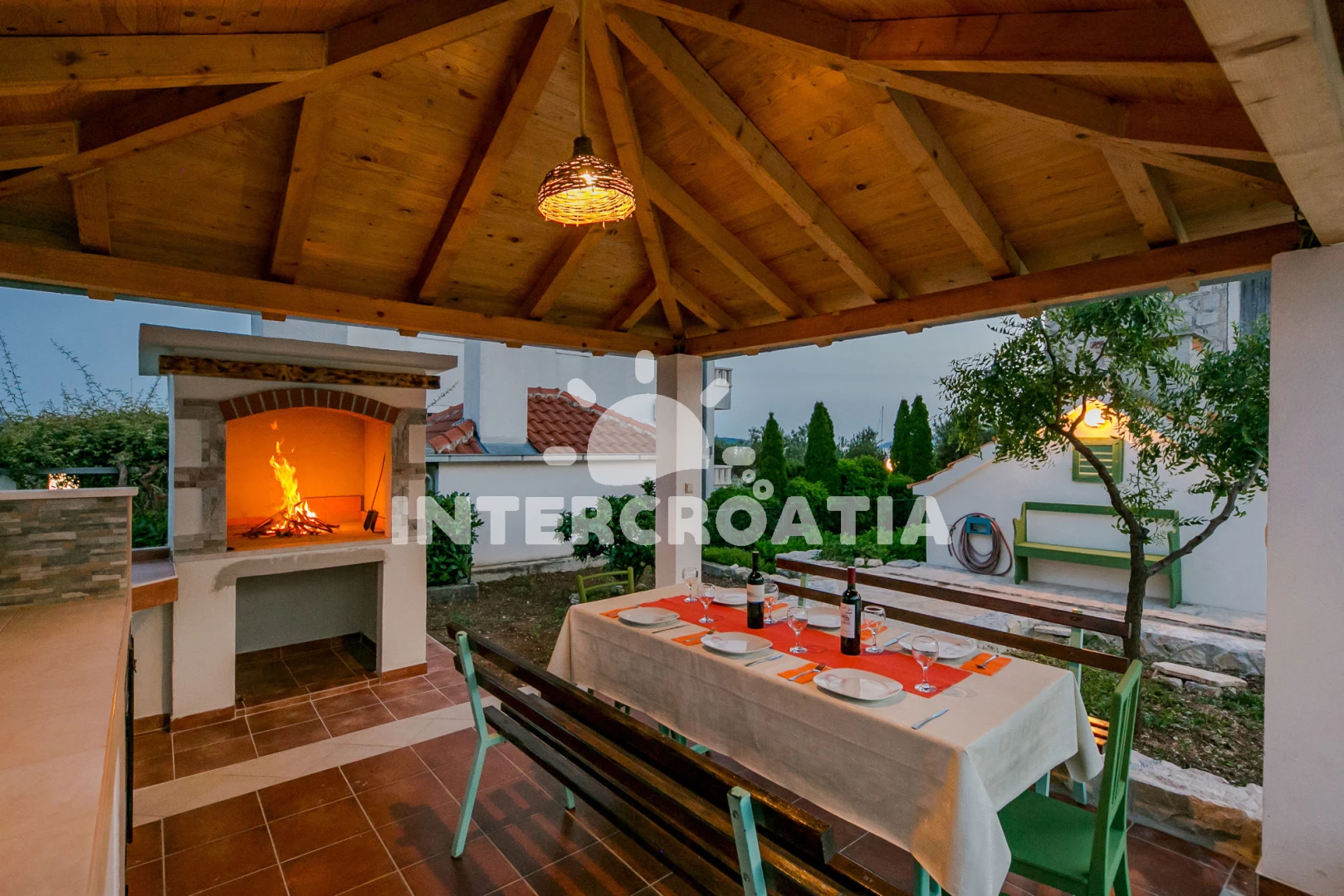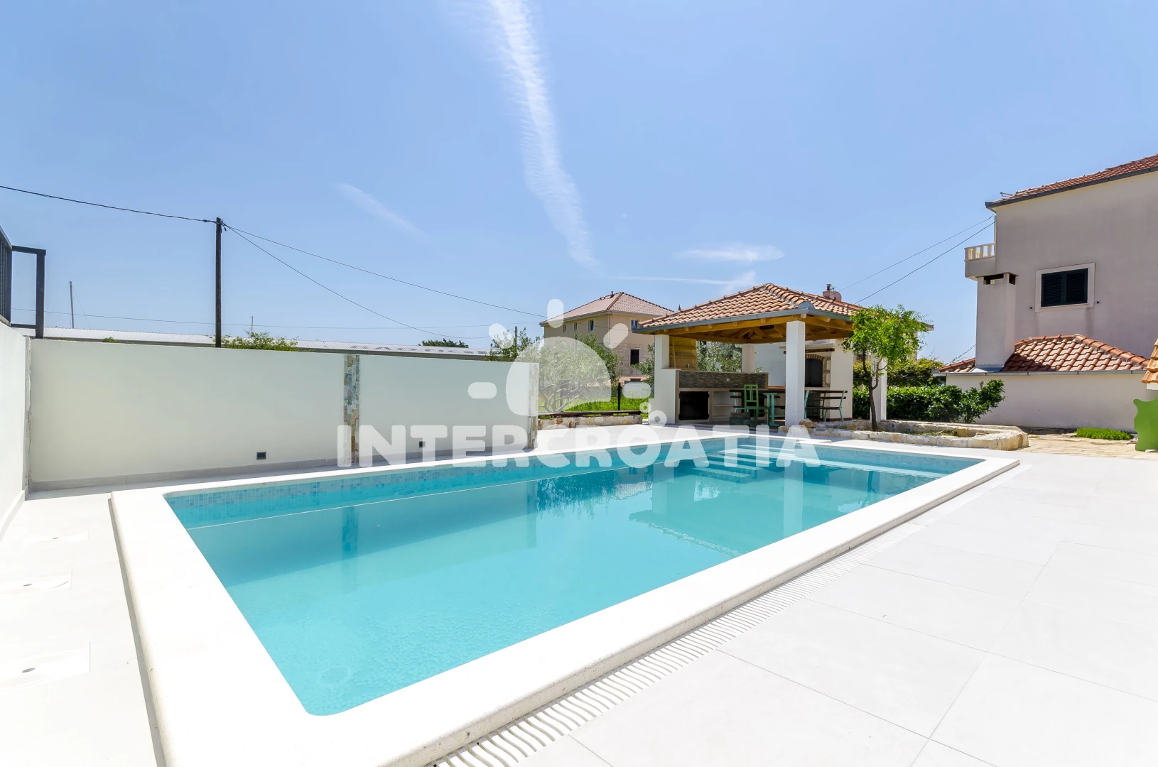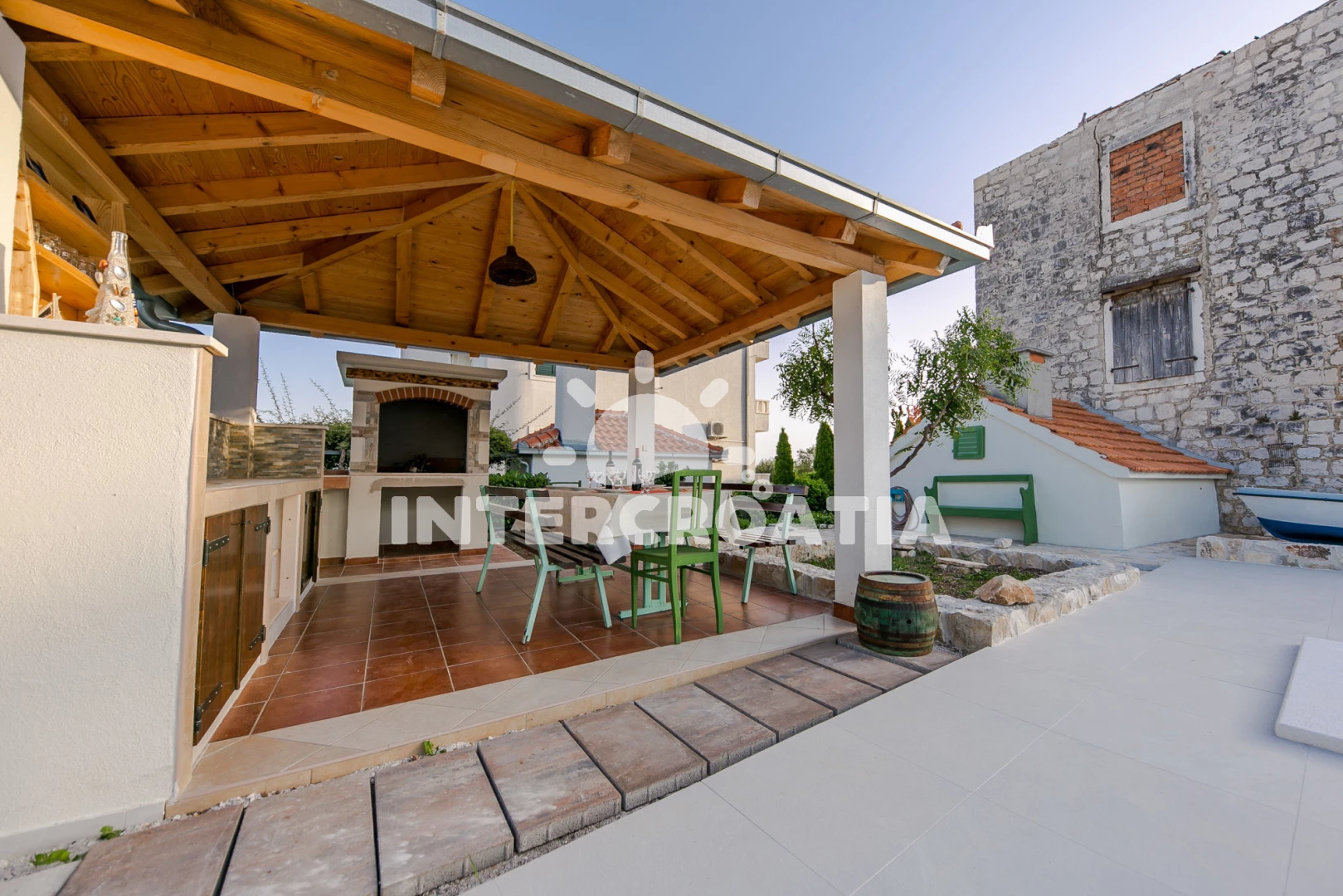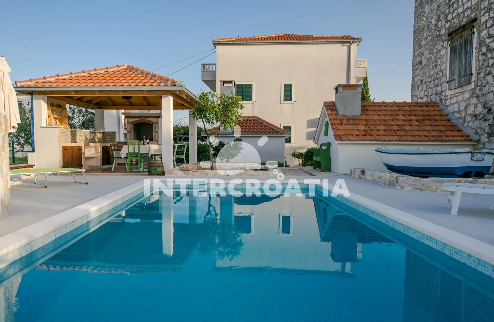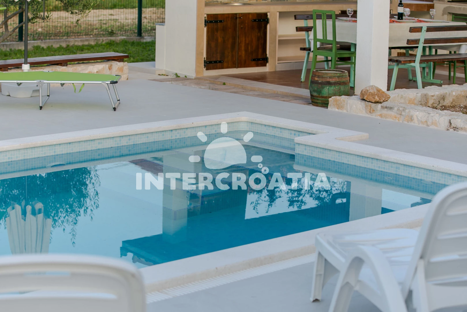 Domek se nachází 50 m od moře a pláže. Pláž je oblázková. Domek disponuje bazénem s lehátky pro ubytované hosty. U objektu je k dispozici společná zahrada s posezením a grilem. Parkování je před domem.