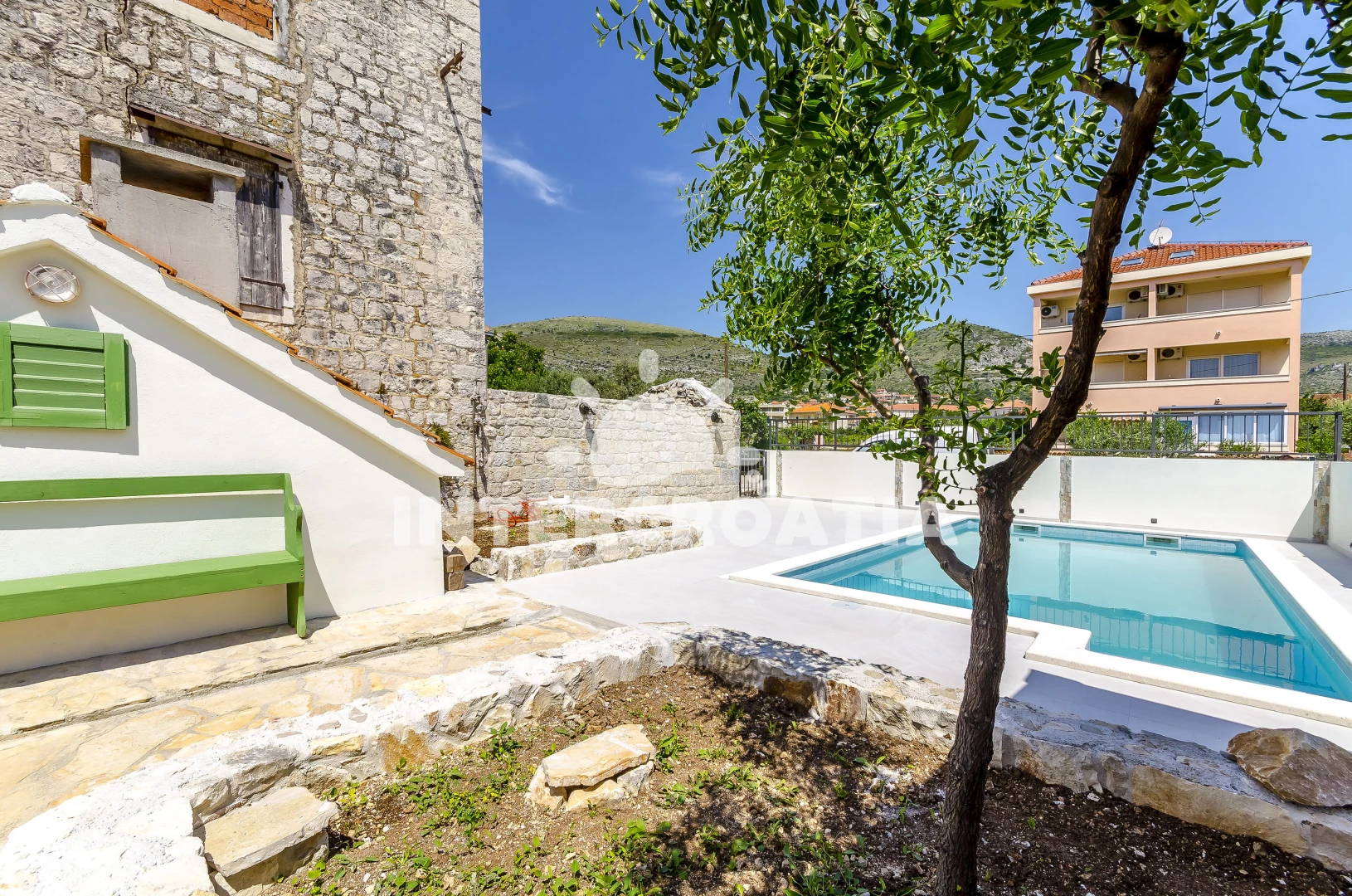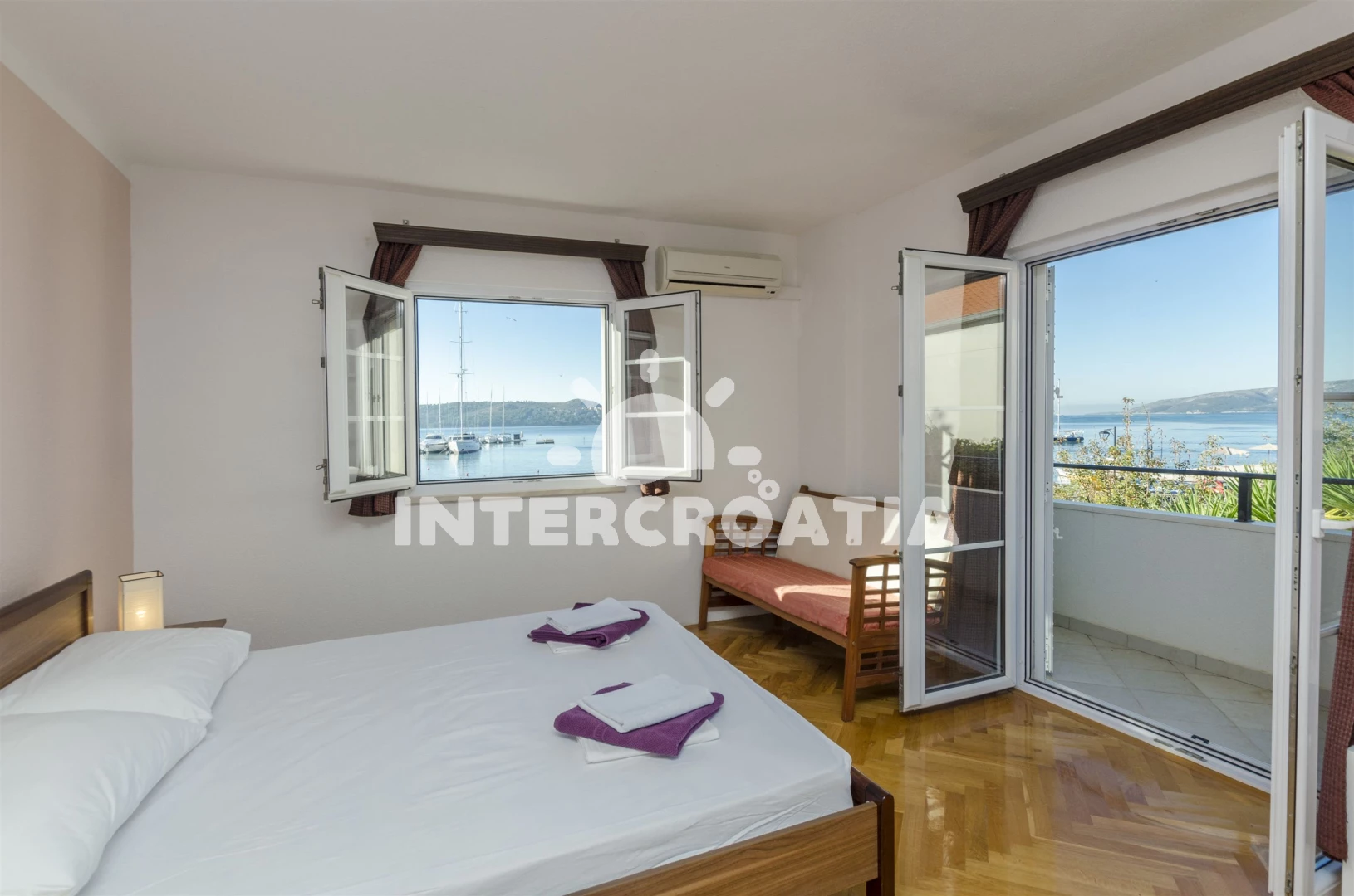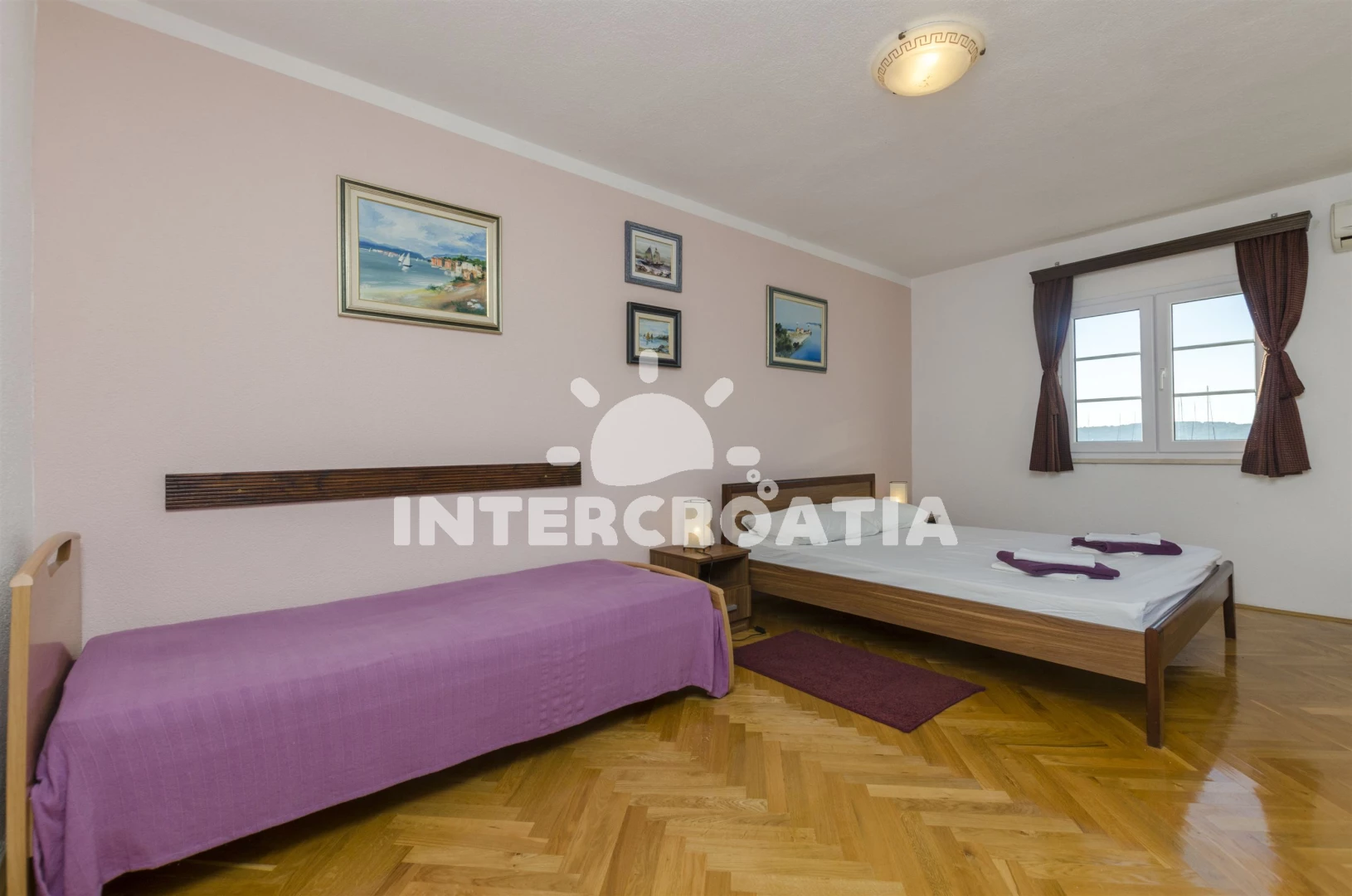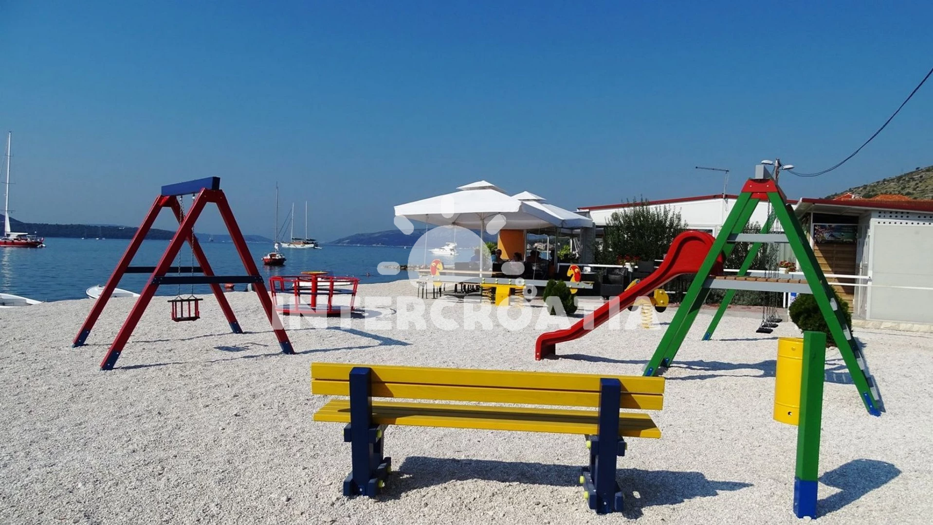 Vzdálenosti: Moře 50 m, pláž 50 m (oblázky), bar 100 m, restaurace 200 m, centrum 200 m, marina 300 m, kotviště pro čluny 300 m, lékárna 400 m, směnárna 400 m, pošta 400 m, supermarket 500 m, trajekt (Trogir) 2 km, ambulance 2 km, banka 2 km, čerpací stanice 3 km, letiště (Split) 7 km,